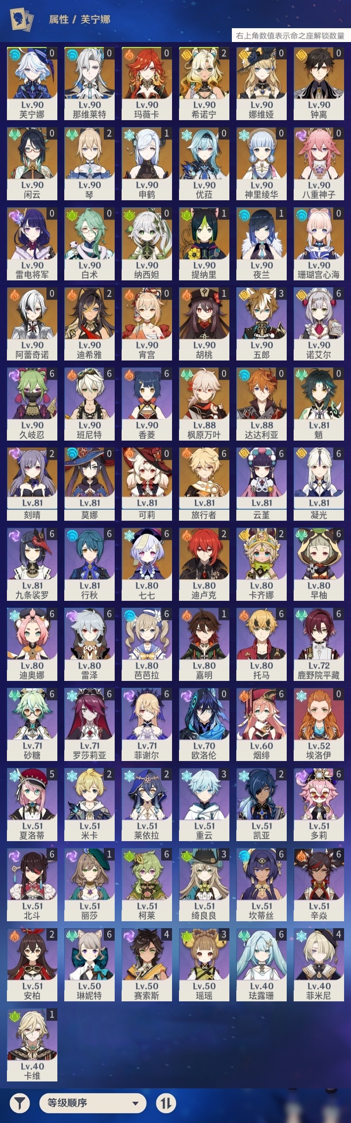 【原神】【lyys8698】冒险等级:60,五星数量:49,五星角色:七七 6命希诺宁 2命迪希雅 2命迪卢克 2命刻晴 2命琴 2命胡桃 1命申鹤 1命夜兰 1命提纳里 1命莫娜珊瑚宫心海白术神里绫华玛薇卡宵宫优菈钟离达达利亚八重神子那维莱特芙宁娜娜维娅闲云阿蕾奇诺纳西妲枫原万叶魈可莉雷电将军__五星武器:岩峰巡歌碧落之珑裁断苍古自由之誓飞雷之弦振风鹰剑护摩之杖狼的末路松籁响起之时天空之傲天空之脊天空之刃天空之翼雾切之回光薙草之稻光斫峰之刃赤角石溃杵神乐之真意__四星角色:班尼特 6命行秋 6命九条裟罗 6命香菱 6命久岐忍 6命鹿野院平藏 6命珐露珊 6命凝光 6命迪奥娜 6命砂糖 6命坎蒂丝 6命多莉 6命柯莱 6命芭芭拉 6命云堇 6命早柚 6命托马 6命烟绯 6命辛焱 6命诺艾尔 6命罗莎莉亚 6命雷泽 6命菲谢尔 6命北斗 6命琳妮特 6命夏洛蒂 5命菲米尼 4命赛索斯 4命绮良良 3命瑶瑶 3命五郎 3命重云 3命卡齐娜 2命莱依拉 2命米卡 2命卡维 1命嘉明 1命埃洛伊欧洛伦