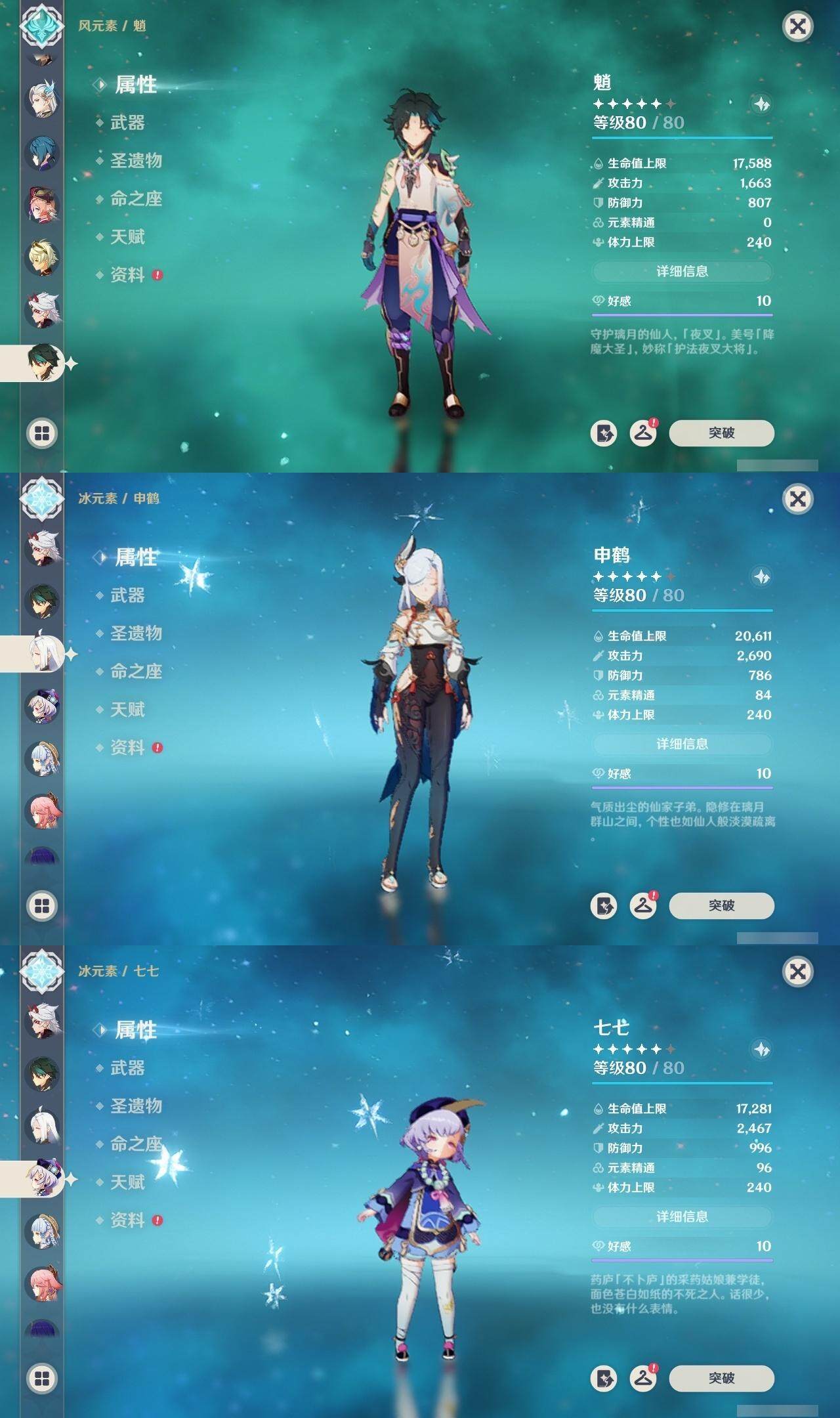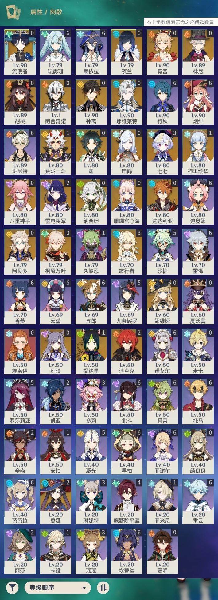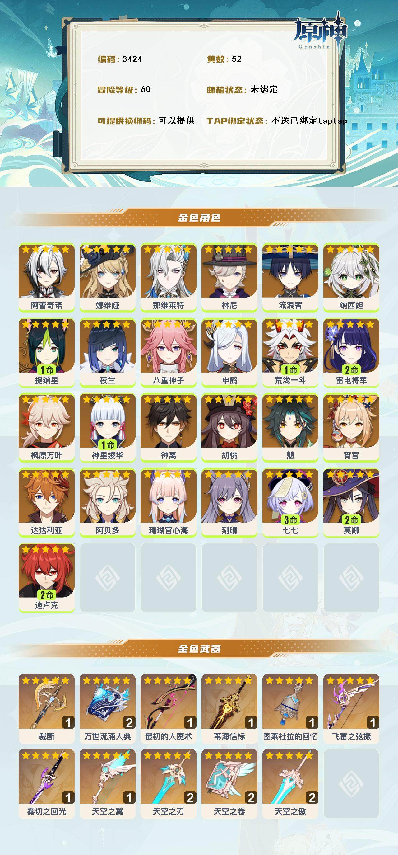60级/52黄/女主/25个五星角色/11个五星武器 0命阿蕾奇诺0命娜维娅0命那维莱特0命林尼0命流浪者0命纳西妲1命提纳里0命夜兰0命八重神子0命申鹤1命荒泷一斗2命雷电将军0命枫原万叶1命神里绫华0命钟离0命胡桃0命魈0命宵宫0命达达利亚0命阿贝多0命珊瑚宫心海0命刻晴3命七七2命莫娜2命迪卢克精1裁断精2万世流涌大典精1最初的大魔术精1苇海信标精1图莱杜拉的回忆精1飞雷之弦振精1雾切之回光精1天空之翼精2天空之刃精2天空之卷精2天空之傲