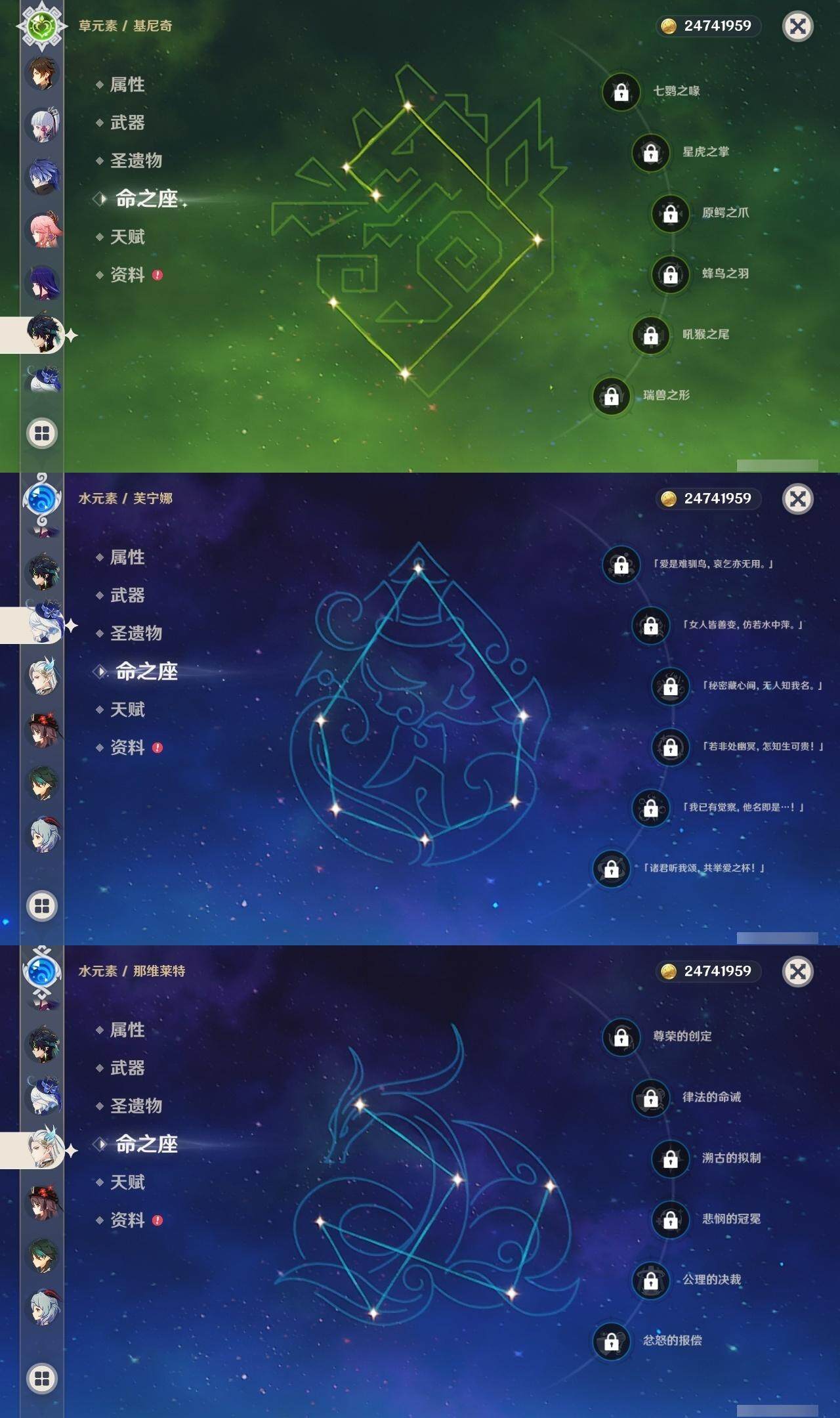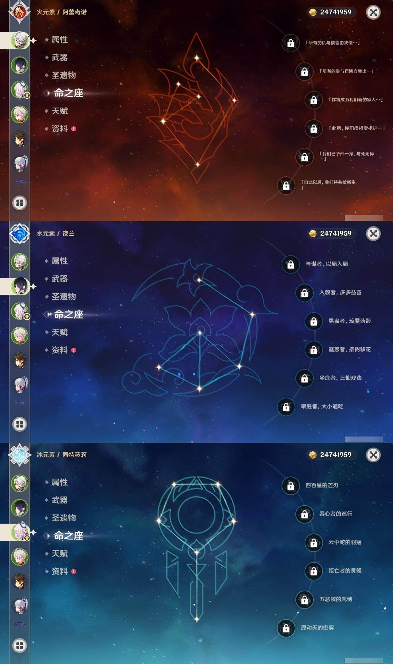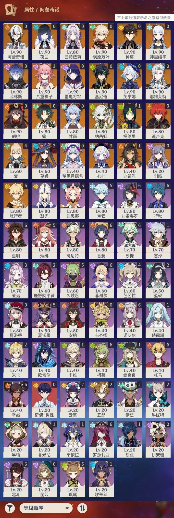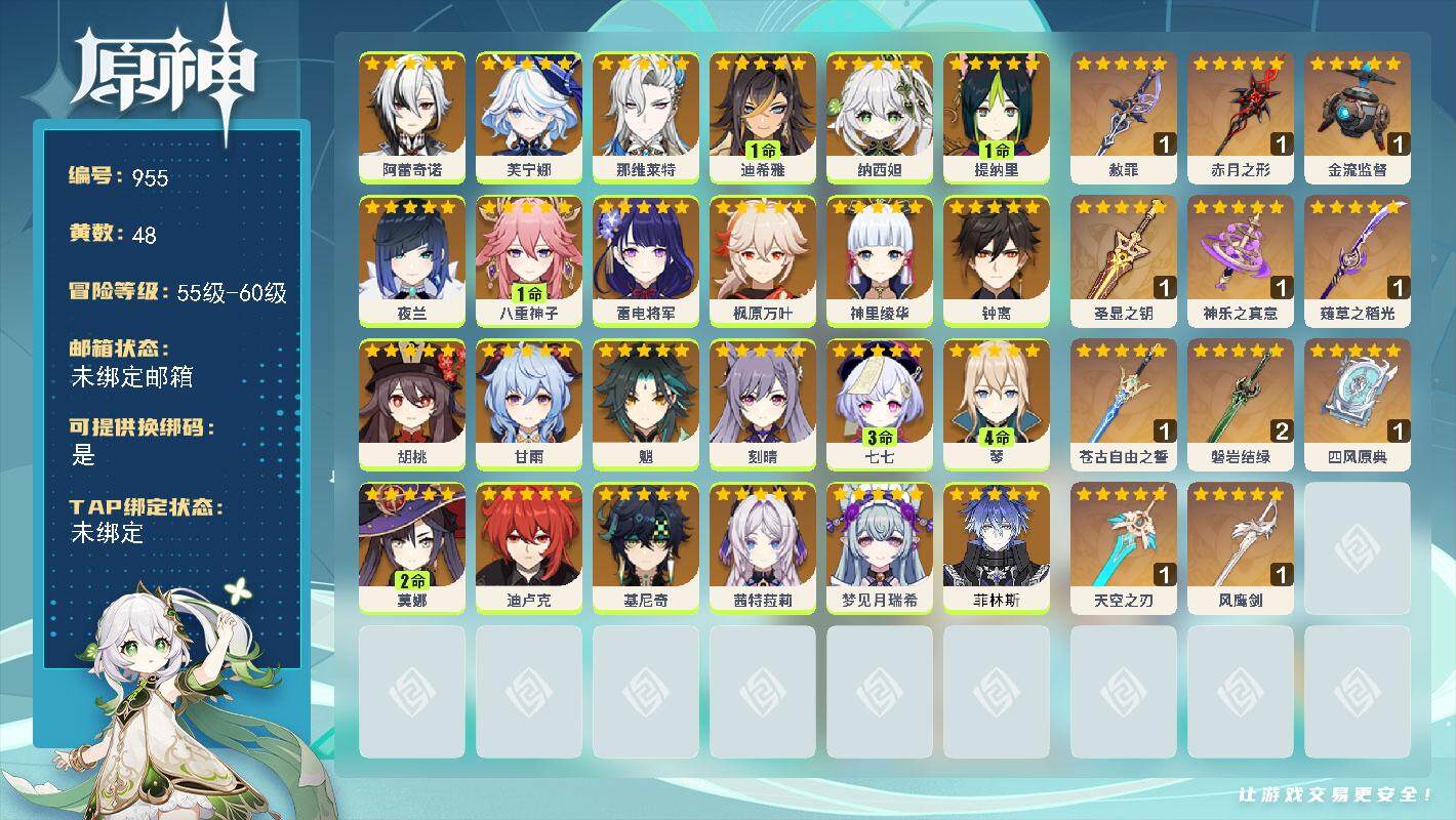 [14304459]59级/48黄/男主/24个五星角色/11个五星武器 0命阿蕾奇诺0命芙宁娜0命那维莱特1命迪希雅0命纳西妲1命提纳里0命夜兰1命八重神子0命雷电将军0命枫原万叶0命神里绫华0命钟离0命胡桃0命甘雨0命魈0命刻晴3命七七4命琴2命莫娜0命迪卢克0命基尼奇0命茜特菈莉0命梦见月瑞希0命菲林斯精1赦罪精1赤月之形精1金流监督精1圣显之钥精1神乐之真意精1薙草之稻光精1苍古自由之誓精2磐岩结绿精1四风原典精1天空之刃精1风鹰剑