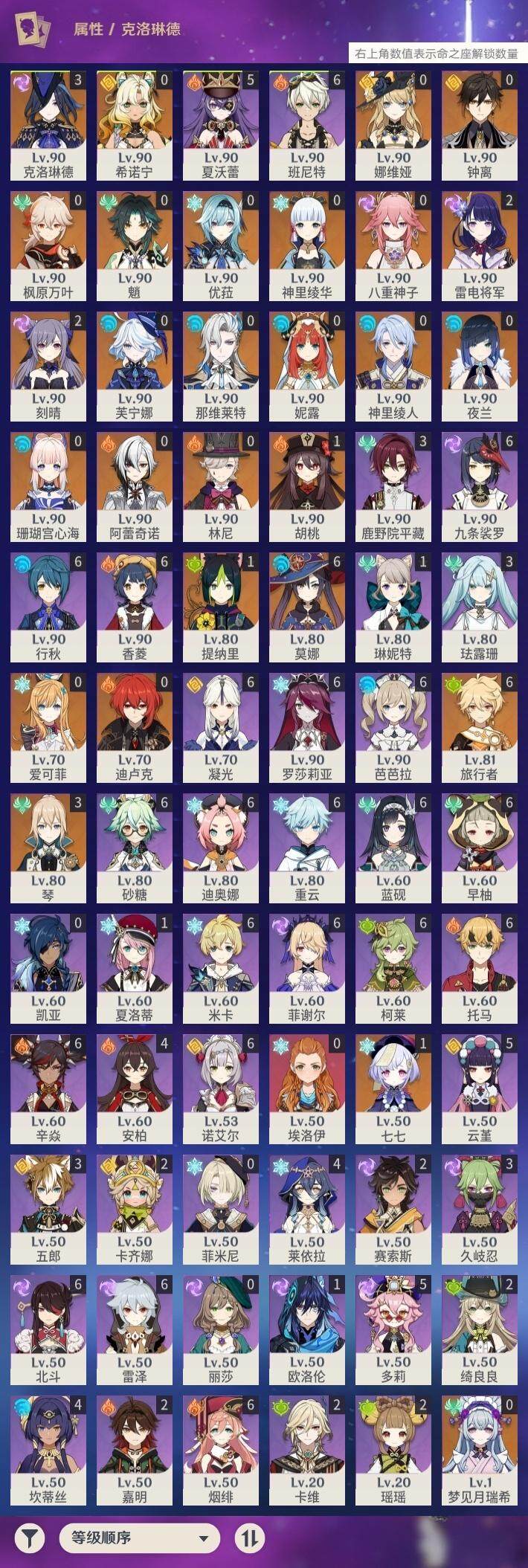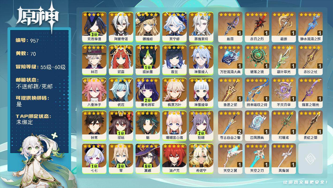 [14304731]60级/70黄/男主/27个五星角色/23个五星武器 3命克洛琳德0命阿蕾奇诺0命娜维娅0命芙宁娜0命那维莱特0命林尼0命妮露1命提纳里0命夜兰0命神里绫人0命八重神子0命优菈2命雷电将军0命枫原万叶0命神里绫华0命钟离1命胡桃0命魈0命珊瑚宫心海2命刻晴1命七七3命琴满命莫娜0命迪卢克0命希诺宁0命梦见月瑞希0命爱可菲精1赦罪精1赤月之形精1裁断精1静水流涌之辉精1万世流涌大典精1碧落之珑精1裁叶萃光精1赤沙之杖精1圣显之钥精1终末嗟叹之诗精1不灭月华精1薙草之稻光精2苍古自由之誓精1四风原典精1和璞鸢精1贯虹之槊精1天空之翼精1天空之刃精1风鹰剑