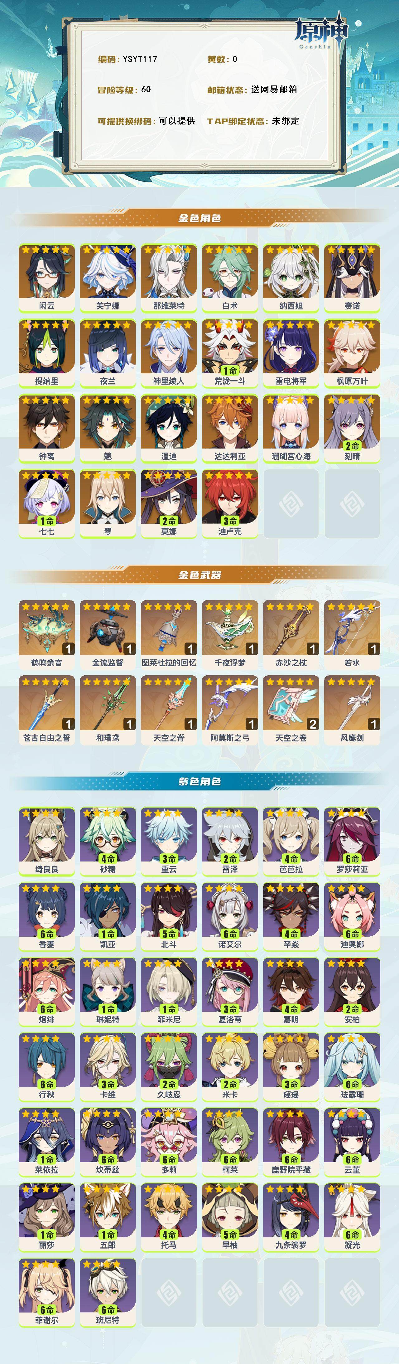 【ysyt117】60级/女主/23个五星角色/0命闲云/0命芙宁娜/0命那维莱特/0命白术/0命纳西妲/0命赛诺/0命提纳里/0命夜兰/0命神里绫人/1命荒泷一斗/0命珊瑚宫心海/0命雷电将军/0命枫原万叶/0命魈/0命钟离/0命达达利亚/0命温迪/0命琴/2命刻晴/3命迪卢克/2命莫娜/1命七七/精1鹤鸣余音/精1金流监督/精1图莱杜拉的回忆/精1千夜浮梦/精1赤沙之杖/精1若水/精1苍古自由之誓/精1和璞鸢/精2天空之卷/精1阿莫斯之弓/精1风鹰剑/精1天空之脊/4命嘉明/3命夏洛蒂/0命菲米尼/0命琳妮特/0命绮良良/3命卡维/2命米卡/3命瑶瑶/满命珐露珊/1命莱依拉/满命坎蒂丝/满命多莉/满命柯莱/满命鹿野院平藏/2命久岐忍/满命云堇/1命五郎/4命托马/4命九条裟罗/5命早柚/满命烟绯/满命罗莎莉亚/4命辛焱/满命迪奥娜/4命砂糖/2命雷泽/满命菲谢尔/1命丽莎/5命北斗/满命香菱/2命安柏/满命班尼特/满命行秋/4命芭芭拉/满命凝光/满命诺艾尔/0命凯亚/3命重云