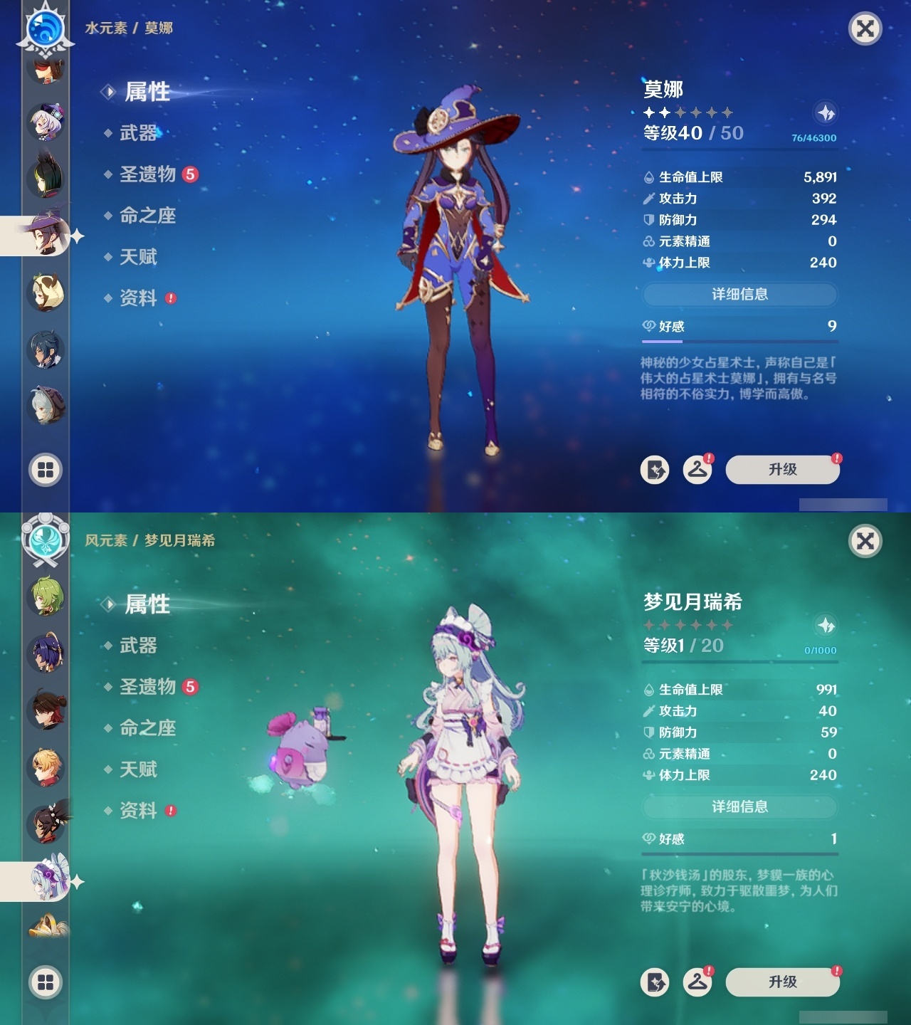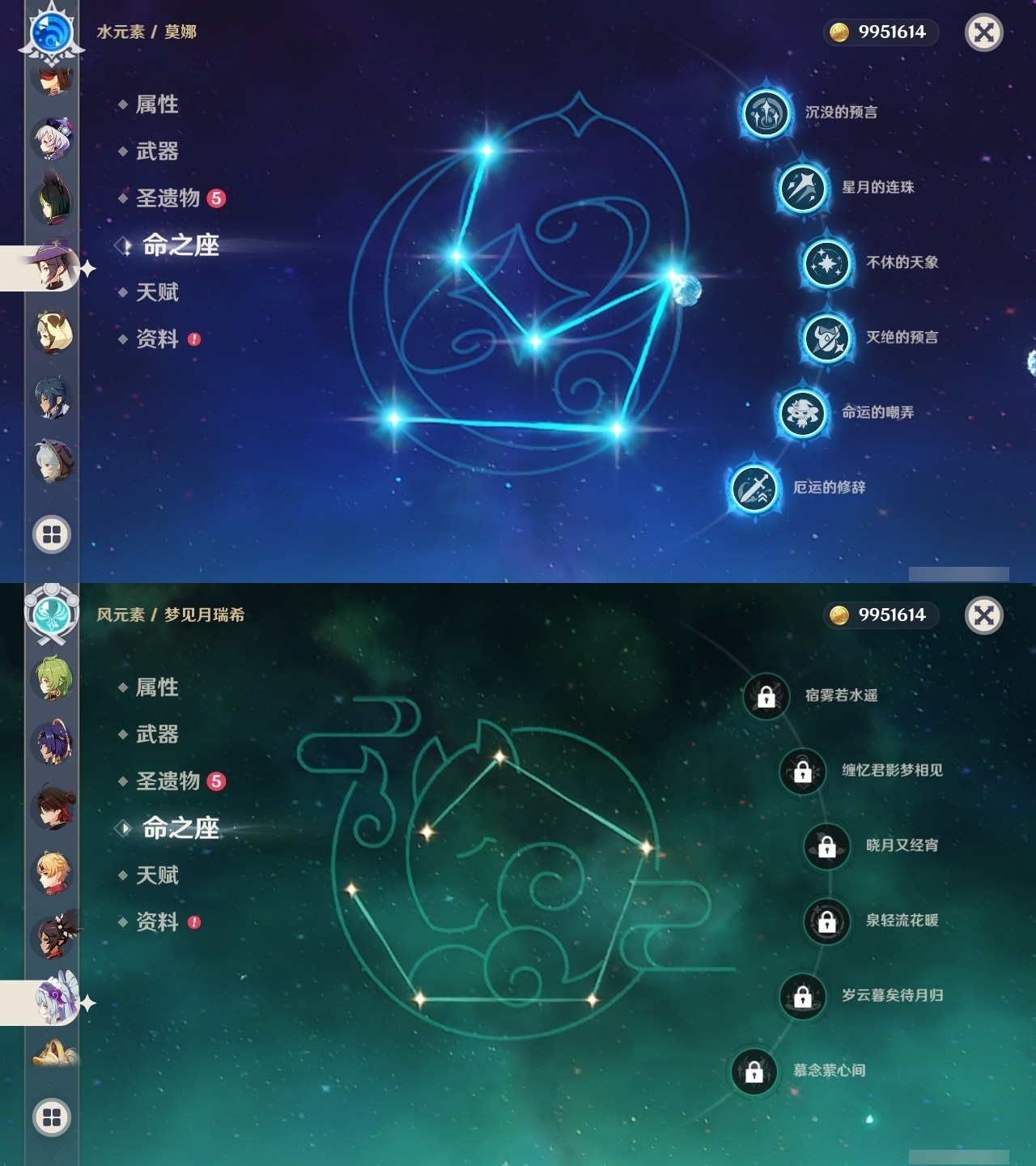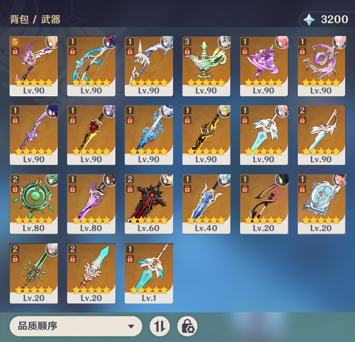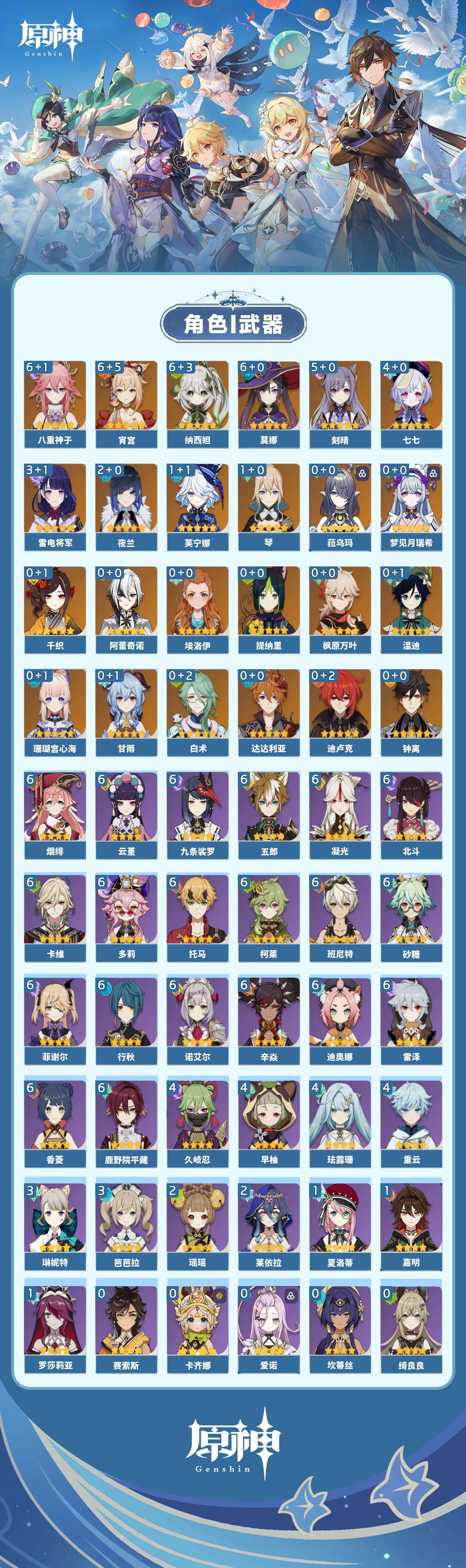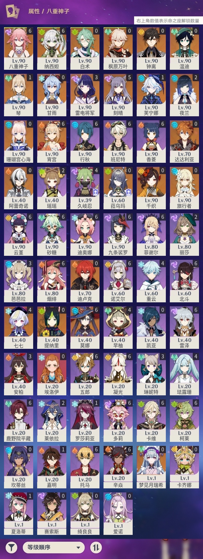 【原神】满命,冒险等级:59,五星数量:44,五星角色:莫娜 6命宵宫 6命八重神子 6命纳西妲 6命刻晴 5命七七 4命雷电将军 3命夜兰 2命芙宁娜 1命琴 1命珊瑚宫心海白术温迪钟离达达利亚梦见月瑞希提纳里千织阿蕾奇诺菈乌玛迪卢克枫原万叶甘雨__五星武器:飞雷之弦振 5精千夜浮梦 3精碧落之珑 2精风鹰剑 2精和璞鸢 2精狼的末路 2精天空之脊 2精最初的大魔术静水流涌之辉有乐御簾切阿莫斯之弓不灭月华四风原典松籁响起之时天空之刃雾切之回光薙草之稻光终末嗟叹之诗斫峰之刃神乐之真意__四星角色:班尼特 6命行秋 6命九条裟罗 6命香菱 6命鹿野院平藏 6命凝光 6命迪奥娜 6命砂糖 6命多莉 6命柯莱 6命卡维 6命云堇 6命托马 6命五郎 6命烟绯 6命辛焱 6命诺艾尔 6命雷泽 6命菲谢尔 6命北斗 6命久岐忍 4命珐露珊 4命早柚 4命重云 4命芭芭拉 3命琳妮特 3命瑶瑶 2命莱依拉 2命罗莎莉亚 1命夏洛蒂 1命嘉明 1命埃洛伊卡齐娜绮良良坎蒂丝爱诺赛索斯
