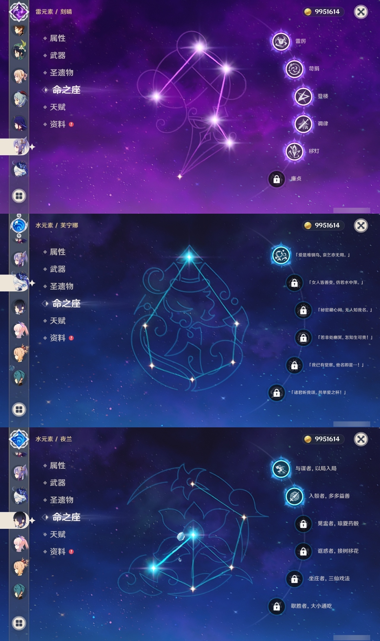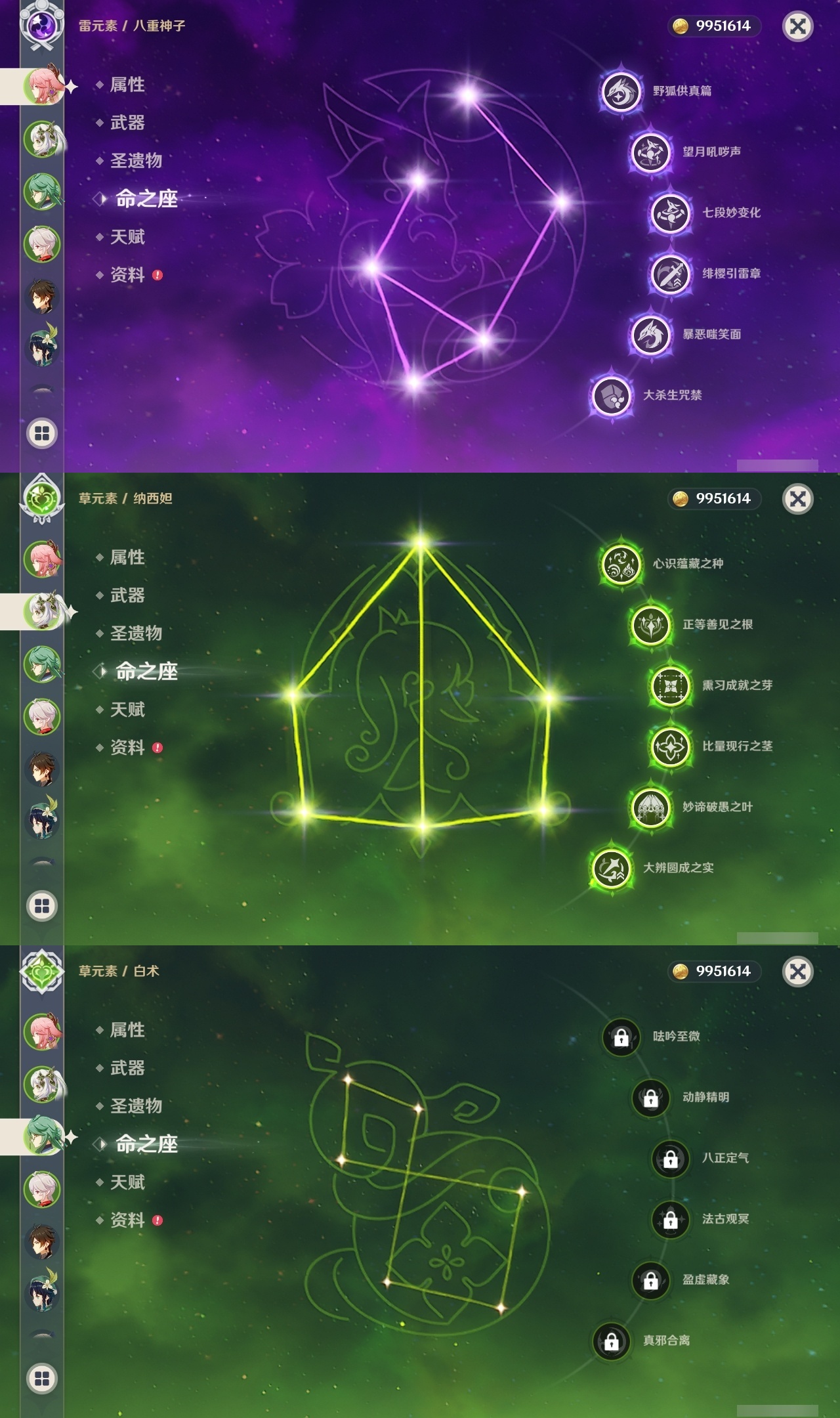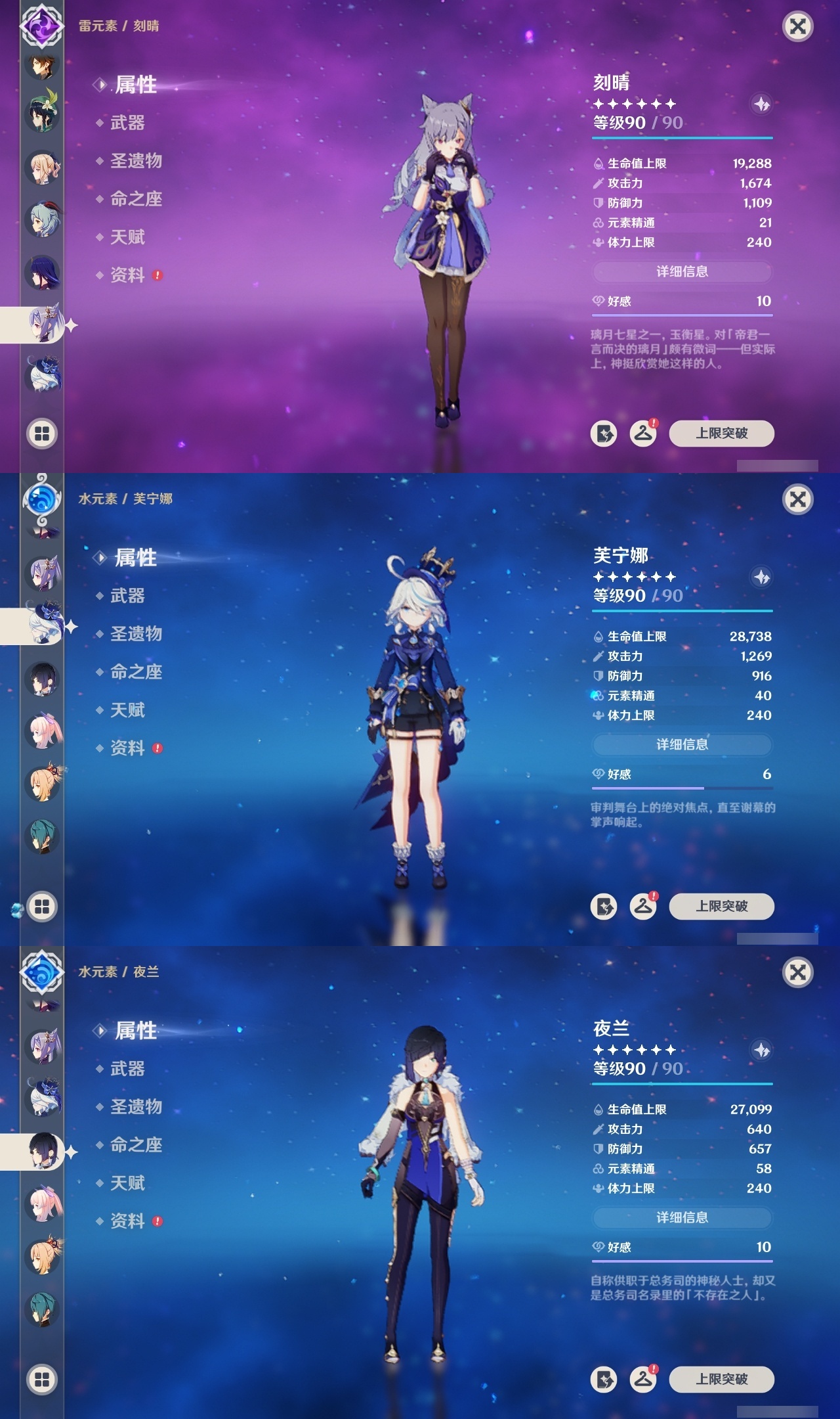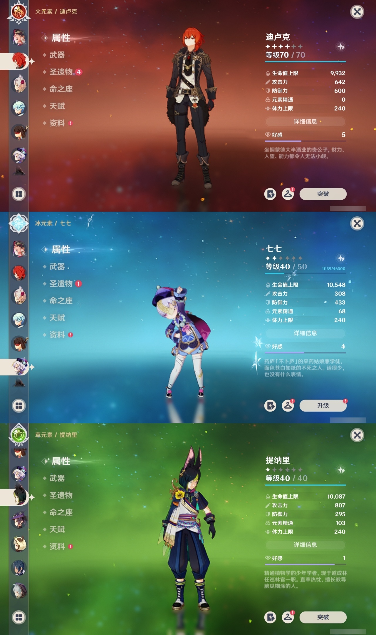 【原神】满命,冒险等级:59,五星数量:44,五星角色:莫娜 6命宵宫 6命八重神子 6命纳西妲 6命刻晴 5命七七 4命雷电将军 3命夜兰 2命芙宁娜 1命琴 1命珊瑚宫心海白术温迪钟离达达利亚梦见月瑞希提纳里千织阿蕾奇诺菈乌玛迪卢克枫原万叶甘雨__五星武器:飞雷之弦振 5精千夜浮梦 3精碧落之珑 2精风鹰剑 2精和璞鸢 2精狼的末路 2精天空之脊 2精最初的大魔术静水流涌之辉有乐御簾切阿莫斯之弓不灭月华四风原典松籁响起之时天空之刃雾切之回光薙草之稻光终末嗟叹之诗斫峰之刃神乐之真意__四星角色:班尼特 6命行秋 6命九条裟罗 6命香菱 6命鹿野院平藏 6命凝光 6命迪奥娜 6命砂糖 6命多莉 6命柯莱 6命卡维 6命云堇 6命托马 6命五郎 6命烟绯 6命辛焱 6命诺艾尔 6命雷泽 6命菲谢尔 6命北斗 6命久岐忍 4命珐露珊 4命早柚 4命重云 4命芭芭拉 3命琳妮特 3命瑶瑶 2命莱依拉 2命罗莎莉亚 1命夏洛蒂 1命嘉明 1命埃洛伊卡齐娜绮良良坎蒂丝爱诺赛索斯