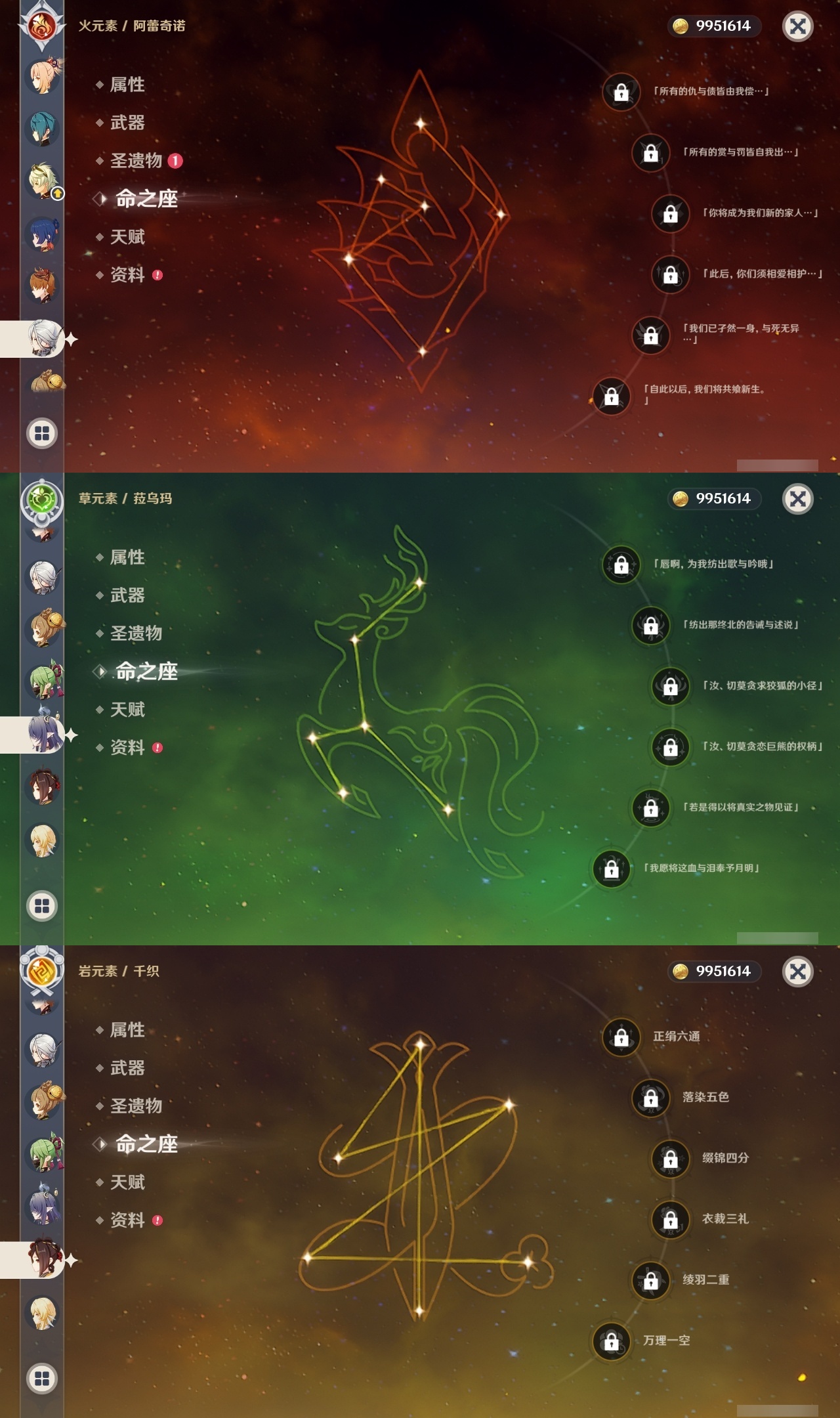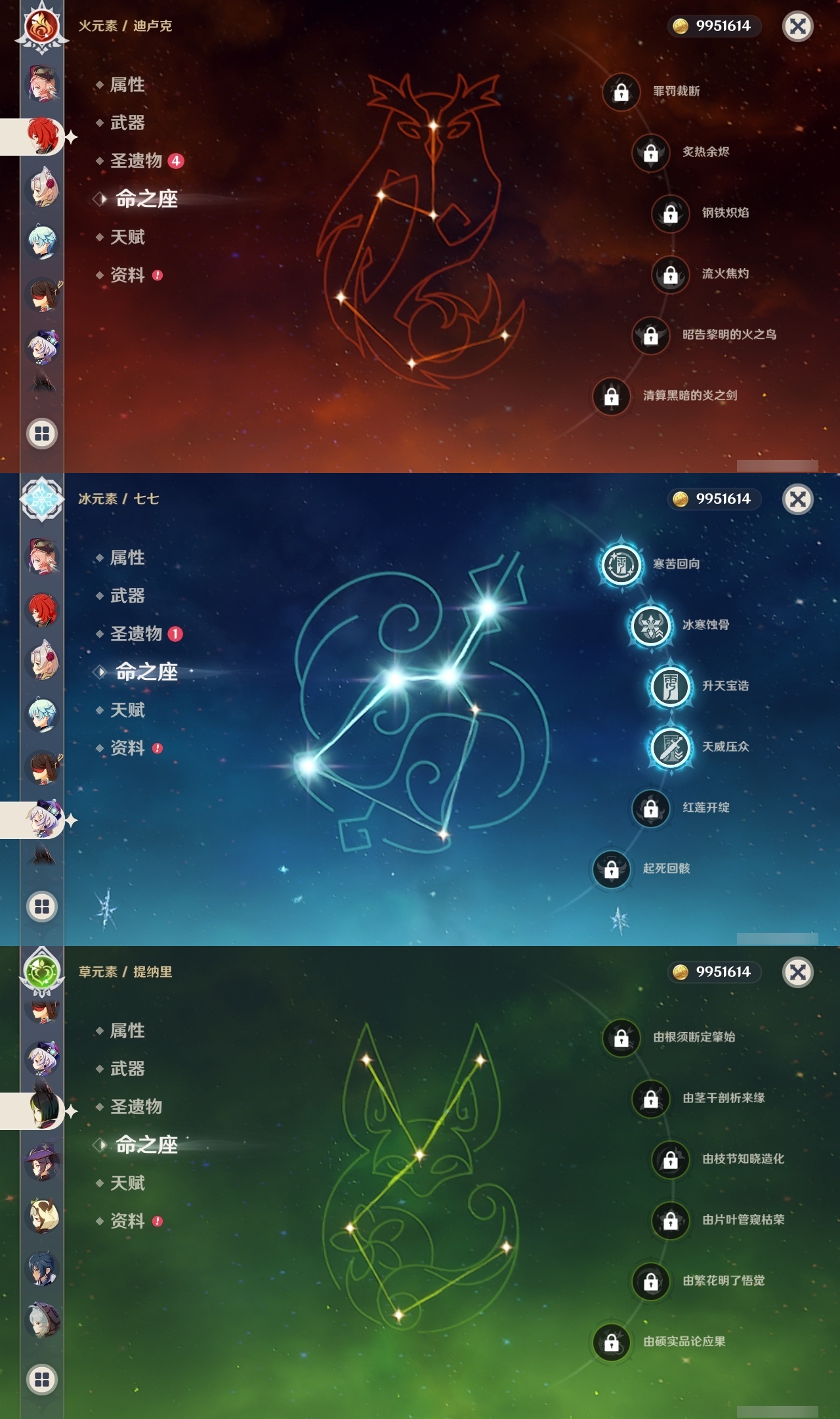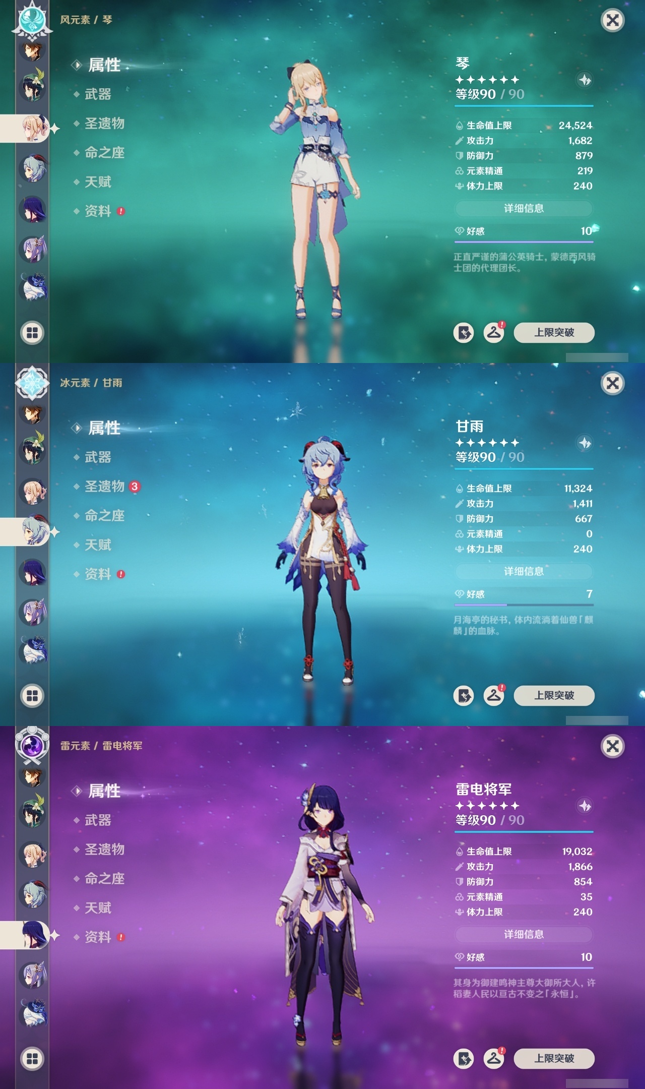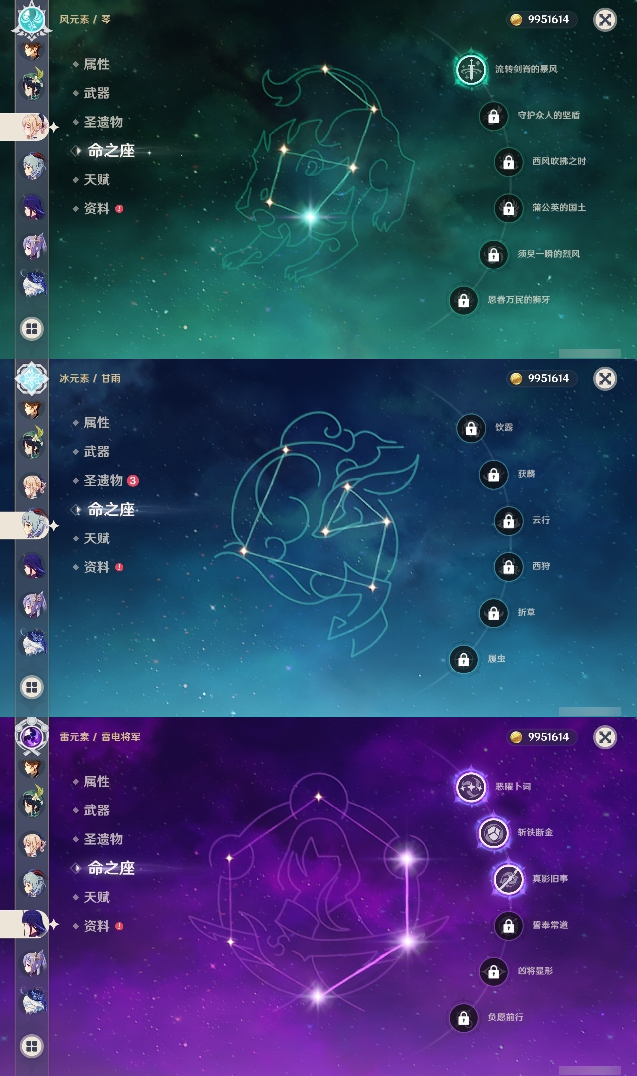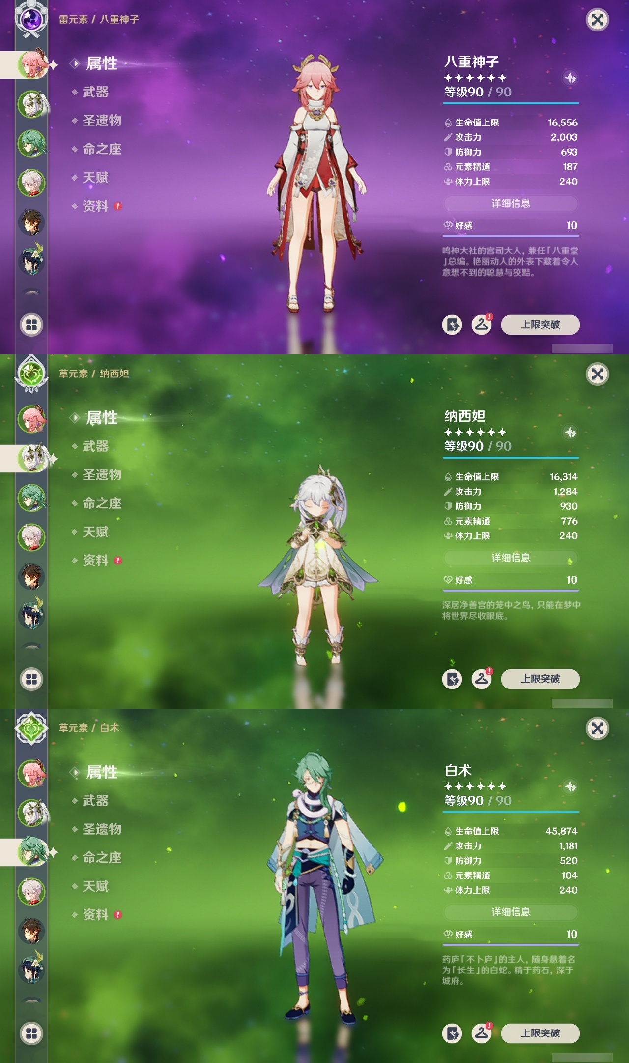 【原神】满命,冒险等级:59,五星数量:44,五星角色:莫娜 6命宵宫 6命八重神子 6命纳西妲 6命刻晴 5命七七 4命雷电将军 3命夜兰 2命芙宁娜 1命琴 1命珊瑚宫心海白术温迪钟离达达利亚梦见月瑞希提纳里千织阿蕾奇诺菈乌玛迪卢克枫原万叶甘雨__五星武器:飞雷之弦振 5精千夜浮梦 3精碧落之珑 2精风鹰剑 2精和璞鸢 2精狼的末路 2精天空之脊 2精最初的大魔术静水流涌之辉有乐御簾切阿莫斯之弓不灭月华四风原典松籁响起之时天空之刃雾切之回光薙草之稻光终末嗟叹之诗斫峰之刃神乐之真意__四星角色:班尼特 6命行秋 6命九条裟罗 6命香菱 6命鹿野院平藏 6命凝光 6命迪奥娜 6命砂糖 6命多莉 6命柯莱 6命卡维 6命云堇 6命托马 6命五郎 6命烟绯 6命辛焱 6命诺艾尔 6命雷泽 6命菲谢尔 6命北斗 6命久岐忍 4命珐露珊 4命早柚 4命重云 4命芭芭拉 3命琳妮特 3命瑶瑶 2命莱依拉 2命罗莎莉亚 1命夏洛蒂 1命嘉明 1命埃洛伊卡齐娜绮良良坎蒂丝爱诺赛索斯
