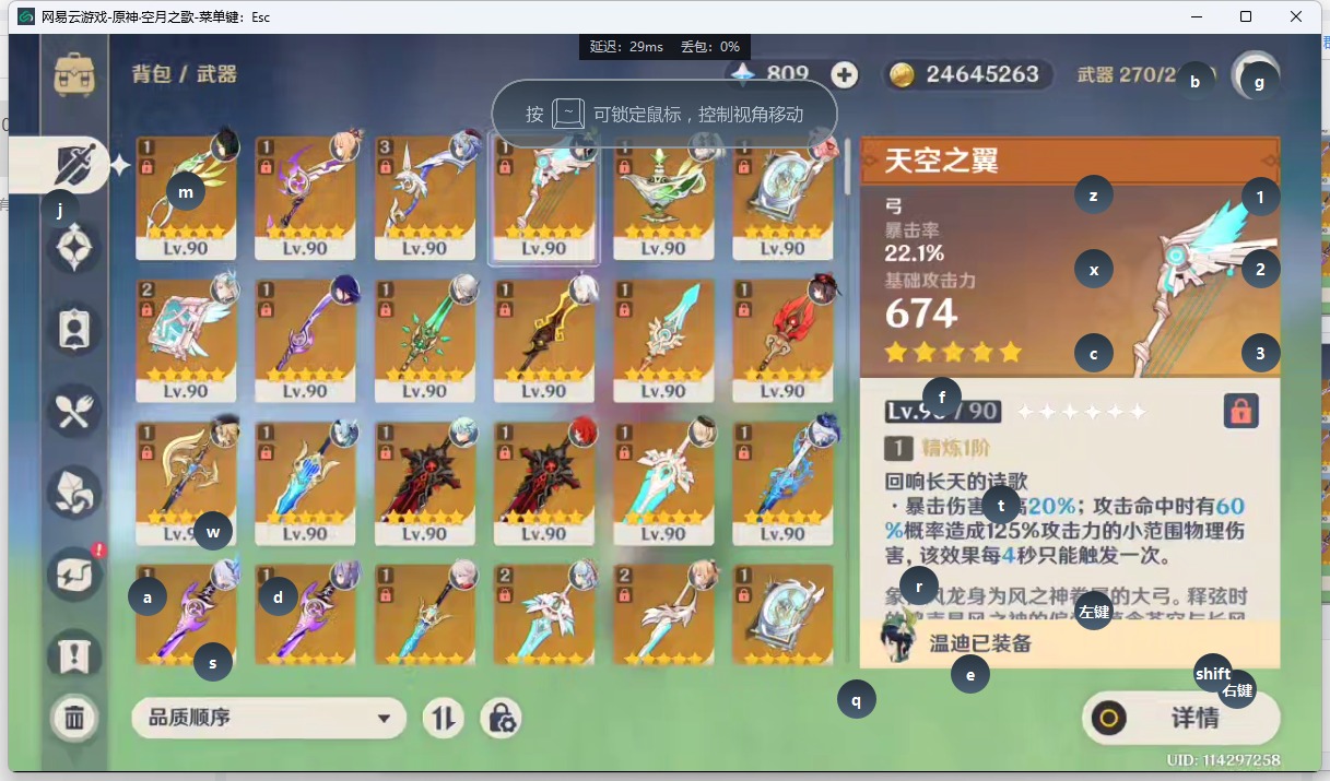 [14318540]【总黄数】:52 【冒险等级】:60 【6命金色角色】:满命莫娜 【4命金色角色】:四命七七 【3命金色角色】:三命迪卢克 【2命金色角色】:二命雷电将军二命刻晴二命琴 【1命金色角色】:一命希诺宁一命阿蕾奇诺一命闲云一命芙宁娜一命那维莱特一命钟离 【0命金色角色】:丝柯克瓦雷莎梦见月瑞希克洛琳德千织娜维娅纳西妲夜兰申鹤宵宫神里绫华枫原万叶优菈胡桃甘雨可莉温迪迪希雅提纳里 【3精武器】:阿莫斯之弓 【2精武器】:天空之卷天空之刃 【1精武器】:裁断静水流涌之辉千夜浮梦薙草之稻光飞雷之弦振雾切之回光苍古自由之誓松籁响起之时护摩之杖和璞鸢贯虹之槊猎人之径狼的末路天空之傲天空之脊天空之翼四风原典
