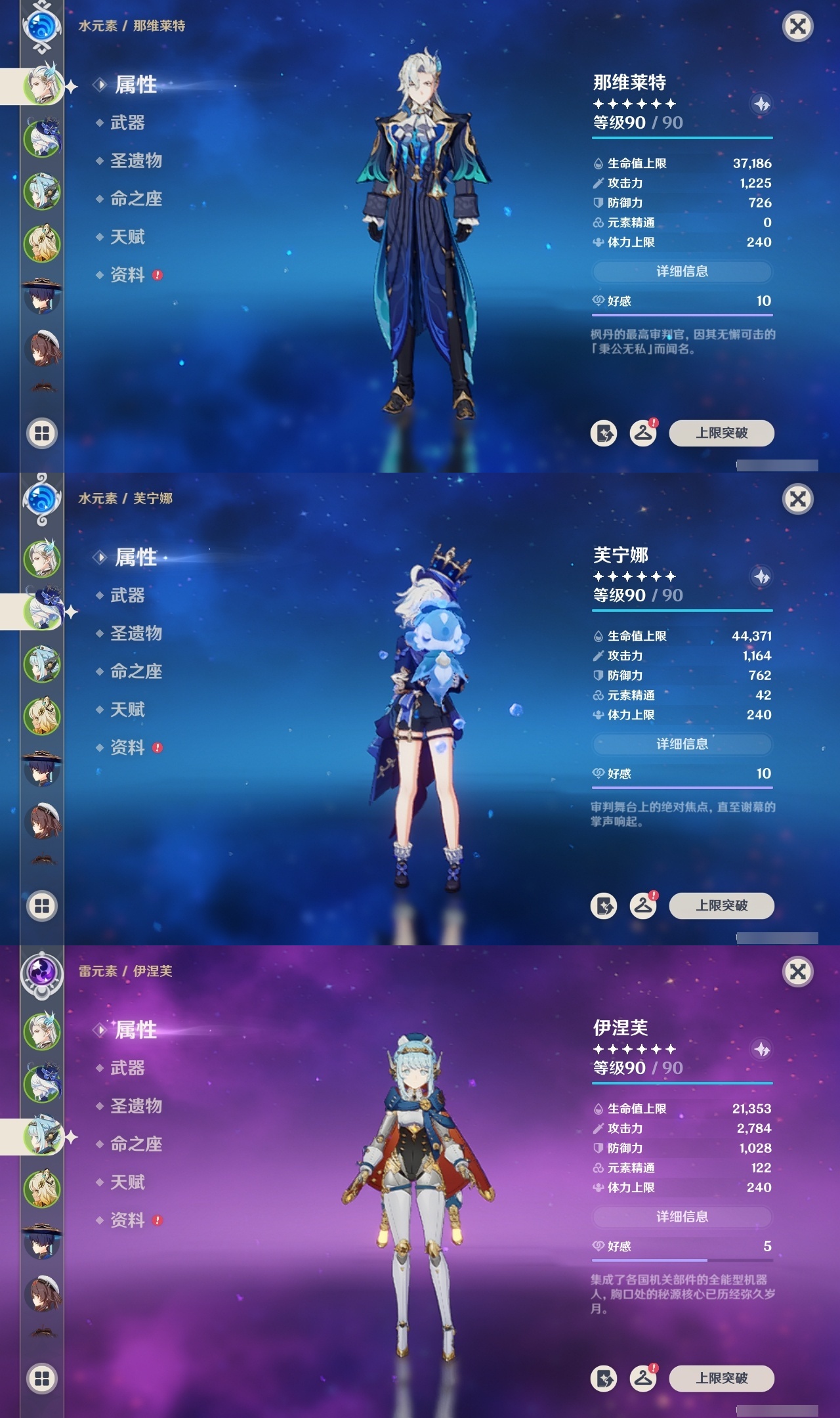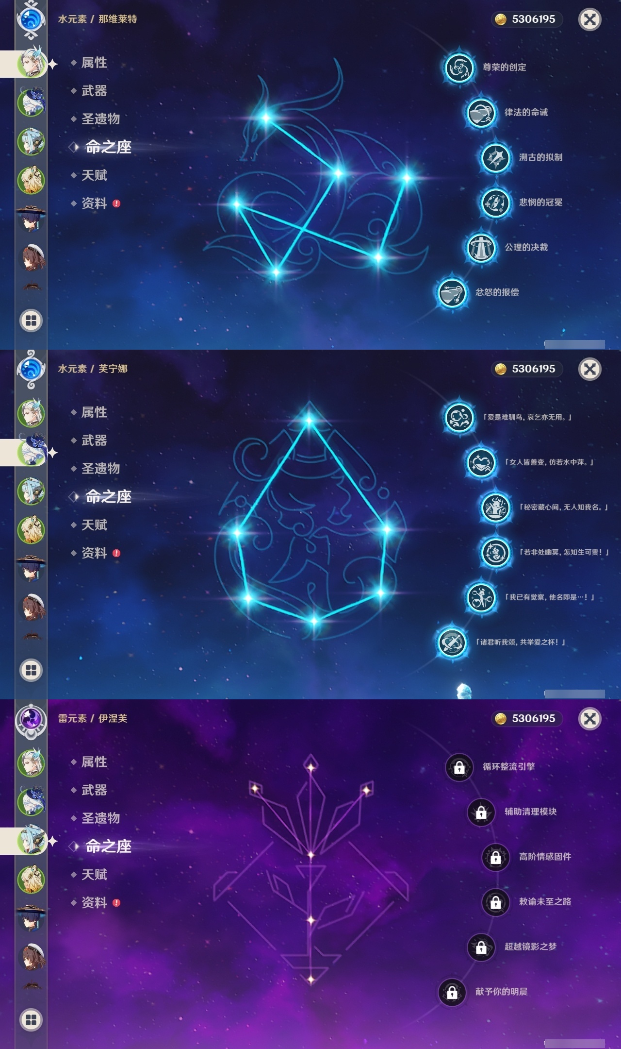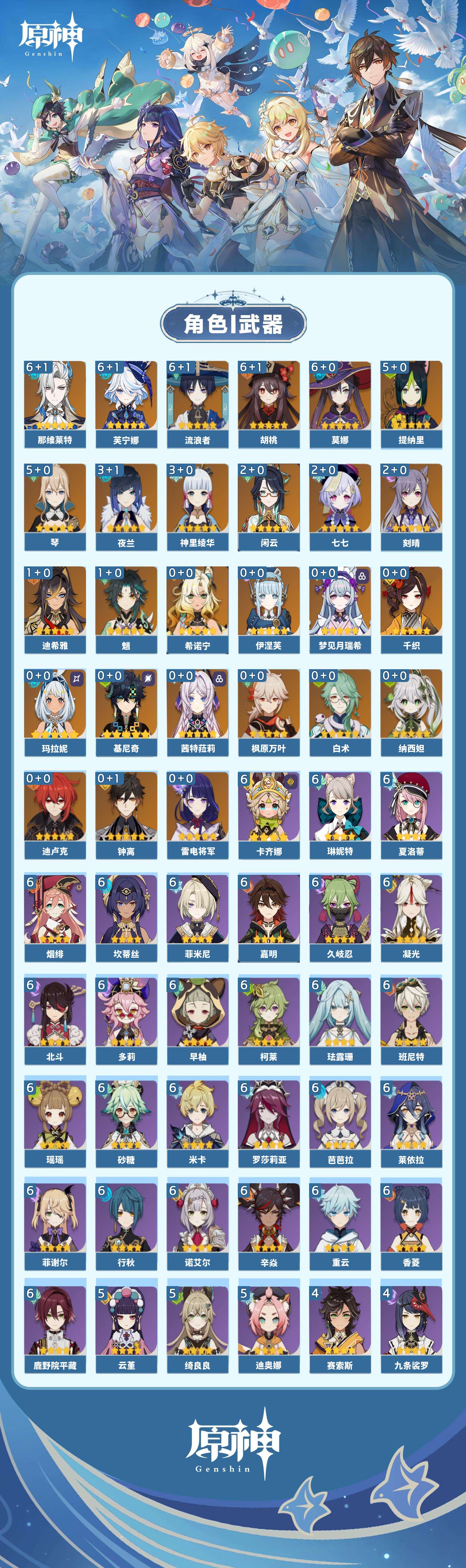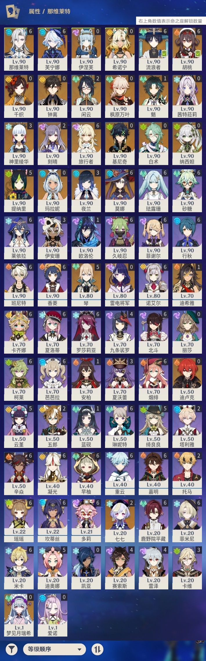 【原神】满命,冒险等级:60,五星数量:34,五星角色:那维莱特 6命芙宁娜 6命胡桃 6命莫娜 6命流浪者 6命琴 5命提纳里 5命神里绫华 3命夜兰 3命闲云 2命刻晴 2命七七 2命迪希雅 1命魈 1命玛拉妮基尼奇希诺宁白术茜特菈莉钟离梦见月瑞希千织伊涅芙纳西妲迪卢克枫原万叶雷电将军__五星武器:万世流涌大典静水流涌之辉图莱杜拉的回忆护摩之杖四风原典贯虹之槊若水__四星角色:卡齐娜 6命班尼特 6命行秋 6命香菱 6命久岐忍 6命鹿野院平藏 6命珐露珊 6命凝光 6命砂糖 6命瑶瑶 6命莱依拉 6命米卡 6命坎蒂丝 6命多莉 6命柯莱 6命芭芭拉 6命早柚 6命烟绯 6命重云 6命辛焱 6命诺艾尔 6命罗莎莉亚 6命菲谢尔 6命北斗 6命菲米尼 6命琳妮特 6命夏洛蒂 6命嘉明 6命迪奥娜 5命绮良良 5命云堇 5命九条裟罗 4命雷泽 4命赛索斯 4命卡维 3命夏沃蕾 3命伊安珊 3命托马 2命五郎 2命塔利雅 2命欧洛伦 1命蓝砚 1命爱诺100抽 100抽
