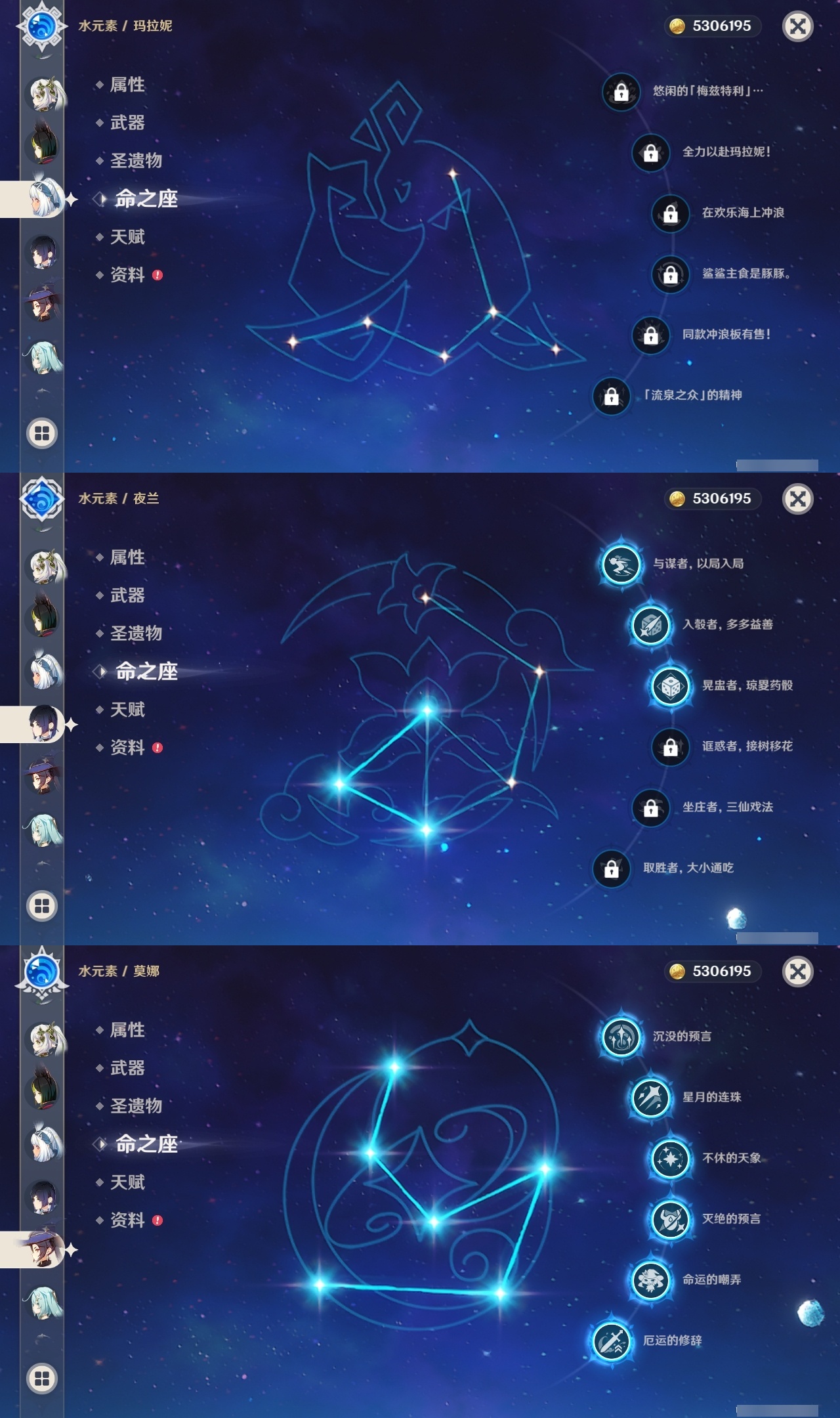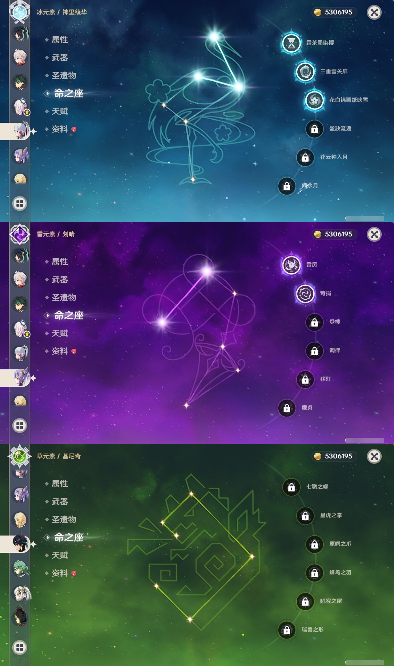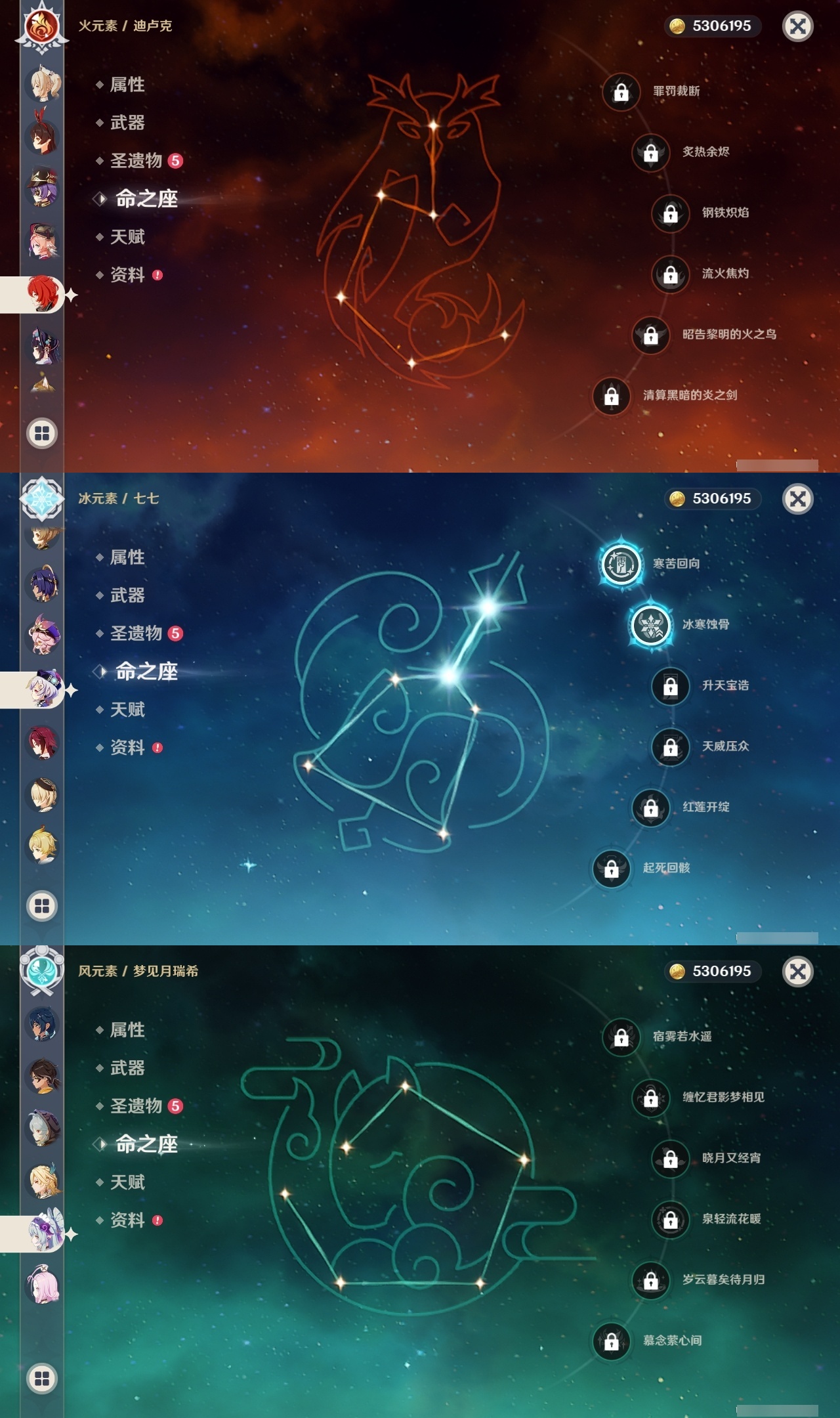 【原神】满命,冒险等级:60,五星数量:34,五星角色:那维莱特 6命芙宁娜 6命胡桃 6命莫娜 6命流浪者 6命琴 5命提纳里 5命神里绫华 3命夜兰 3命闲云 2命刻晴 2命七七 2命迪希雅 1命魈 1命玛拉妮基尼奇希诺宁白术茜特菈莉钟离梦见月瑞希千织伊涅芙纳西妲迪卢克枫原万叶雷电将军__五星武器:万世流涌大典静水流涌之辉图莱杜拉的回忆护摩之杖四风原典贯虹之槊若水__四星角色:卡齐娜 6命班尼特 6命行秋 6命香菱 6命久岐忍 6命鹿野院平藏 6命珐露珊 6命凝光 6命砂糖 6命瑶瑶 6命莱依拉 6命米卡 6命坎蒂丝 6命多莉 6命柯莱 6命芭芭拉 6命早柚 6命烟绯 6命重云 6命辛焱 6命诺艾尔 6命罗莎莉亚 6命菲谢尔 6命北斗 6命菲米尼 6命琳妮特 6命夏洛蒂 6命嘉明 6命迪奥娜 5命绮良良 5命云堇 5命九条裟罗 4命雷泽 4命赛索斯 4命卡维 3命夏沃蕾 3命伊安珊 3命托马 2命五郎 2命塔利雅 2命欧洛伦 1命蓝砚 1命爱诺100抽 100抽