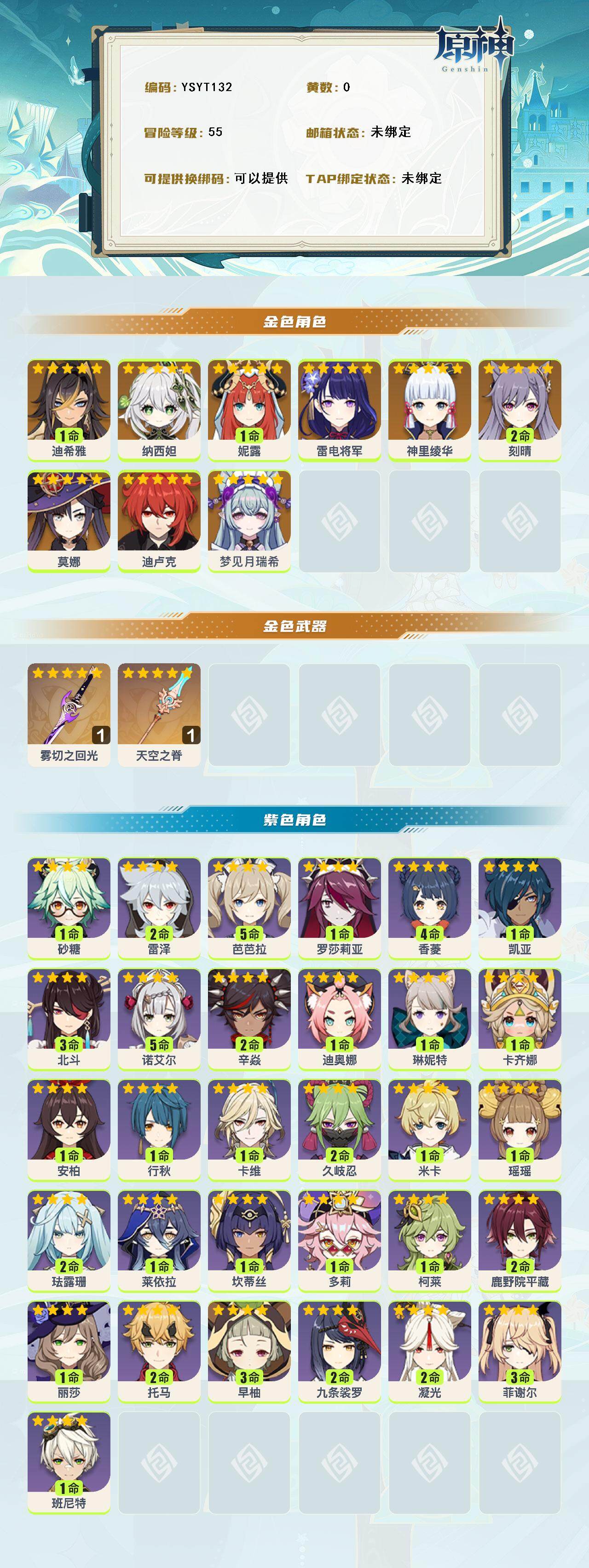 【ysyt132】55级/女主/10个五星角色/0命梦见月瑞希/1命迪希雅/0命纳西妲/1命妮露/0命雷电将军/0命神里绫华/2命刻晴/0命迪卢克/0命莫娜/精1雾切之回光/精1天空之脊/0命卡齐娜/0命琳妮特/0命卡维/1命米卡/0命瑶瑶/2命珐露珊/1命莱依拉/0命坎蒂丝/1命多莉/0命柯莱/2命鹿野院平藏/2命久岐忍/2命托马/2命九条裟罗/3命早柚/0命罗莎莉亚/2命辛焱/1命迪奥娜/1命砂糖/2命雷泽/3命菲谢尔/0命丽莎/3命北斗/4命香菱/1命安柏/1命班尼特/0命行秋/5命芭芭拉/2命凝光/5命诺艾尔/0命凯亚