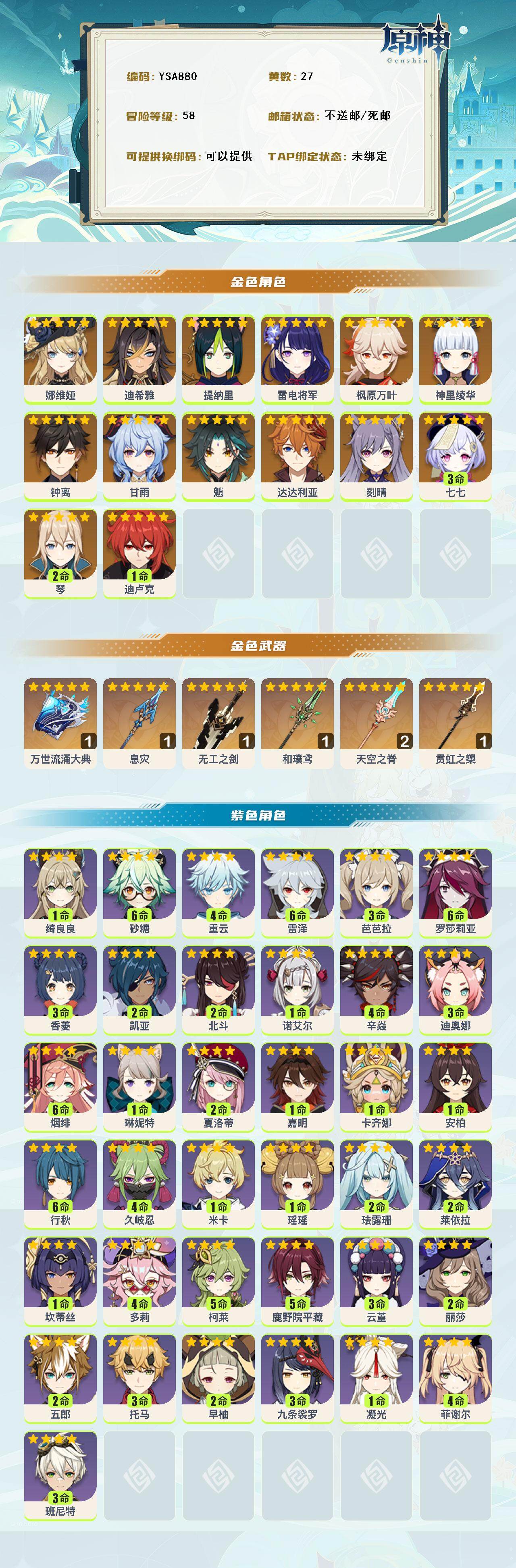 【ysa880】58级/27黄/女主/15个五星角色/7个五星武器/0命娜维娅/0命迪希雅/0命提纳里/0命雷电将军/0命神里绫华/0命枫原万叶/0命魈/0命甘雨/0命钟离/0命达达利亚/2命琴/0命刻晴/1命迪卢克/3命七七/精1万世流涌大典/精1息灾/精1无工之剑/精1贯虹之槊/精1和璞鸢/精2天空之脊/0命卡齐娜/0命嘉明/2命夏洛蒂/1命琳妮特/1命绮良良/0命米卡/0命瑶瑶/2命珐露珊/2命莱依拉/1命坎蒂丝/4命多莉/5命柯莱/5命鹿野院平藏/4命久岐忍/3命云堇/2命五郎/3命托马/3命九条裟罗/2命早柚/满命烟绯/满命罗莎莉亚/4命辛焱/3命迪奥娜/满命砂糖/满命雷泽/4命菲谢尔/2命丽莎/2命北斗/3命香菱/1命安柏/3命班尼特/满命行秋/3命芭芭拉/0命凝光/1命诺艾尔/2命凯亚/4命重云