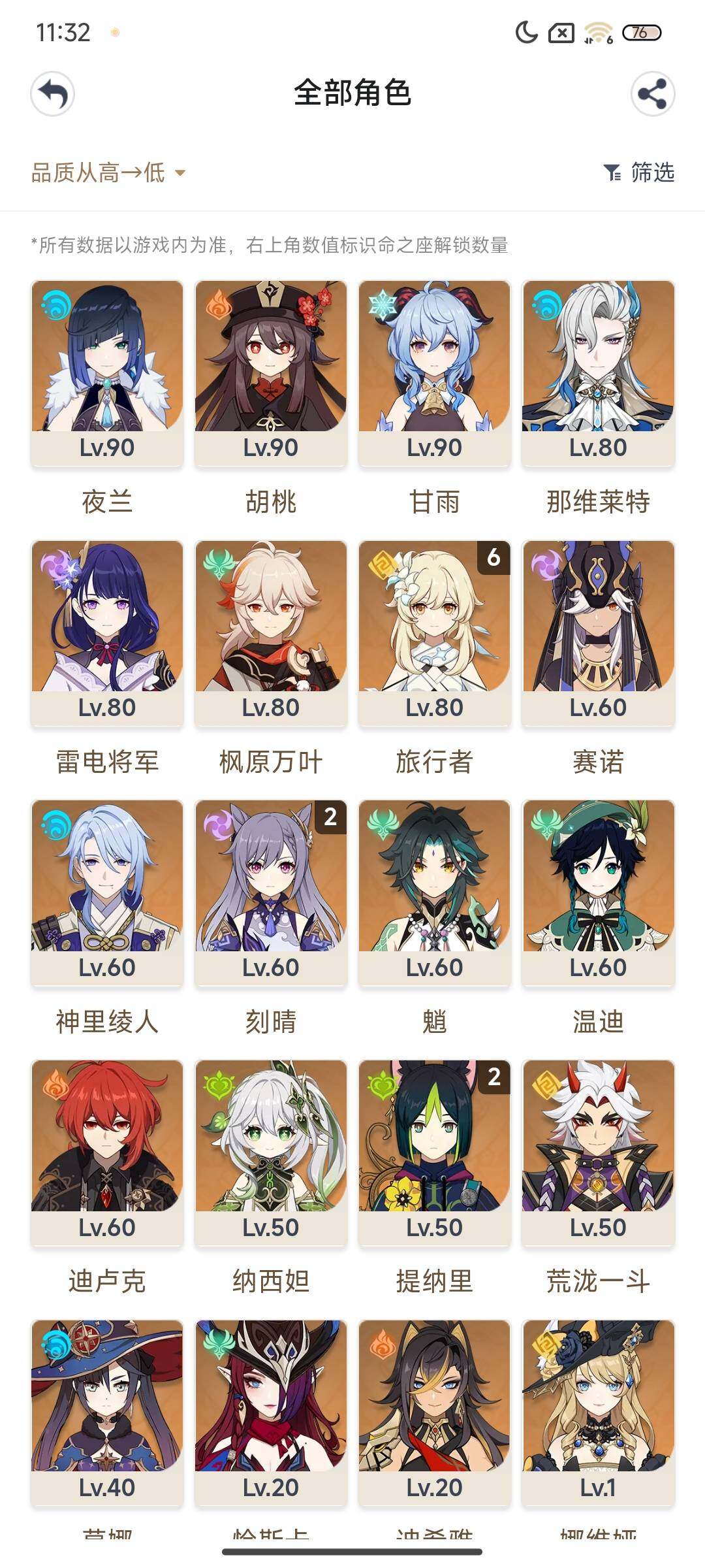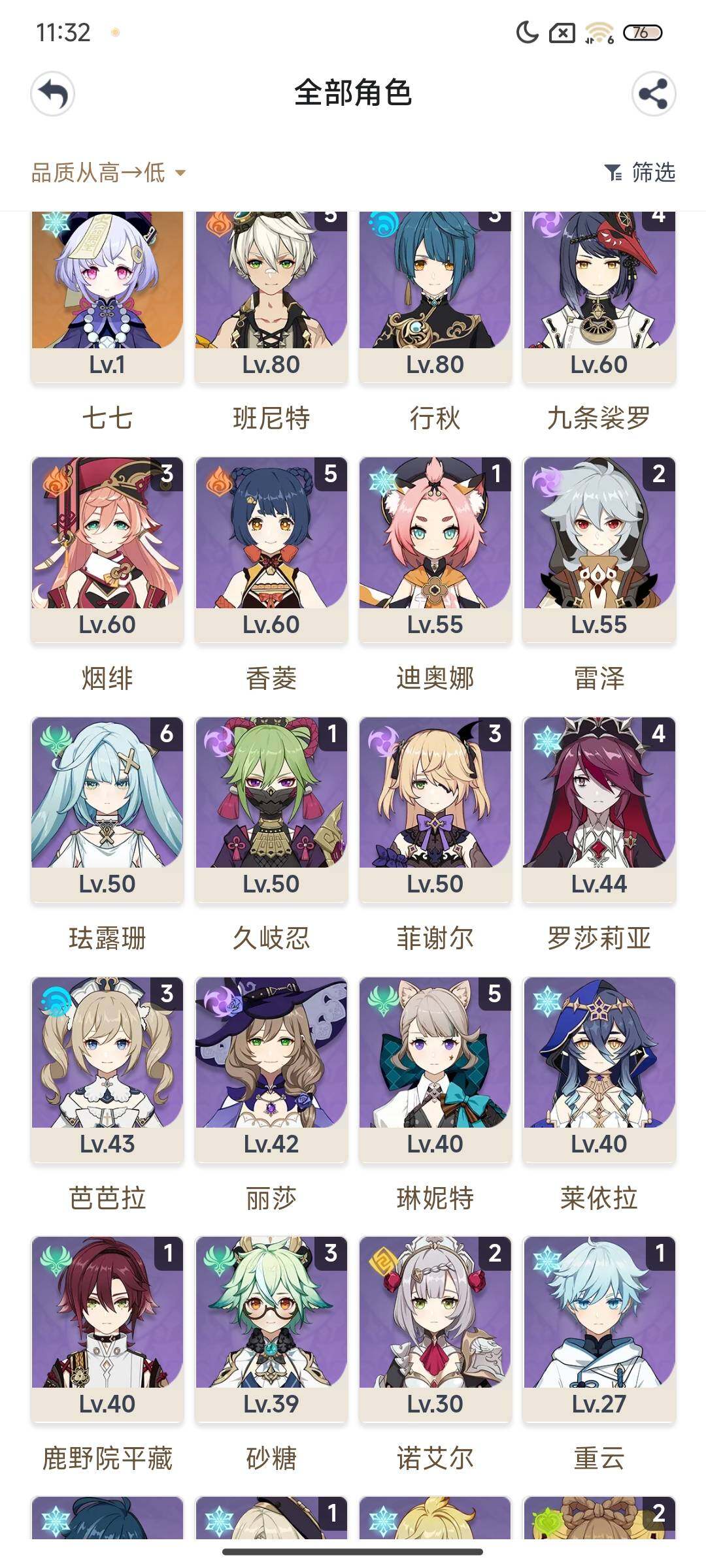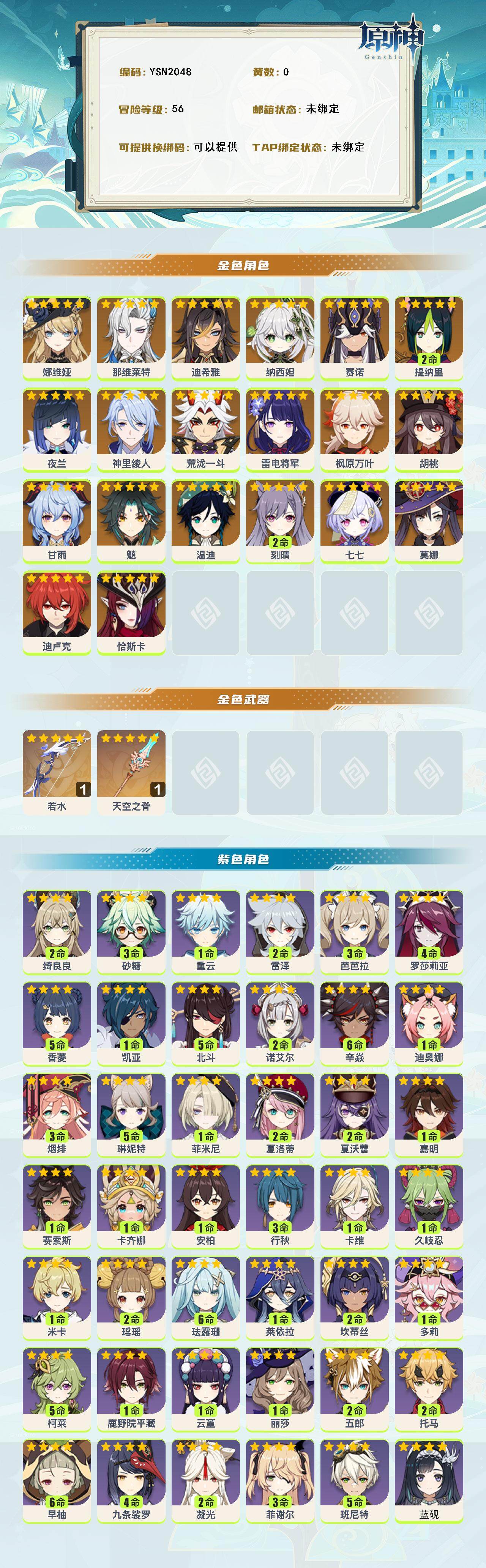 【ysn2048】56级/女主/21个五星角色/0命恰斯卡/0命娜维娅/0命那维莱特/0命迪希雅/0命纳西妲/0命赛诺/2命提纳里/0命夜兰/0命神里绫人/0命荒泷一斗/0命雷电将军/0命枫原万叶/0命胡桃/0命魈/0命甘雨/0命温迪/2命刻晴/0命迪卢克/0命莫娜/0命七七/精1若水/精1天空之脊/0命蓝砚/0命卡齐娜/0命赛索斯/0命嘉明/2命夏沃蕾/2命夏洛蒂/1命菲米尼/5命琳妮特/2命绮良良/0命卡维/0命米卡/2命瑶瑶/满命珐露珊/0命莱依拉/2命坎蒂丝/1命多莉/5命柯莱/1命鹿野院平藏/1命久岐忍/1命云堇/2命五郎/2命托马/4命九条裟罗/满命早柚/3命烟绯/4命罗莎莉亚/满命辛焱/1命迪奥娜/3命砂糖/2命雷泽/3命菲谢尔/0命丽莎/5命北斗/5命香菱/0命安柏/5命班尼特/3命行秋/3命芭芭拉/2命凝光/2命诺艾尔/0命凯亚/1命重云