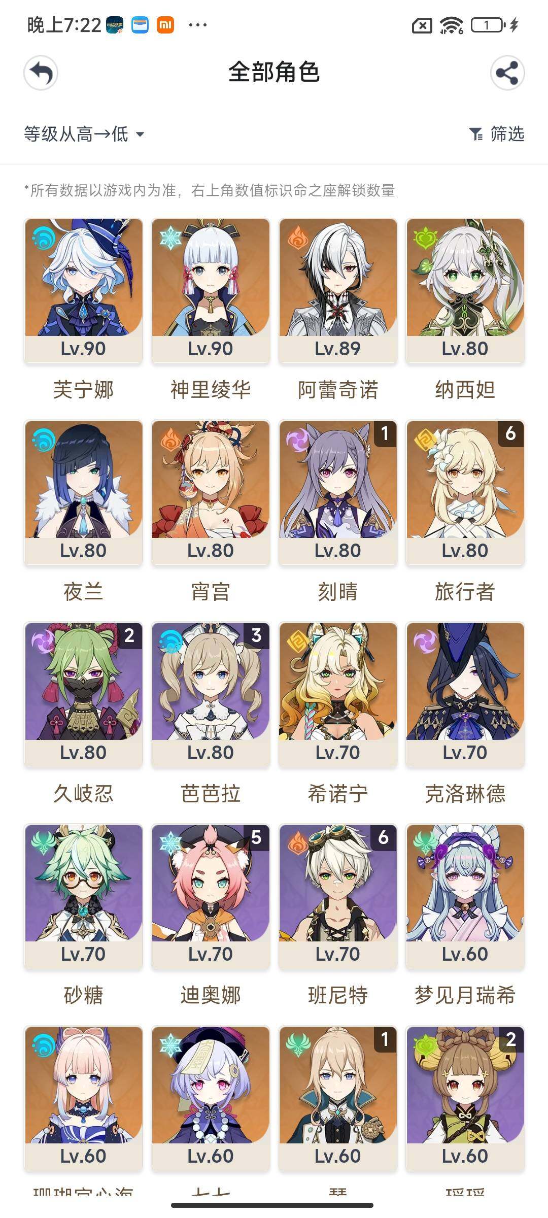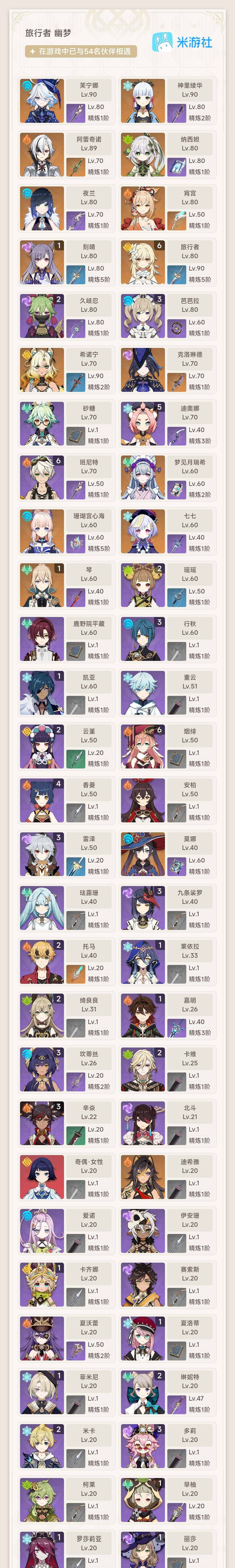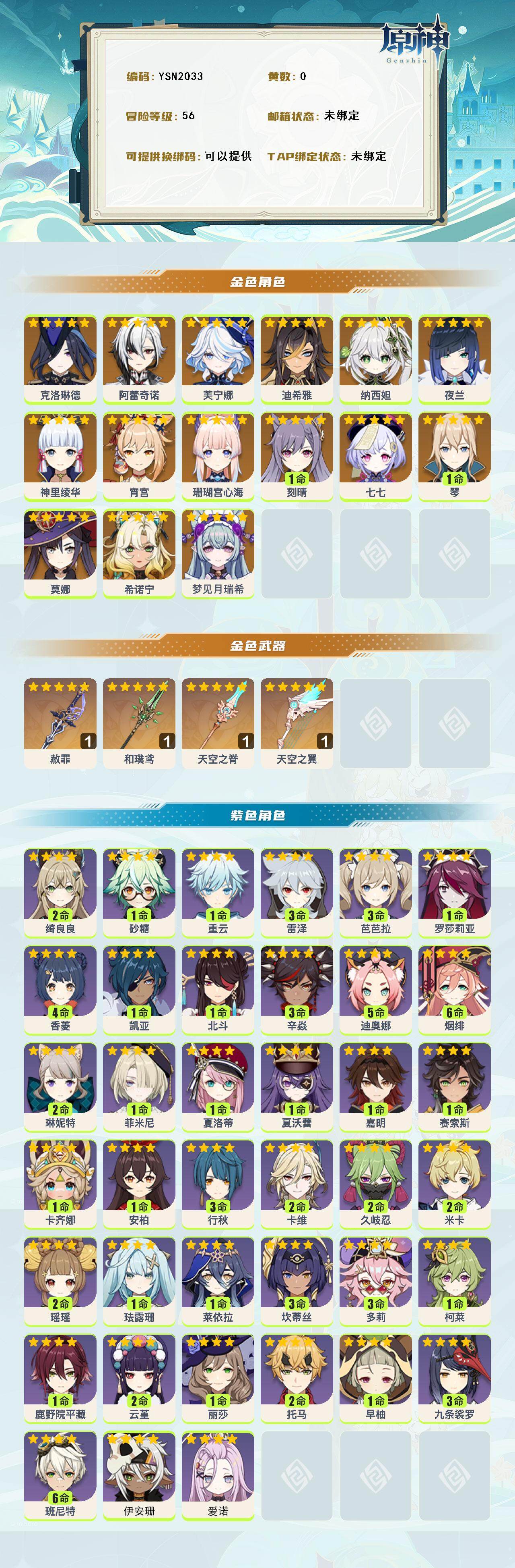 【ysn2033】56级/女主/17个五星角色/0命梦见月瑞希/0命希诺宁/0命克洛琳德/0命阿蕾奇诺/0命芙宁娜/0命迪希雅/0命纳西妲/0命夜兰/0命珊瑚宫心海/0命宵宫/0命神里绫华/1命琴/1命刻晴/0命莫娜/0命七七/精1赦罪/精1和璞鸢/精1天空之脊/精1天空之翼/0命爱诺/0命伊安珊/1命卡齐娜/0命赛索斯/1命嘉明/0命夏沃蕾/1命夏洛蒂/1命菲米尼/2命琳妮特/2命绮良良/2命卡维/2命米卡/2命瑶瑶/0命珐露珊/1命莱依拉/3命坎蒂丝/3命多莉/0命柯莱/0命鹿野院平藏/2命久岐忍/2命云堇/2命托马/3命九条裟罗/1命早柚/满命烟绯/1命罗莎莉亚/3命辛焱/5命迪奥娜/0命砂糖/3命雷泽/1命丽莎/0命北斗/4命香菱/0命安柏/满命班尼特/3命行秋/3命芭芭拉/1命凯亚/0命重云