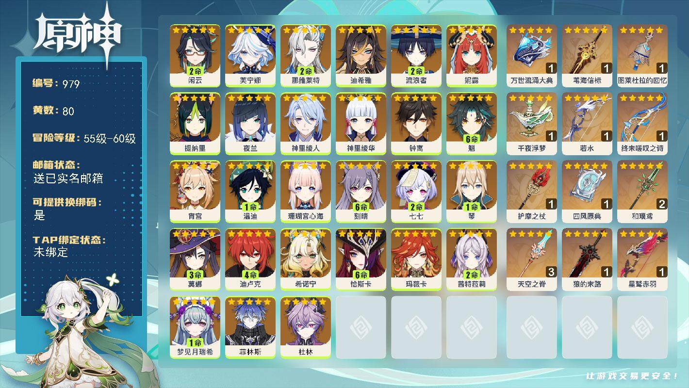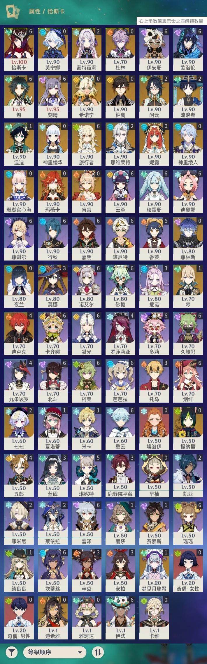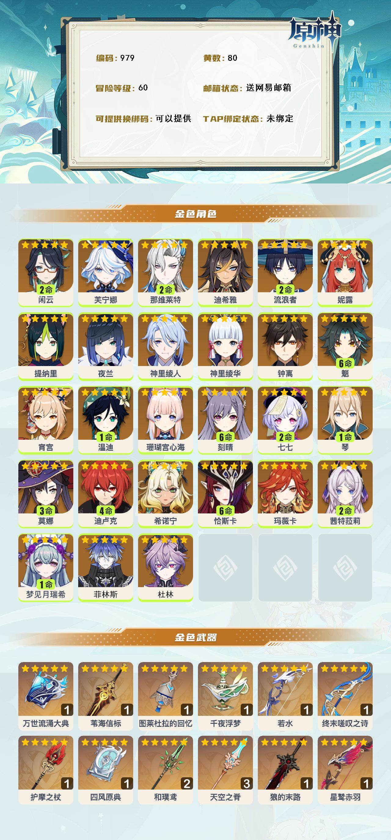 [14351793]60级/80黄/女主/27个五星角色/12个五星武器 2命闲云0命芙宁娜2命那维莱特0命迪希雅2命流浪者0命妮露0命提纳里0命夜兰0命神里绫人0命神里绫华0命钟离满命魈0命宵宫1命温迪0命珊瑚宫心海满命刻晴2命七七1命琴3命莫娜4命迪卢克0命希诺宁满命恰斯卡0命玛薇卡2命茜特菈莉1命梦见月瑞希0命菲林斯0命杜林精1万世流涌大典精1苇海信标精1图莱杜拉的回忆精1千夜浮梦精1若水精1终末嗟叹之诗精1护摩之杖精1四风原典精2和璞鸢精3天空之脊精1狼的末路精1星鹫赤羽