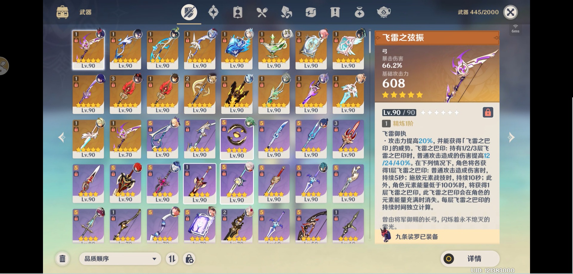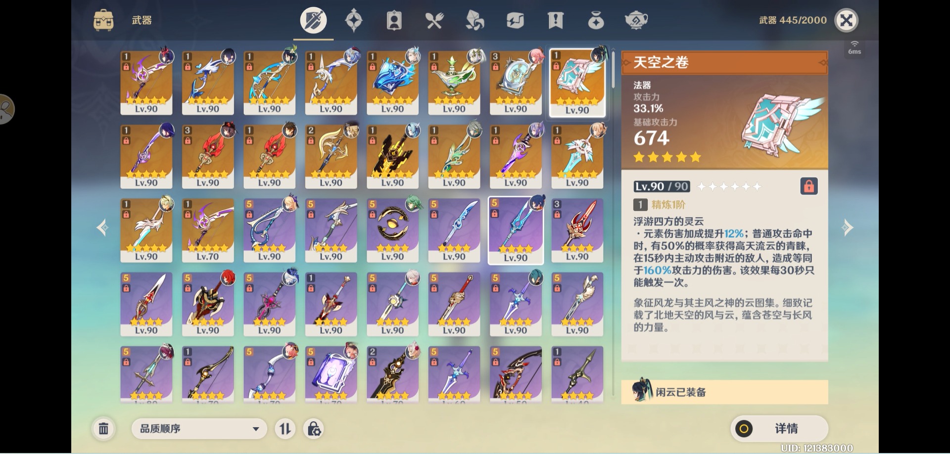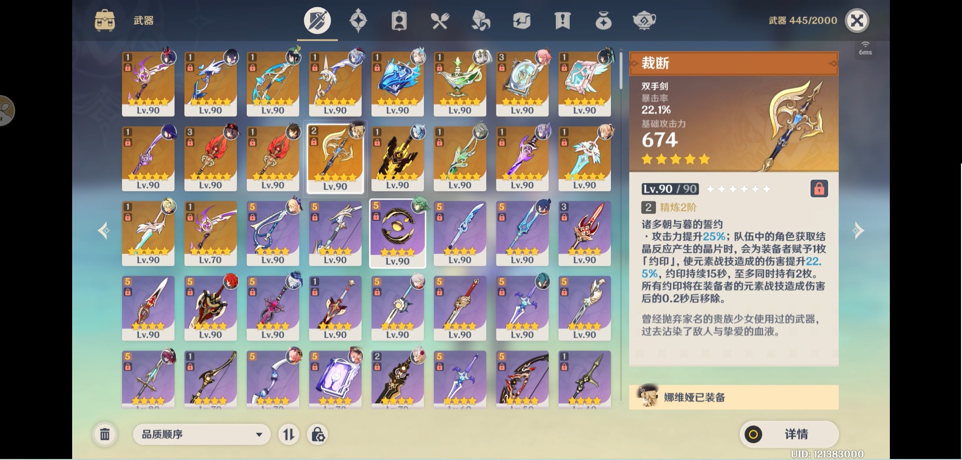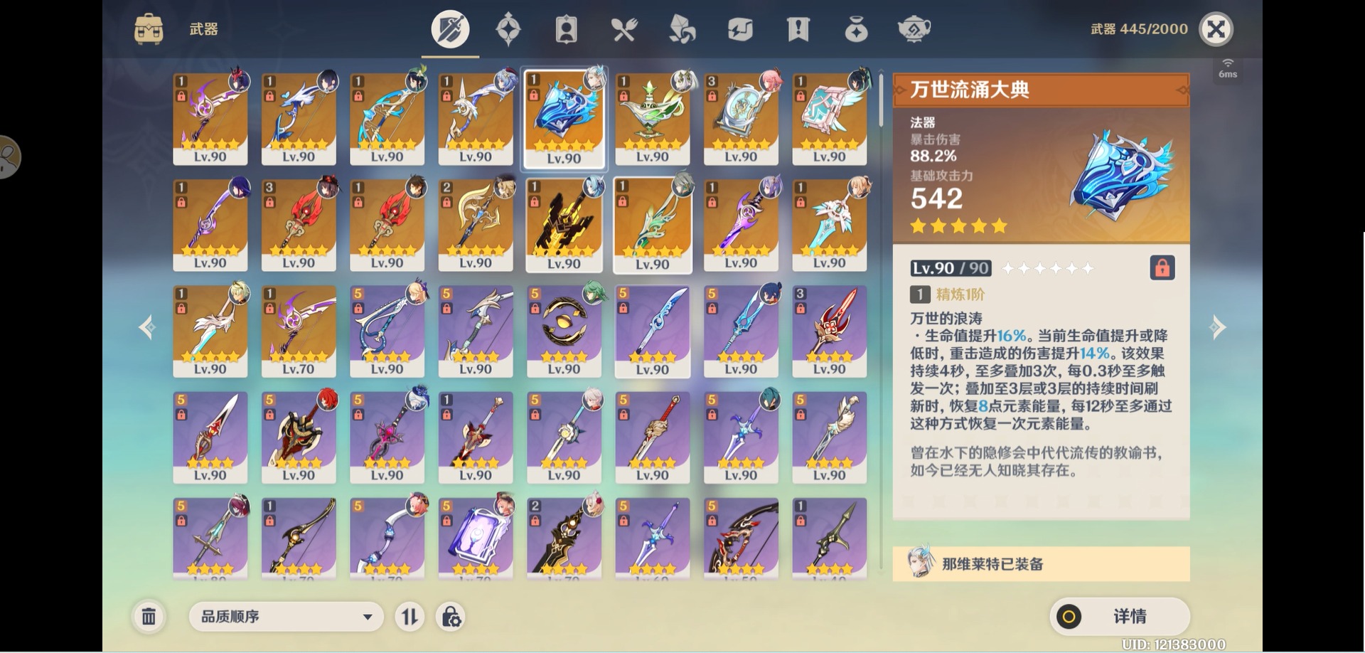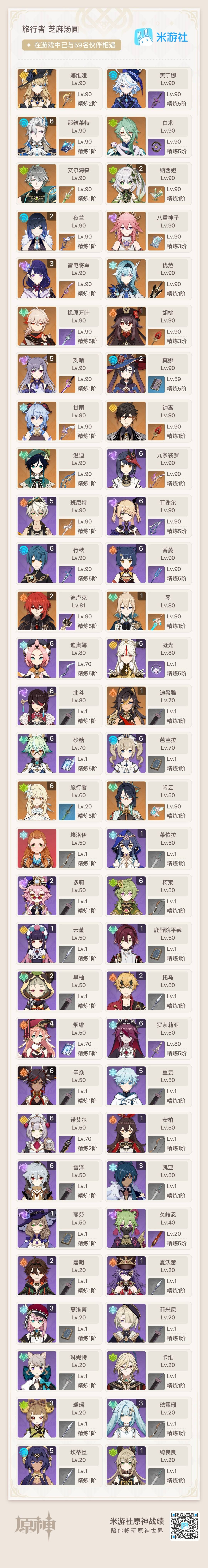 [14357368]【总黄数】:40 【冒险等级】:60 【6命金色角色】:满命那维莱特 【5命金色角色】:五命刻晴 【3命金色角色】:三命雷电将军 【2命金色角色】:二命纳西妲二命夜兰二命迪卢克二命莫娜 【1命金色角色】:一命胡桃一命迪希雅一命琴 【0命金色角色】:闲云娜维娅芙宁娜白术艾尔海森八重神子枫原万叶优菈甘雨钟离温迪 【3精武器】:护摩之杖四风原典 【2精武器】:裁断 【1精武器】:万世流涌大典裁叶萃光千夜浮梦若水薙草之稻光飞雷之弦振雾切之回光阿莫斯之弓终末嗟叹之诗风鹰剑天空之卷无工之剑天空之刃