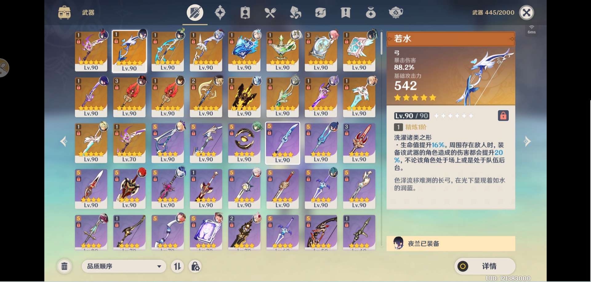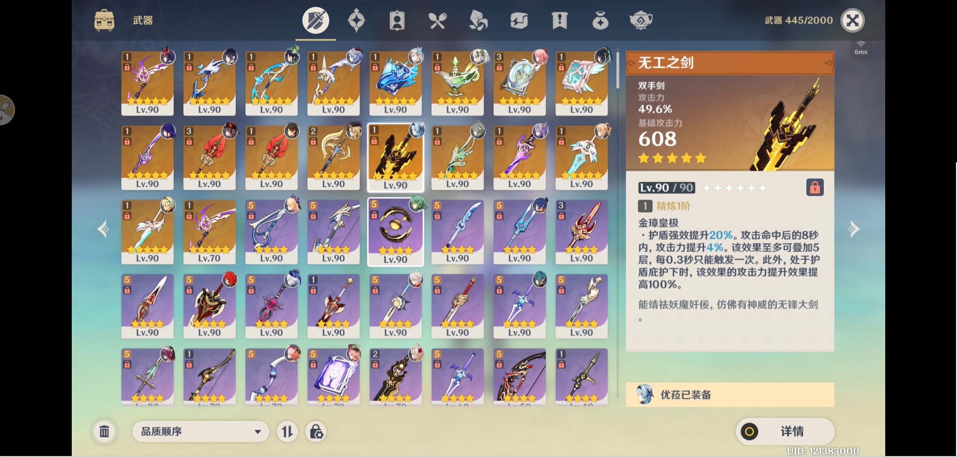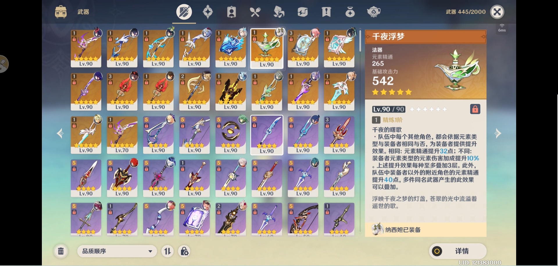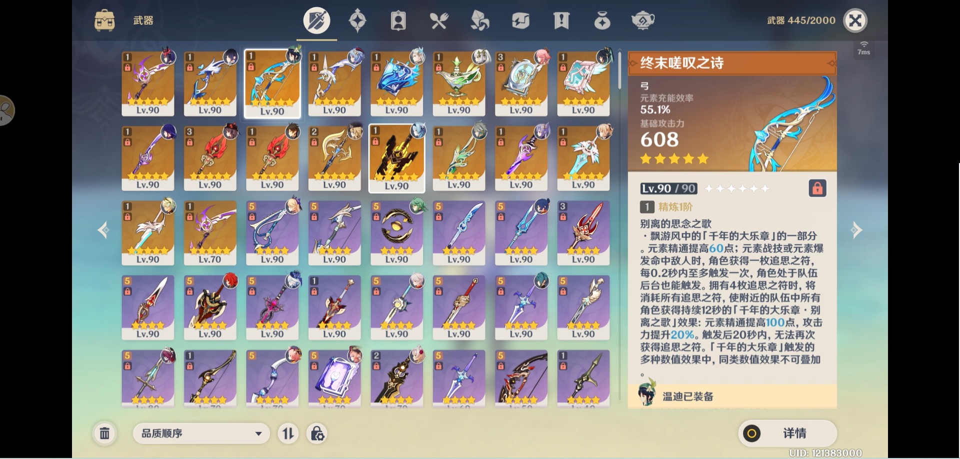 [14357368]【总黄数】:40 【冒险等级】:60 【6命金色角色】:满命那维莱特 【5命金色角色】:五命刻晴 【3命金色角色】:三命雷电将军 【2命金色角色】:二命纳西妲二命夜兰二命迪卢克二命莫娜 【1命金色角色】:一命胡桃一命迪希雅一命琴 【0命金色角色】:闲云娜维娅芙宁娜白术艾尔海森八重神子枫原万叶优菈甘雨钟离温迪 【3精武器】:护摩之杖四风原典 【2精武器】:裁断 【1精武器】:万世流涌大典裁叶萃光千夜浮梦若水薙草之稻光飞雷之弦振雾切之回光阿莫斯之弓终末嗟叹之诗风鹰剑天空之卷无工之剑天空之刃