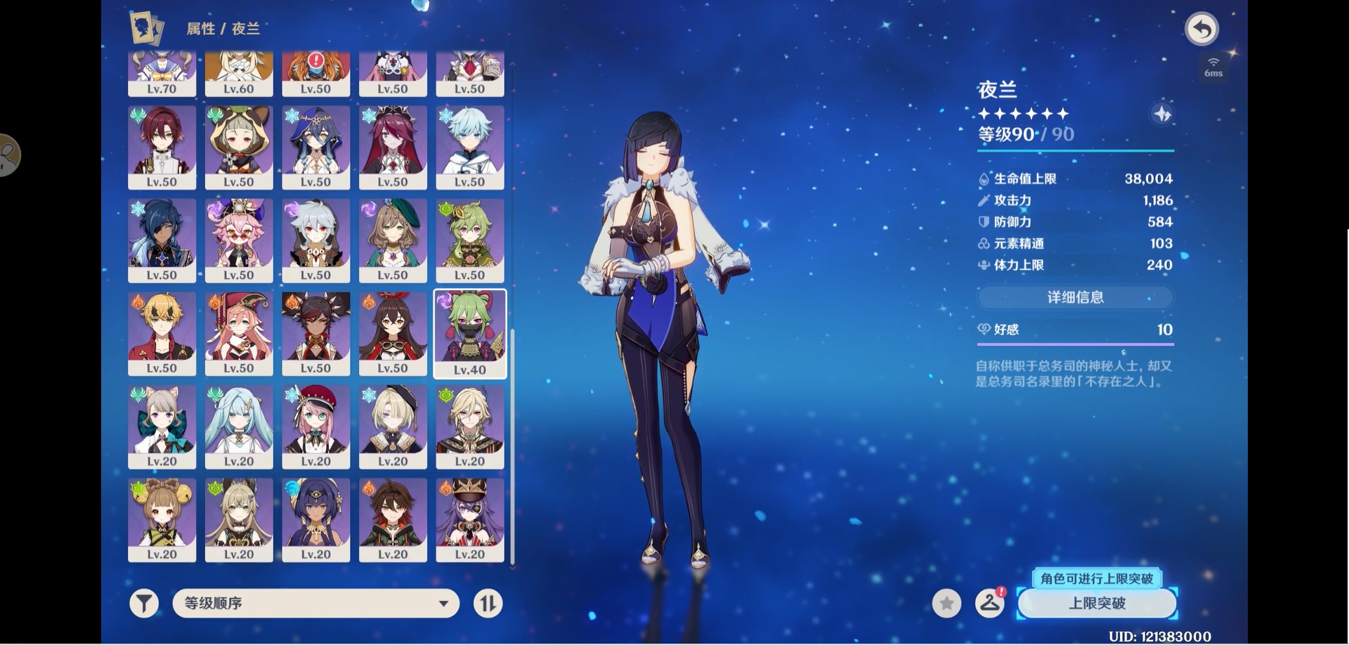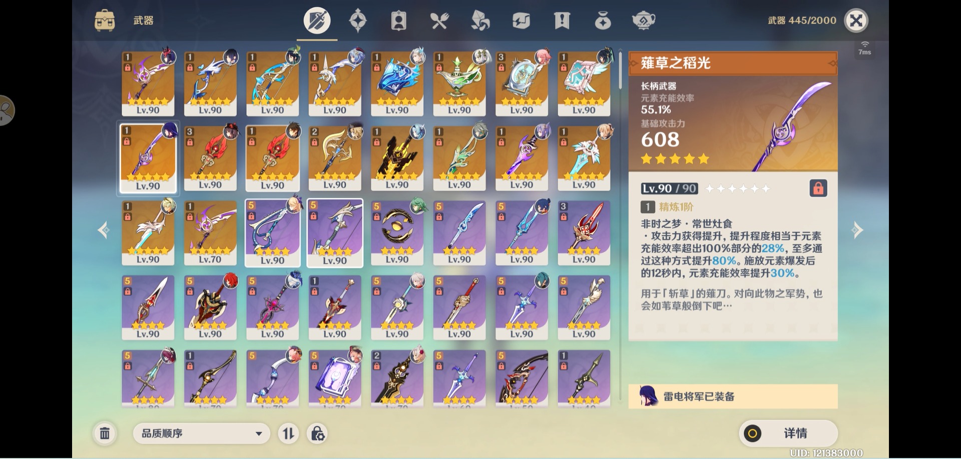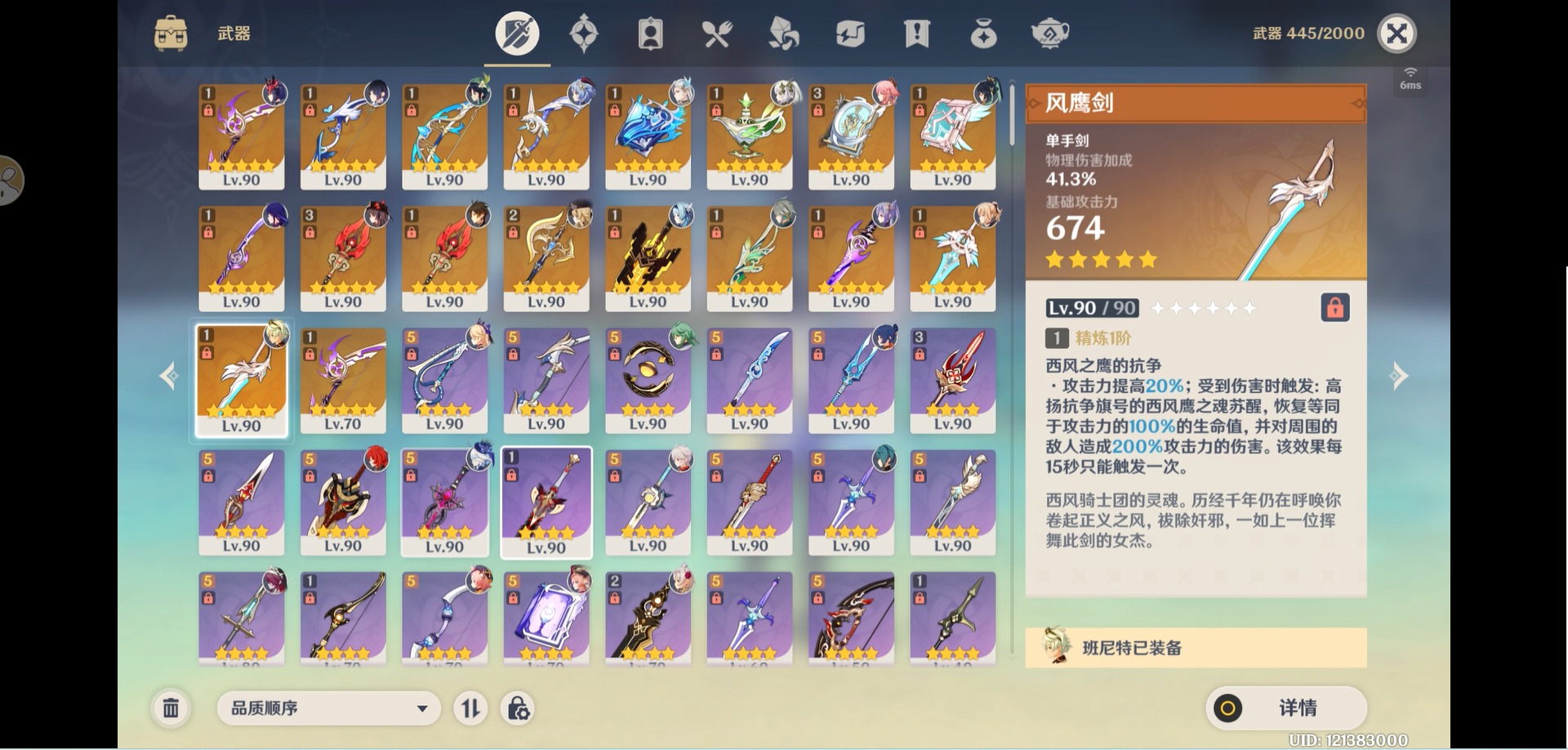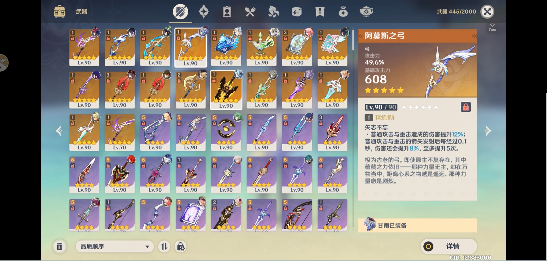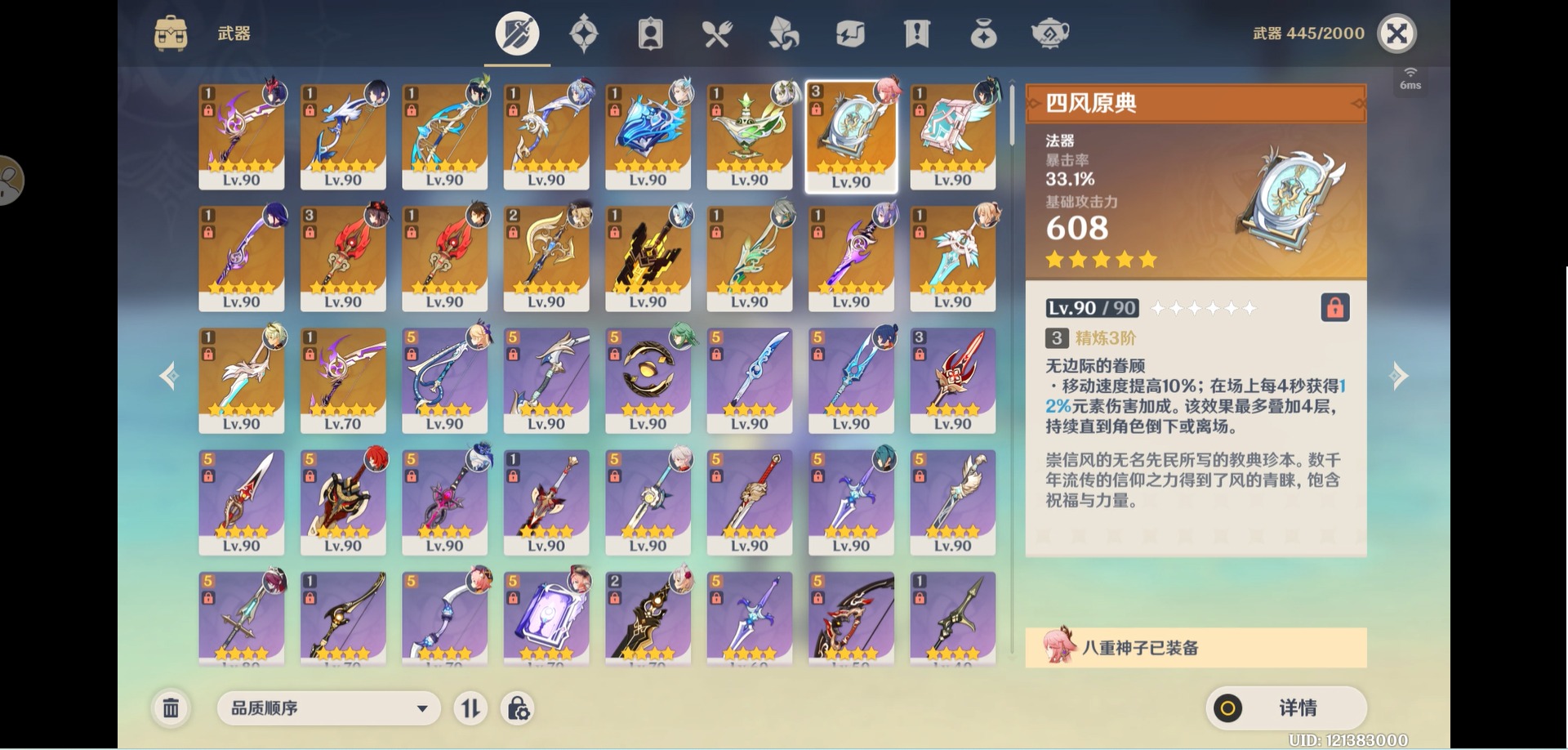 [14357368]【总黄数】:40 【冒险等级】:60 【6命金色角色】:满命那维莱特 【5命金色角色】:五命刻晴 【3命金色角色】:三命雷电将军 【2命金色角色】:二命纳西妲二命夜兰二命迪卢克二命莫娜 【1命金色角色】:一命胡桃一命迪希雅一命琴 【0命金色角色】:闲云娜维娅芙宁娜白术艾尔海森八重神子枫原万叶优菈甘雨钟离温迪 【3精武器】:护摩之杖四风原典 【2精武器】:裁断 【1精武器】:万世流涌大典裁叶萃光千夜浮梦若水薙草之稻光飞雷之弦振雾切之回光阿莫斯之弓终末嗟叹之诗风鹰剑天空之卷无工之剑天空之刃