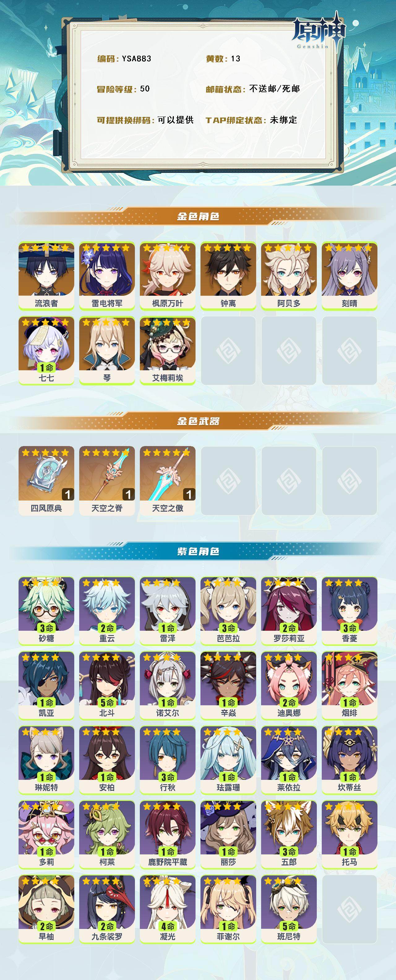 【ysa883】50级/13黄/女主/11个五星角色/3个五星武器/0命艾梅莉埃/0命流浪者/0命雷电将军/0命枫原万叶/0命阿贝多/0命钟离/0命琴/0命刻晴/1命七七/精1天空之傲/精1四风原典/精1天空之脊/0命琳妮特/0命珐露珊/0命莱依拉/0命坎蒂丝/0命多莉/1命柯莱/1命鹿野院平藏/3命五郎/1命托马/2命九条裟罗/2命早柚/1命烟绯/2命罗莎莉亚/0命辛焱/2命迪奥娜/3命砂糖/1命雷泽/0命菲谢尔/1命丽莎/5命北斗/3命香菱/1命安柏/5命班尼特/3命行秋/3命芭芭拉/4命凝光/1命诺艾尔/1命凯亚/2命重云