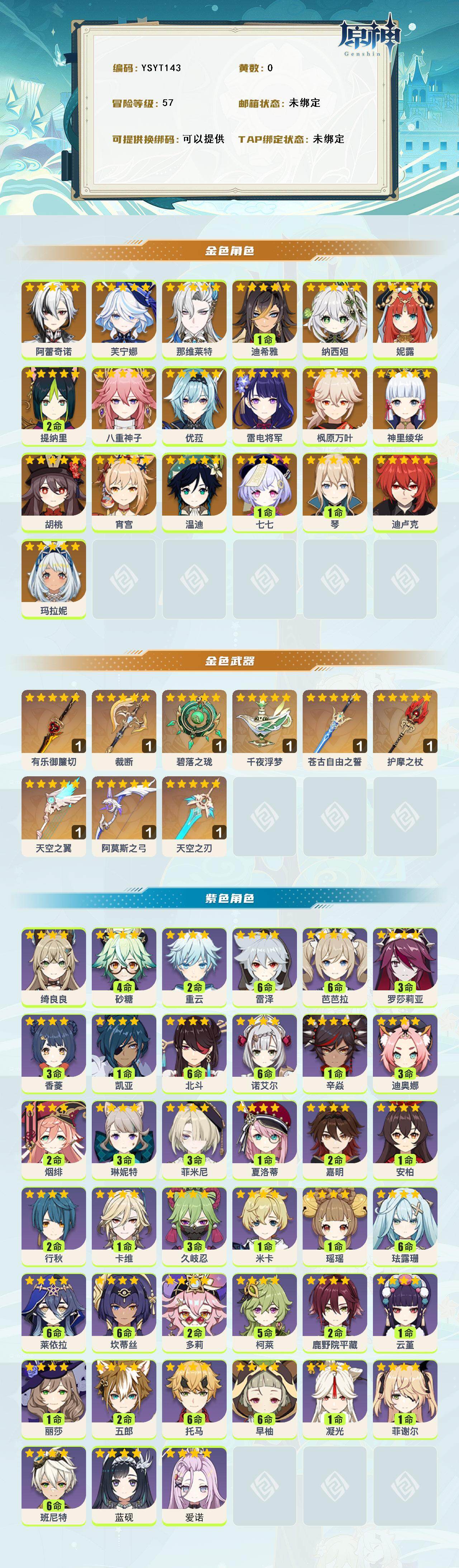 【ysyt143】57级/女主/21个五星角色/0命玛拉妮/0命阿蕾奇诺/0命芙宁娜/0命那维莱特/1命迪希雅/0命纳西妲/0命妮露/2命提纳里/0命八重神子/0命雷电将军/0命宵宫/0命神里绫华/0命枫原万叶/0命优菈/0命胡桃/0命温迪/1命琴/0命迪卢克/1命七七/精1有乐御簾切/精1裁断/精1碧落之珑/精1千夜浮梦/精1苍古自由之誓/精1护摩之杖/精1阿莫斯之弓/精1天空之刃/精1天空之翼/0命爱诺/0命蓝砚/2命嘉明/1命夏洛蒂/3命菲米尼/3命琳妮特/0命绮良良/0命卡维/1命米卡/1命瑶瑶/满命珐露珊/满命莱依拉/满命坎蒂丝/2命多莉/5命柯莱/2命鹿野院平藏/3命久岐忍/1命云堇/2命五郎/满命托马/满命早柚/2命烟绯/3命罗莎莉亚/0命辛焱/3命迪奥娜/4命砂糖/满命雷泽/1命菲谢尔/0命丽莎/满命北斗/3命香菱/0命安柏/满命班尼特/2命行秋/满命芭芭拉/0命凝光/满命诺艾尔/1命凯亚/2命重云