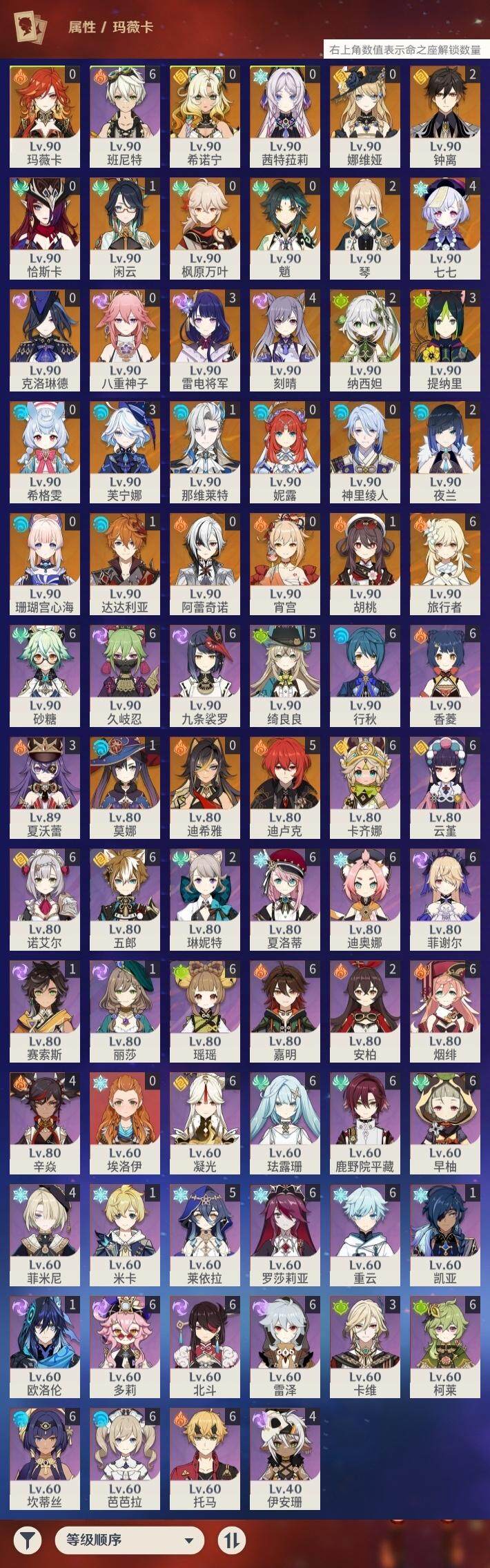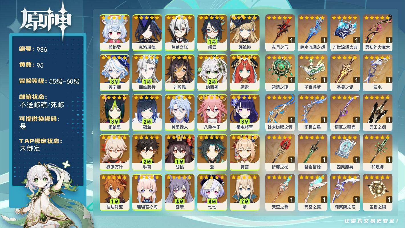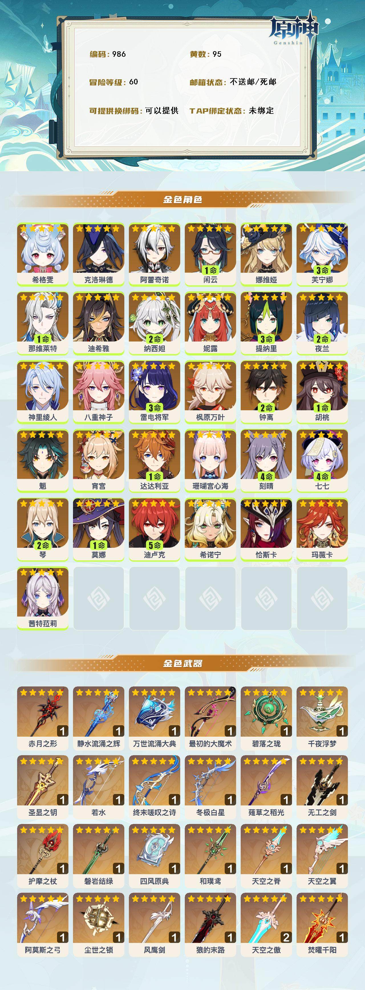 [14366465]60级/95黄/女主/31个五星角色/28个五星武器 0命希格雯0命克洛琳德0命阿蕾奇诺1命闲云0命娜维娅3命芙宁娜1命那维莱特0命迪希雅2命纳西妲0命妮露3命提纳里2命夜兰0命神里绫人0命八重神子3命雷电将军0命枫原万叶2命钟离1命胡桃0命魈0命宵宫1命达达利亚0命珊瑚宫心海4命刻晴4命七七2命琴1命莫娜5命迪卢克0命希诺宁0命恰斯卡0命玛薇卡0命茜特菈莉精1赤月之形精1静水流涌之辉精1万世流涌大典精1最初的大魔术精1碧落之珑精1千夜浮梦精1圣显之钥精1若水精1终末嗟叹之诗精1冬极白星精1薙草之稻光精1无工之剑精1护摩之杖精1磐岩结绿精1四风原典精1和璞鸢精1天空之脊精1天空之翼精1阿莫斯之弓精1尘世之锁精1风鹰剑精1狼的末路精2天空之傲精1焚曜千阳