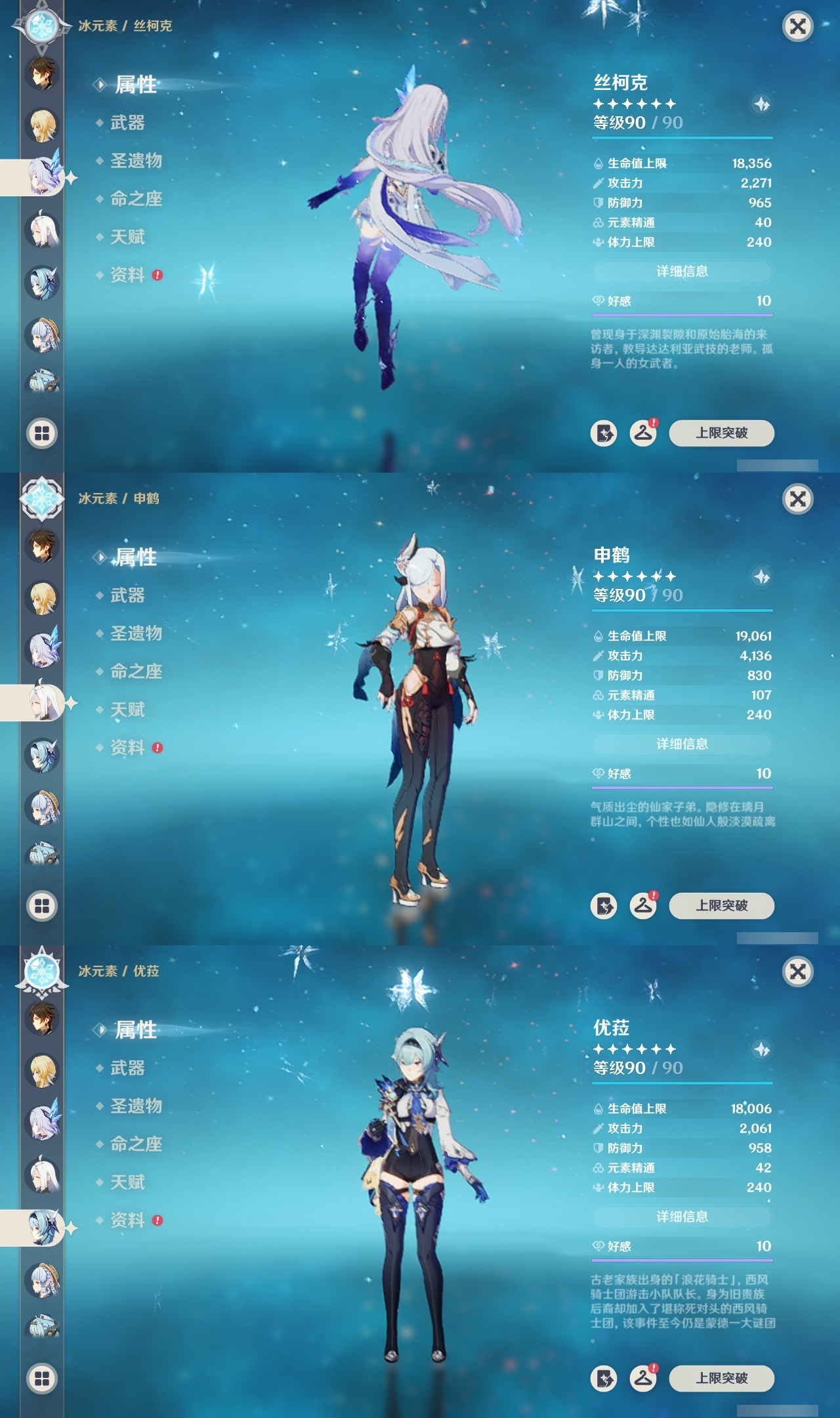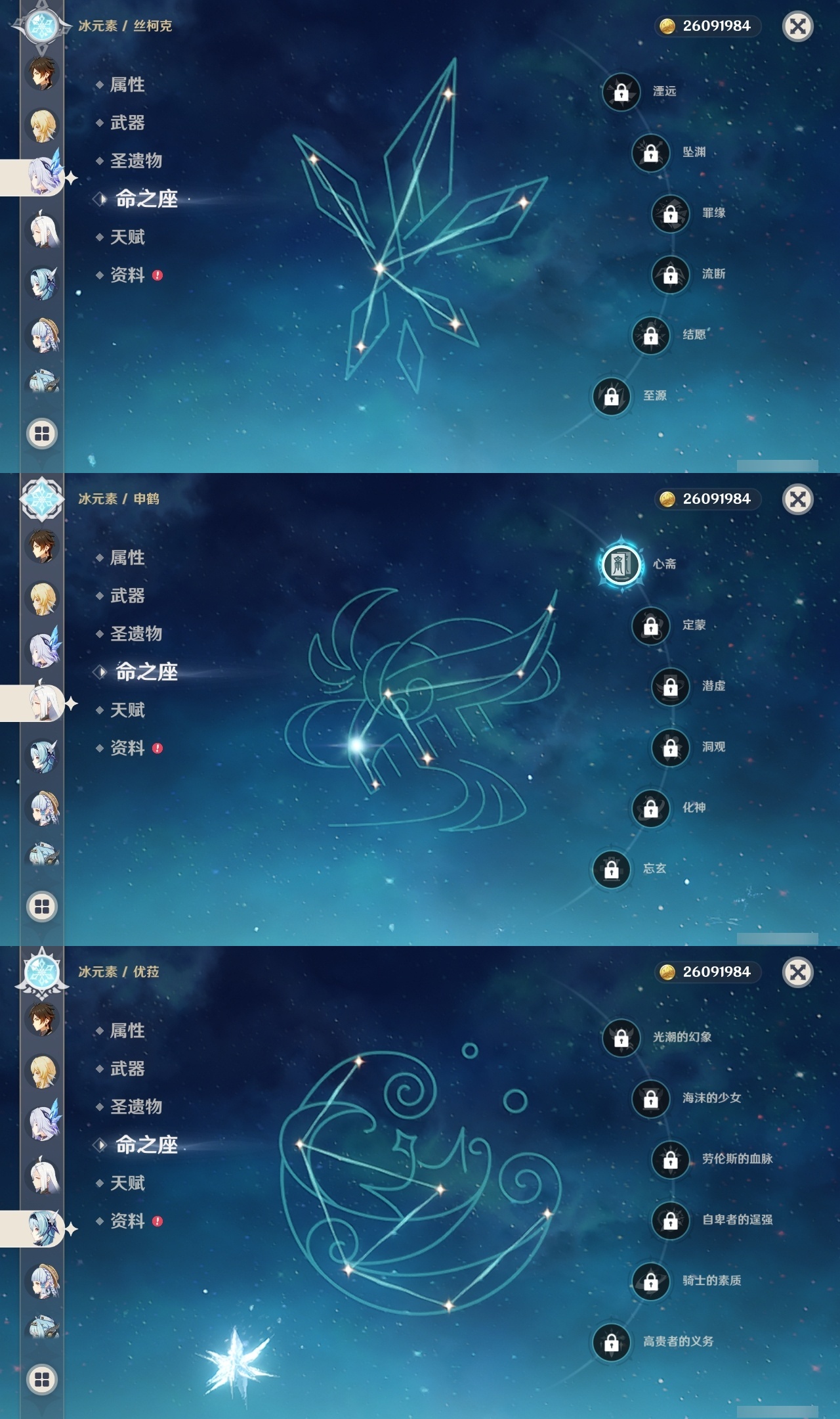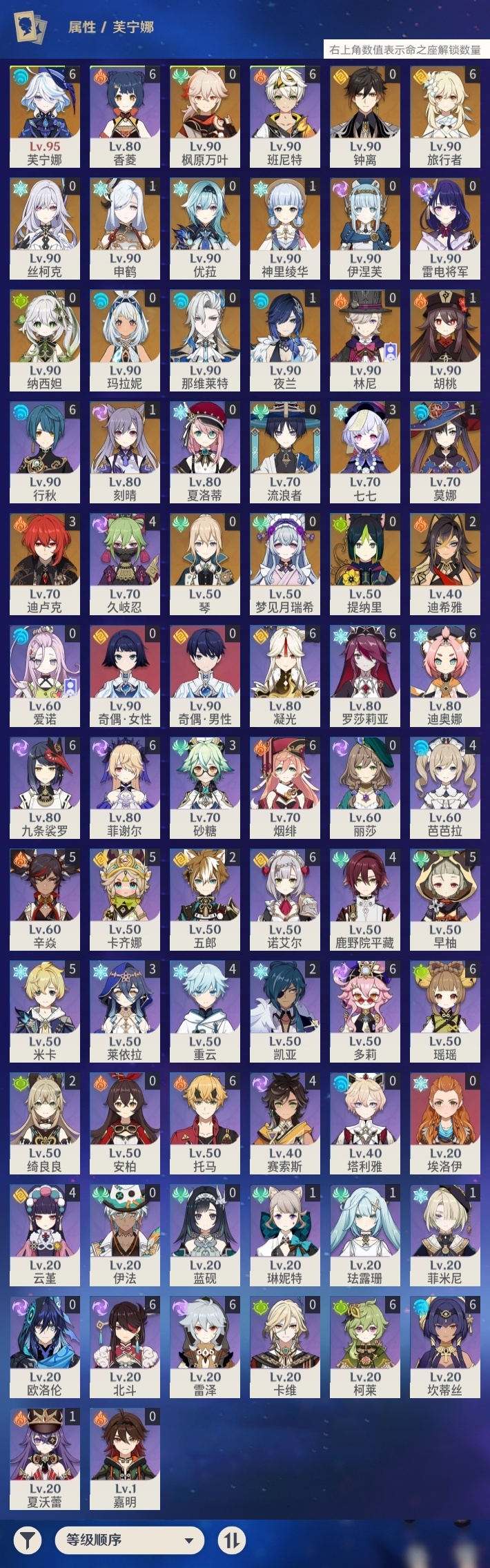【原神】【lyys8888】冒险等级:60,五星数量:41,五星角色:芙宁娜 6命迪卢克 3命七七 3命迪希雅 2命胡桃 1命刻晴 1命莫娜 1命神里绫华 1命申鹤 1命夜兰 1命玛拉妮琴优菈钟离梦见月瑞希林尼那维莱特提纳里丝柯克伊涅芙纳西妲流浪者枫原万叶雷电将军__五星武器:天空之刃 2精千夜浮梦 2精冲浪时光静水流涌之辉苍耀阿莫斯之弓天空之脊天空之卷雾切之回光薙草之稻光冬极白星息灾神乐之真意若水__四星角色:班尼特 6命行秋 6命九条裟罗 6命香菱 6命凝光 6命迪奥娜 6命瑶瑶 6命坎蒂丝 6命多莉 6命柯莱 6命托马 6命烟绯 6命诺艾尔 6命罗莎莉亚 6命雷泽 6命菲谢尔 6命北斗 6命卡齐娜 5命米卡 5命早柚 5命辛焱 5命久岐忍 4命鹿野院平藏 4命芭芭拉 4命云堇 4命重云 4命赛索斯 4命砂糖 3命莱依拉 3命绮良良 2命五郎 2命珐露珊 1命菲米尼 1命琳妮特 1命夏沃蕾 1命埃洛伊奇偶·女性奇偶·男性卡维欧洛伦蓝砚夏洛蒂嘉明伊法塔利雅爱诺