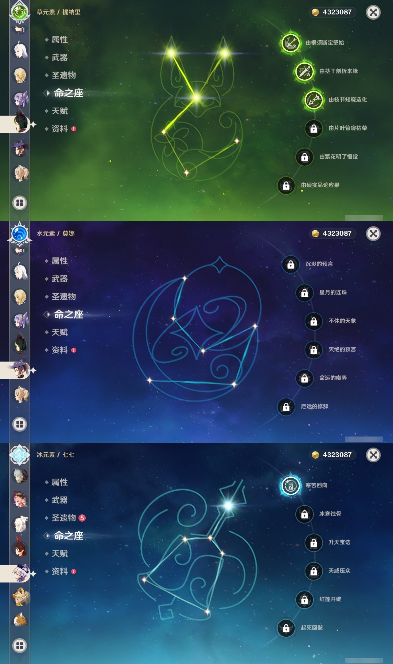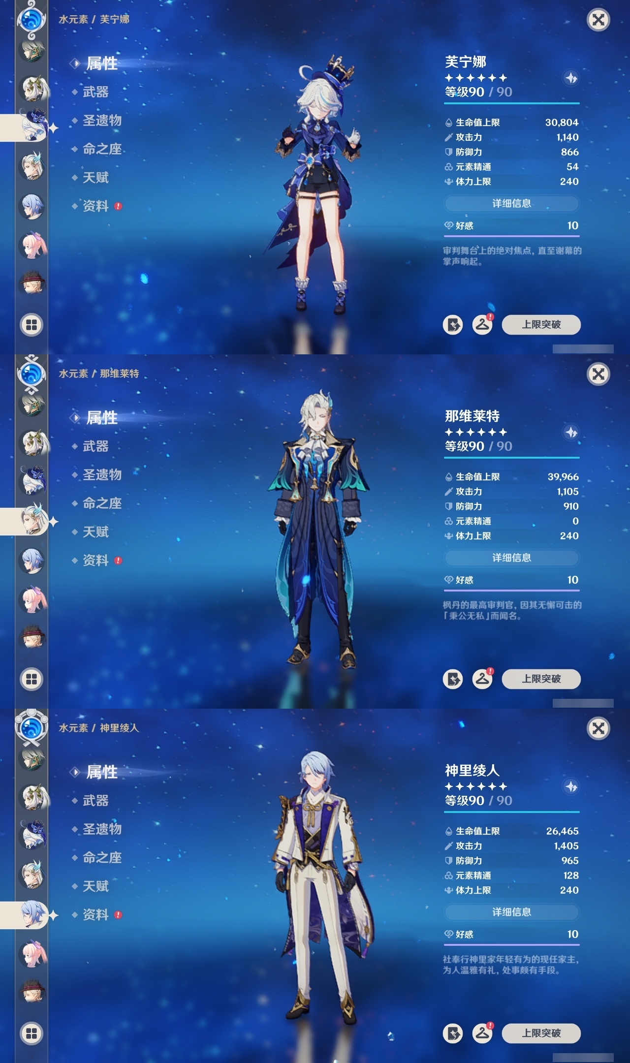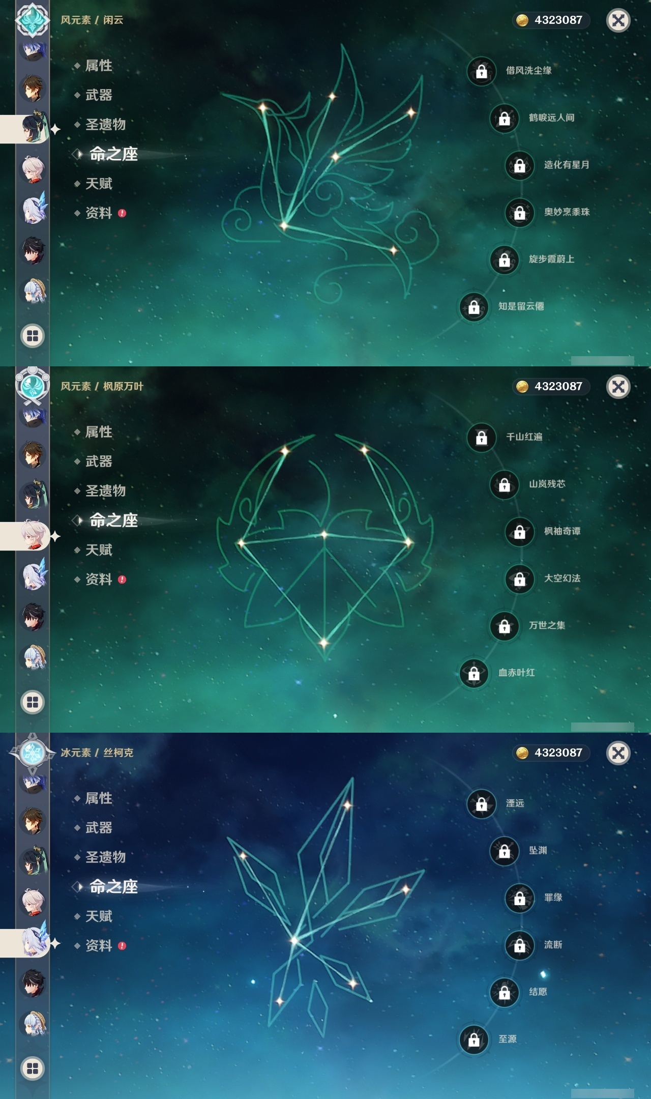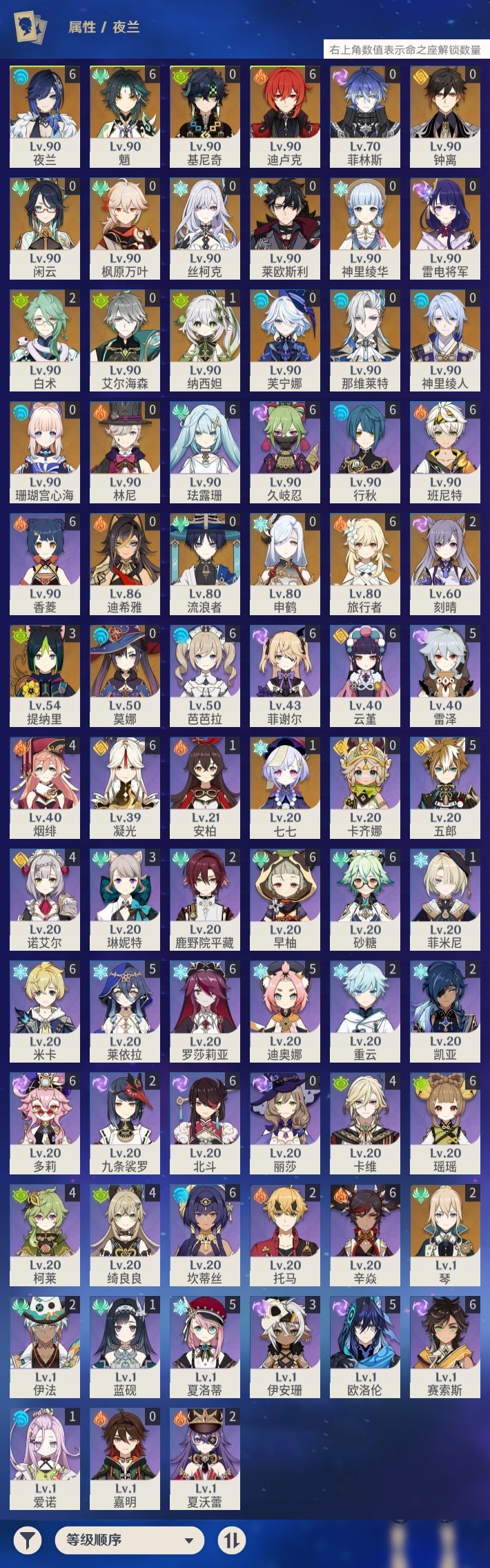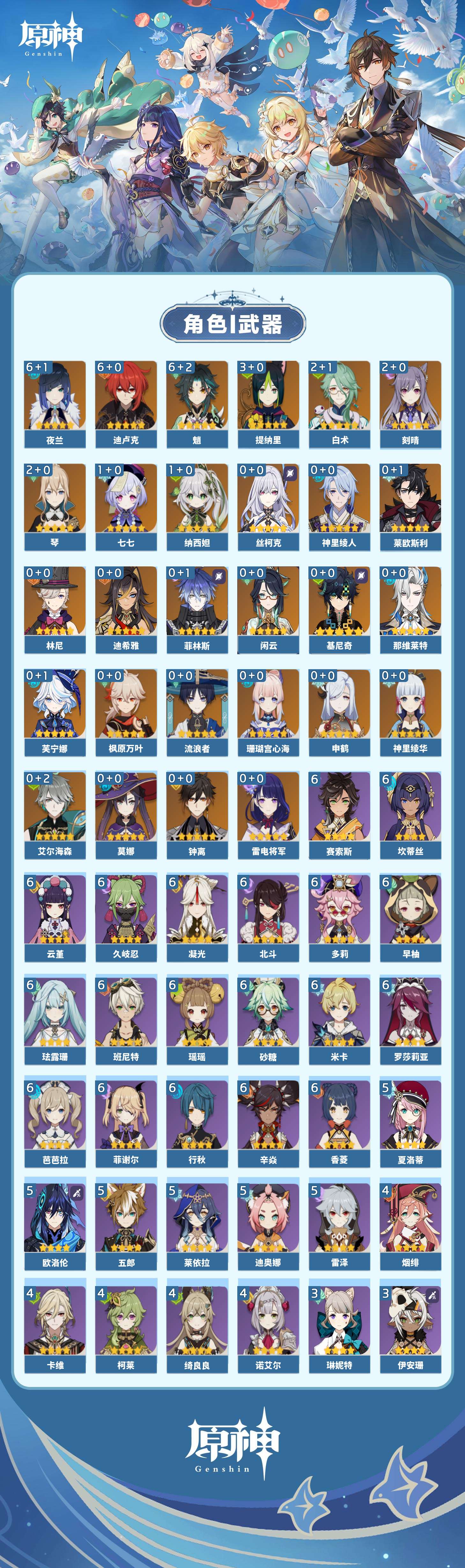 【原神】满命,冒险等级:60,五星数量:42,五星角色:迪卢克 6命魈 6命夜兰 6命提纳里 3命白术 2命刻晴 2命琴 2命七七 1命纳西妲 1命莫娜基尼奇珊瑚宫心海神里绫华迪希雅钟离申鹤神里绫人林尼那维莱特莱欧斯利芙宁娜闲云丝柯克菲林斯艾尔海森流浪者枫原万叶雷电将军__五星武器:和璞鸢 2精裁叶萃光 2精柔灯挽歌冲浪时光岩峰巡歌碧落之珑金流监督静水流涌之辉血染荒城阿莫斯之弓护摩之杖天空之卷天空之翼若水__四星角色:班尼特 6命行秋 6命香菱 6命久岐忍 6命珐露珊 6命凝光 6命砂糖 6命瑶瑶 6命米卡 6命坎蒂丝 6命多莉 6命芭芭拉 6命云堇 6命早柚 6命辛焱 6命罗莎莉亚 6命菲谢尔 6命北斗 6命赛索斯 6命迪奥娜 5命莱依拉 5命欧洛伦 5命五郎 5命雷泽 5命夏洛蒂 5命绮良良 4命柯莱 4命卡维 4命烟绯 4命诺艾尔 4命琳妮特 3命伊安珊 3命九条裟罗 2命鹿野院平藏 2命托马 2命重云 2命夏沃蕾 2命伊法 2命蓝砚 1命菲米尼 1命爱诺 1命卡齐娜嘉明