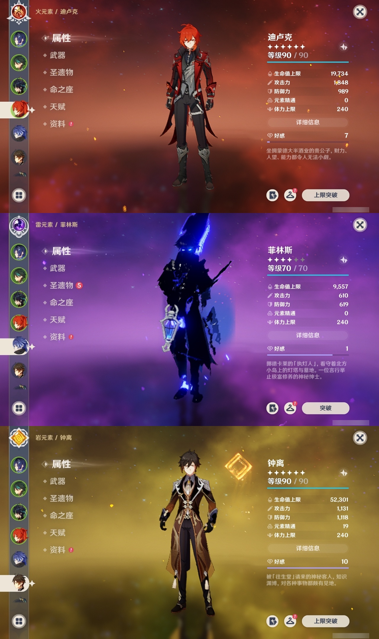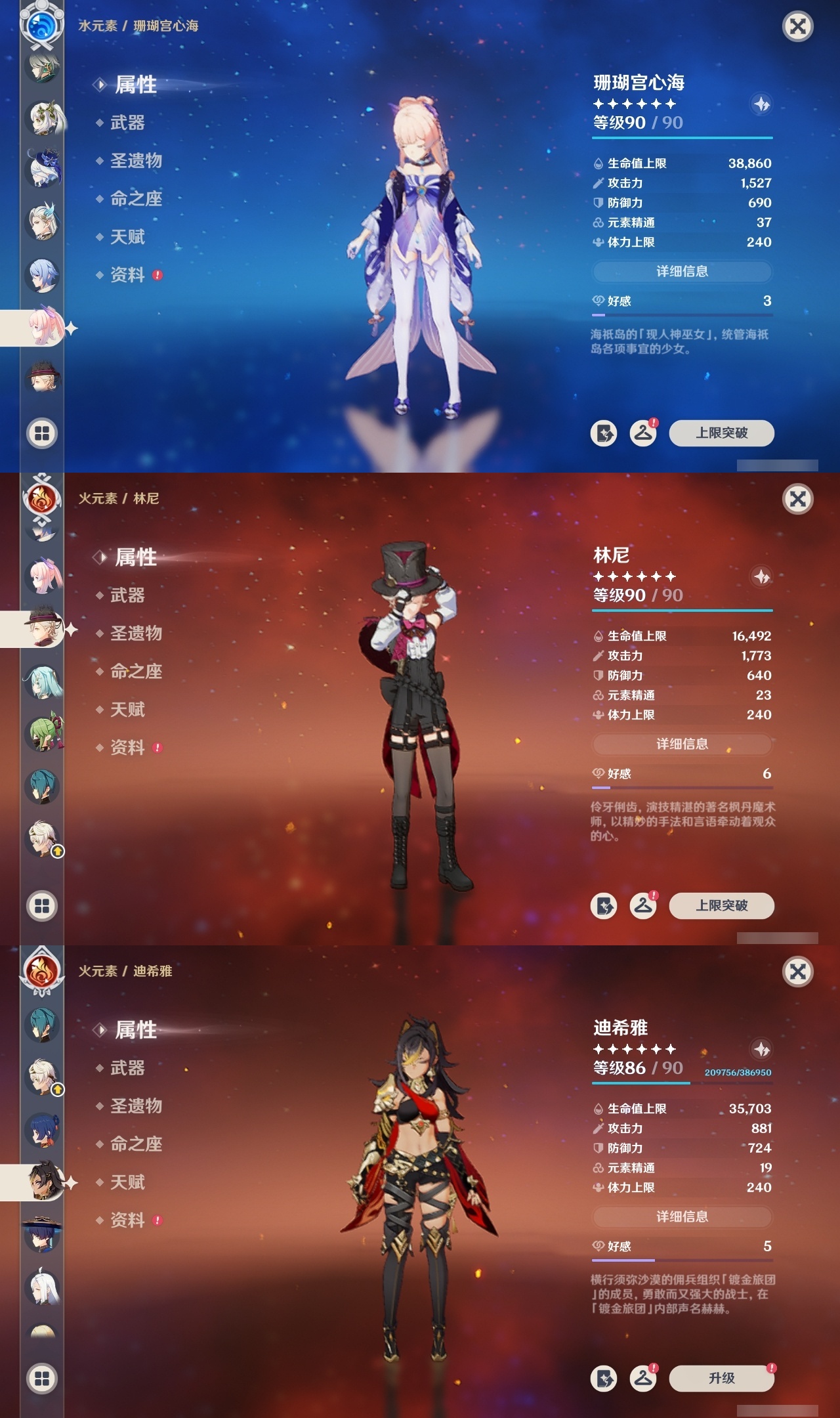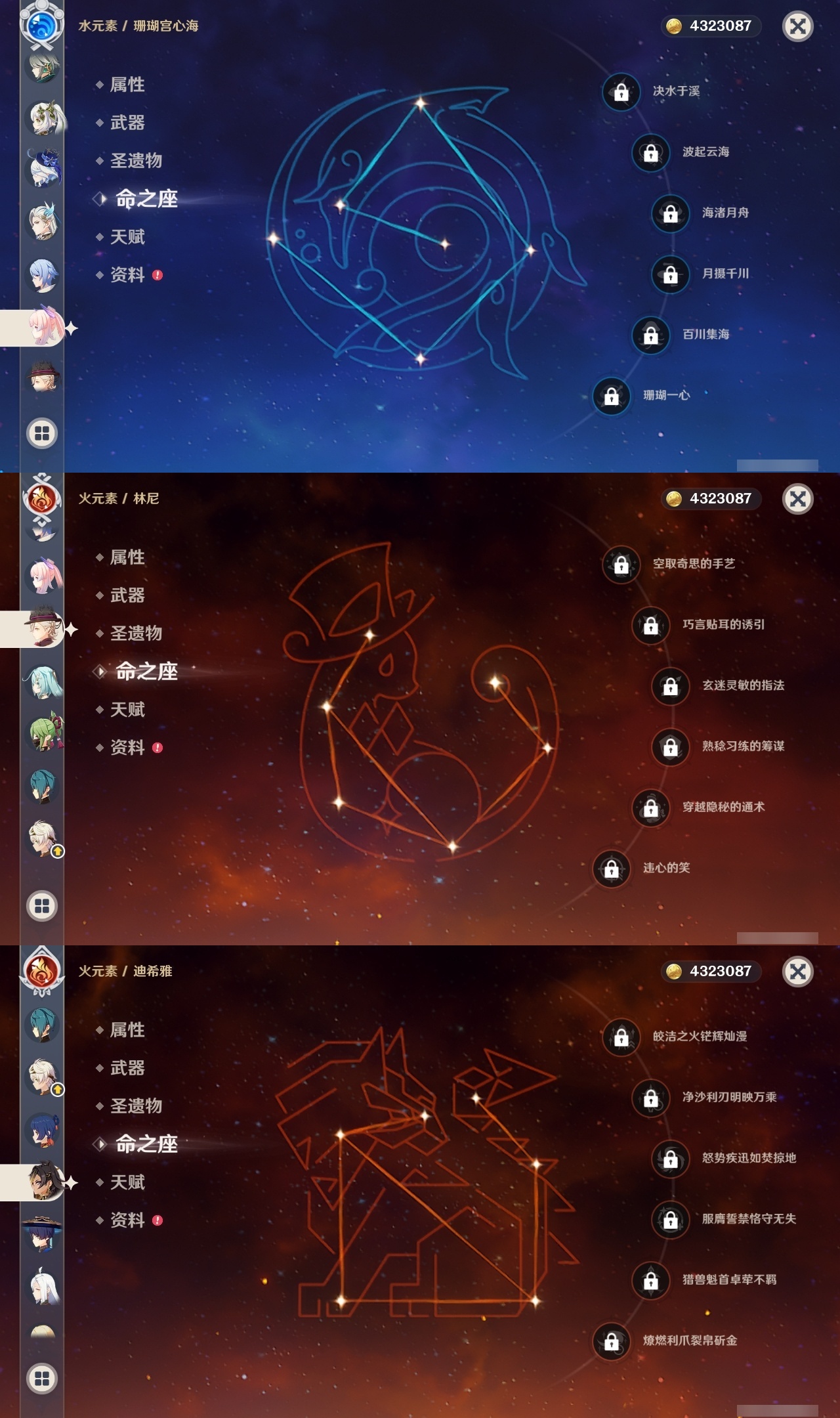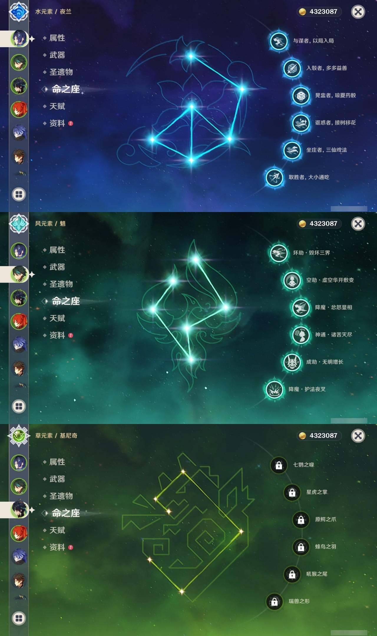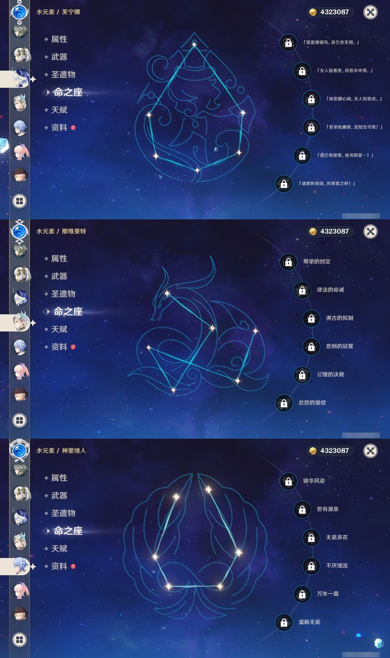 【原神】满命,冒险等级:60,五星数量:42,五星角色:迪卢克 6命魈 6命夜兰 6命提纳里 3命白术 2命刻晴 2命琴 2命七七 1命纳西妲 1命莫娜基尼奇珊瑚宫心海神里绫华迪希雅钟离申鹤神里绫人林尼那维莱特莱欧斯利芙宁娜闲云丝柯克菲林斯艾尔海森流浪者枫原万叶雷电将军__五星武器:和璞鸢 2精裁叶萃光 2精柔灯挽歌冲浪时光岩峰巡歌碧落之珑金流监督静水流涌之辉血染荒城阿莫斯之弓护摩之杖天空之卷天空之翼若水__四星角色:班尼特 6命行秋 6命香菱 6命久岐忍 6命珐露珊 6命凝光 6命砂糖 6命瑶瑶 6命米卡 6命坎蒂丝 6命多莉 6命芭芭拉 6命云堇 6命早柚 6命辛焱 6命罗莎莉亚 6命菲谢尔 6命北斗 6命赛索斯 6命迪奥娜 5命莱依拉 5命欧洛伦 5命五郎 5命雷泽 5命夏洛蒂 5命绮良良 4命柯莱 4命卡维 4命烟绯 4命诺艾尔 4命琳妮特 3命伊安珊 3命九条裟罗 2命鹿野院平藏 2命托马 2命重云 2命夏沃蕾 2命伊法 2命蓝砚 1命菲米尼 1命爱诺 1命卡齐娜嘉明