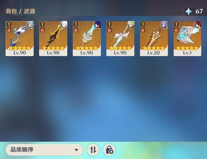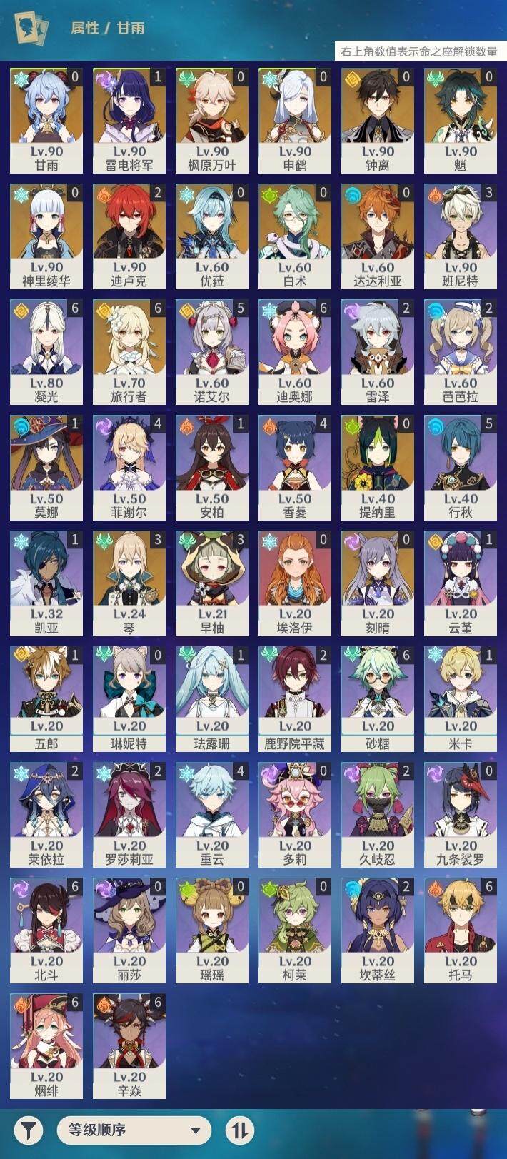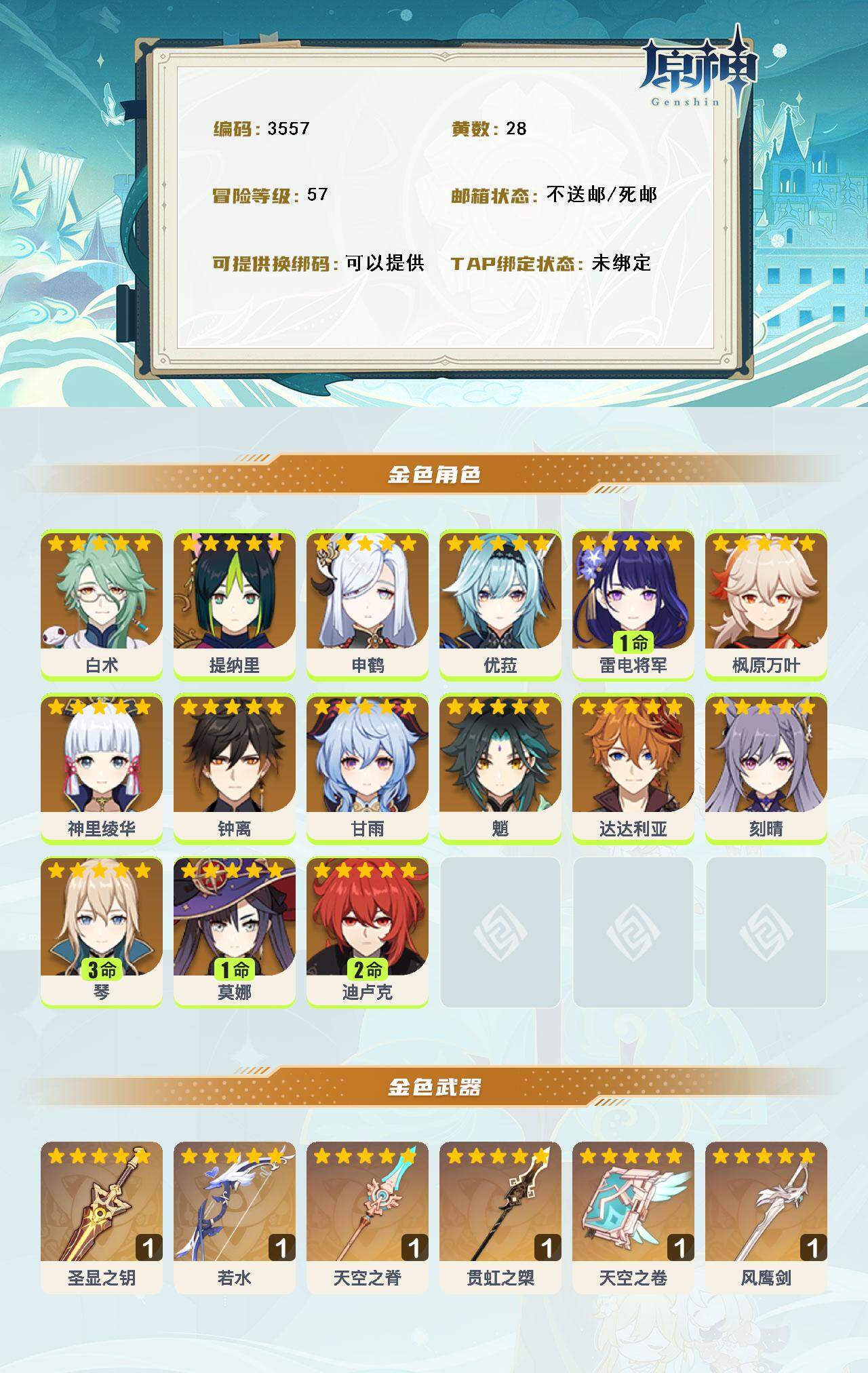 57级/28黄/女主/15个五星角色/6个五星武器 0命白术0命提纳里0命申鹤0命优菈1命雷电将军0命枫原万叶0命神里绫华0命钟离0命甘雨0命魈0命达达利亚0命刻晴3命琴1命莫娜2命迪卢克精1圣显之钥精1若水精1天空之脊精1贯虹之槊精1天空之卷精1风鹰剑