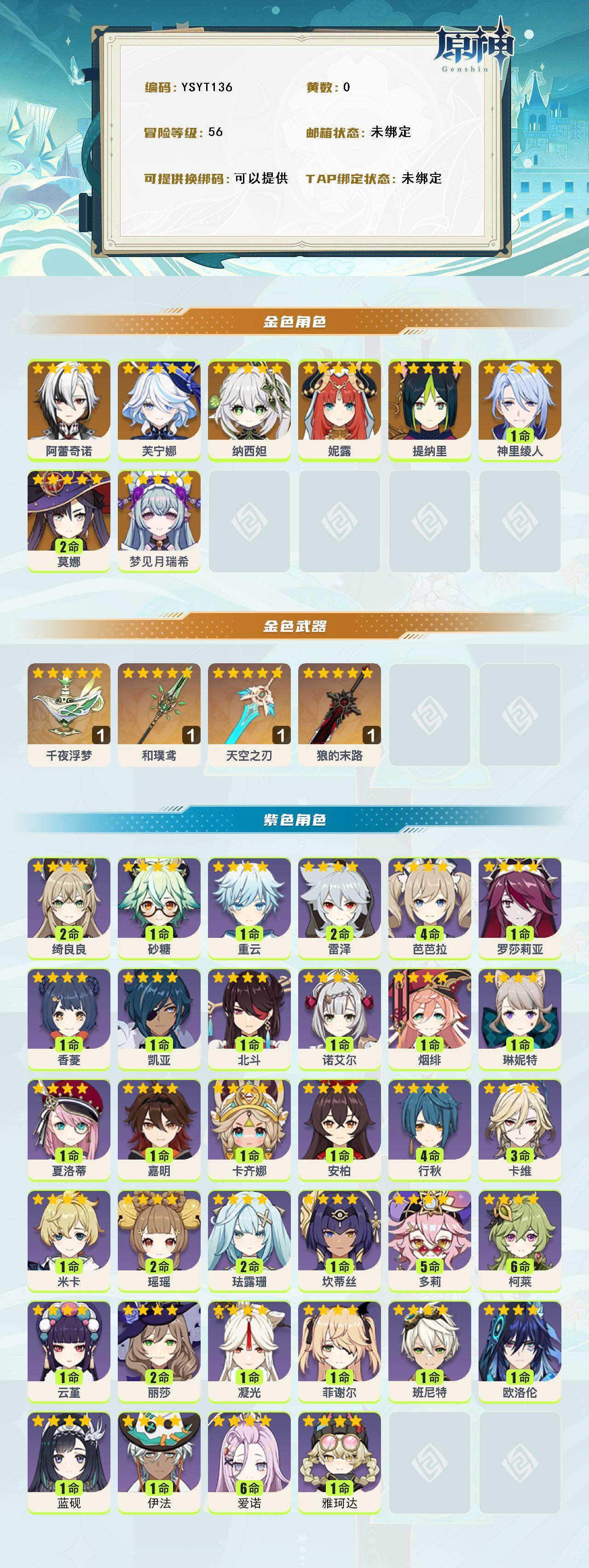 【ysyt136】56级/女主/10个五星角色/0命梦见月瑞希/0命阿蕾奇诺/0命芙宁娜/0命纳西妲/0命妮露/0命提纳里/1命神里绫人/2命莫娜/精1千夜浮梦/精1和璞鸢/精1狼的末路/精1天空之刃/1命雅珂达/满命爱诺/1命伊法/1命蓝砚/0命欧洛伦/1命卡齐娜/0命嘉明/1命夏洛蒂/0命琳妮特/2命绮良良/3命卡维/0命米卡/2命瑶瑶/2命珐露珊/0命坎蒂丝/5命多莉/满命柯莱/1命云堇/0命烟绯/0命罗莎莉亚/1命砂糖/2命雷泽/0命菲谢尔/2命丽莎/1命北斗/1命香菱/0命安柏/0命班尼特/4命行秋/4命芭芭拉/1命凝光/0命诺艾尔/0命凯亚/0命重云