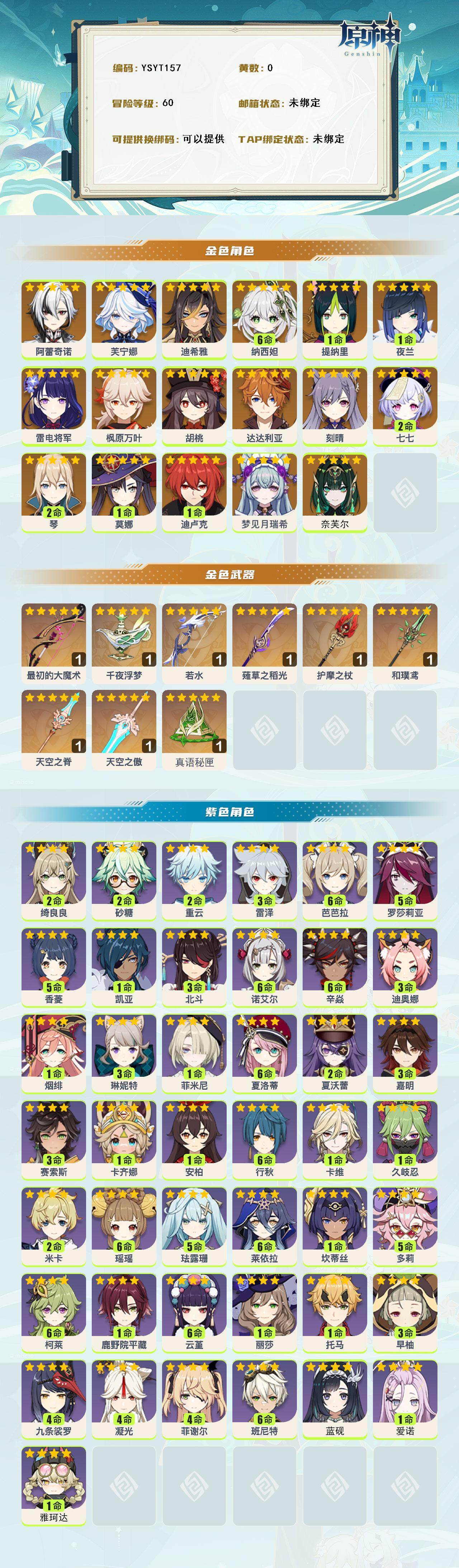 【ysyt157】60级/女主/20个五星角色/0命奈芙尔/0命梦见月瑞希/0命阿蕾奇诺/0命芙宁娜/0命迪希雅/满命纳西妲/1命提纳里/1命夜兰/0命雷电将军/0命枫原万叶/0命胡桃/0命达达利亚/2命琴/0命刻晴/1命迪卢克/1命莫娜/2命七七/精1真语秘匣/精1最初的大魔术/精1千夜浮梦/精1若水/精1薙草之稻光/精1护摩之杖/精1天空之傲/精1和璞鸢/精1天空之脊/1命雅珂达/1命爱诺/0命蓝砚/0命卡齐娜/3命赛索斯/3命嘉明/2命夏沃蕾/满命夏洛蒂/0命菲米尼/3命琳妮特/2命绮良良/0命卡维/2命米卡/满命瑶瑶/5命珐露珊/满命莱依拉/1命坎蒂丝/5命多莉/满命柯莱/1命鹿野院平藏/1命久岐忍/满命云堇/0命托马/4命九条裟罗/3命早柚/1命烟绯/5命罗莎莉亚/满命辛焱/3命迪奥娜/2命砂糖/3命雷泽/4命菲谢尔/0命丽莎/3命北斗/5命香菱/1命安柏/满命班尼特/满命行秋/满命芭芭拉/4命凝光/满命诺艾尔/1命凯亚/2命重云