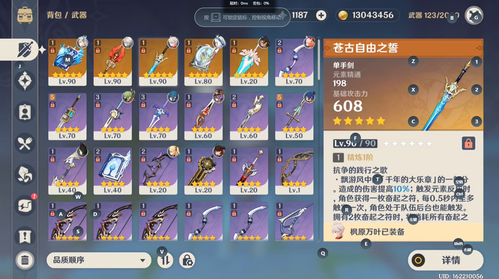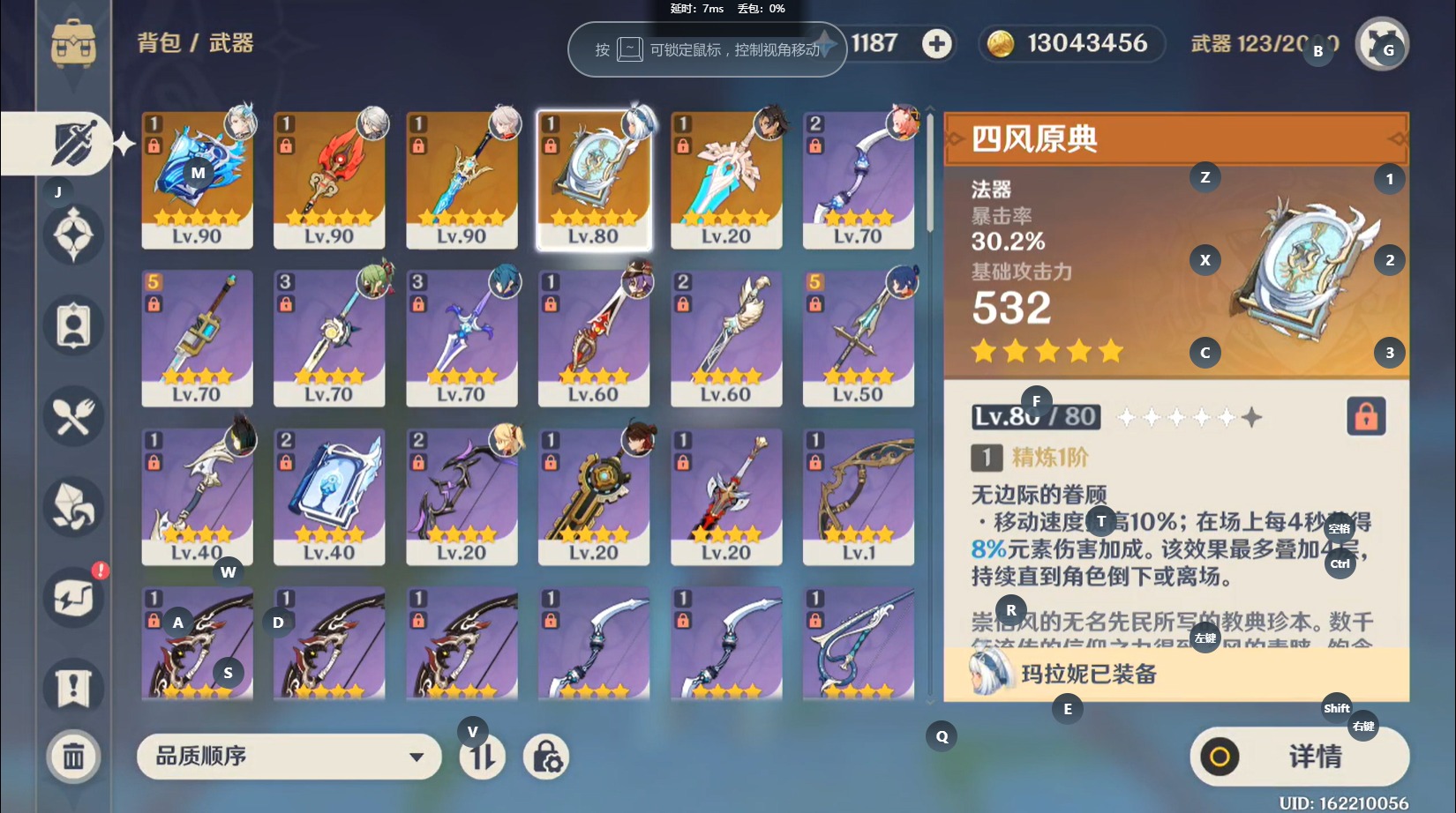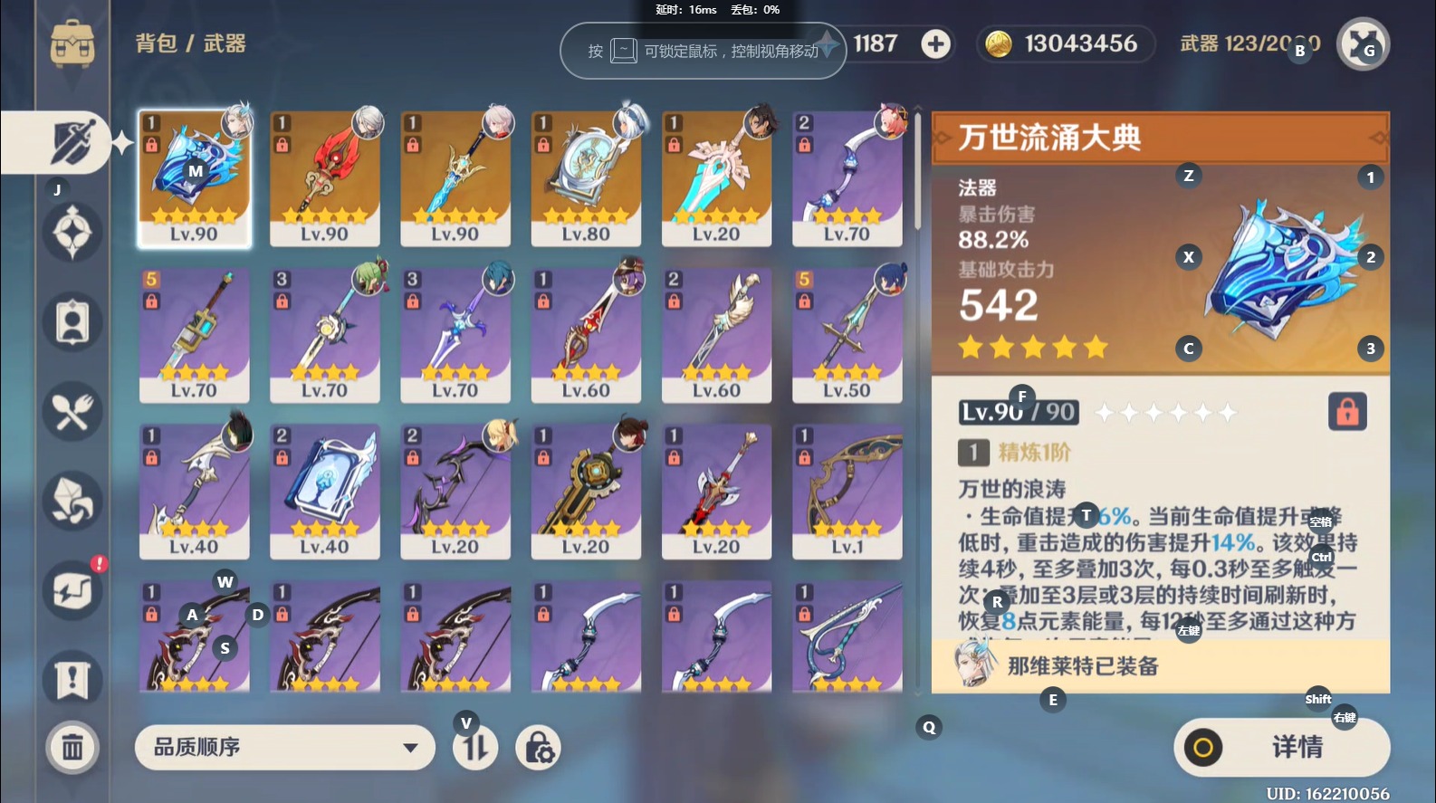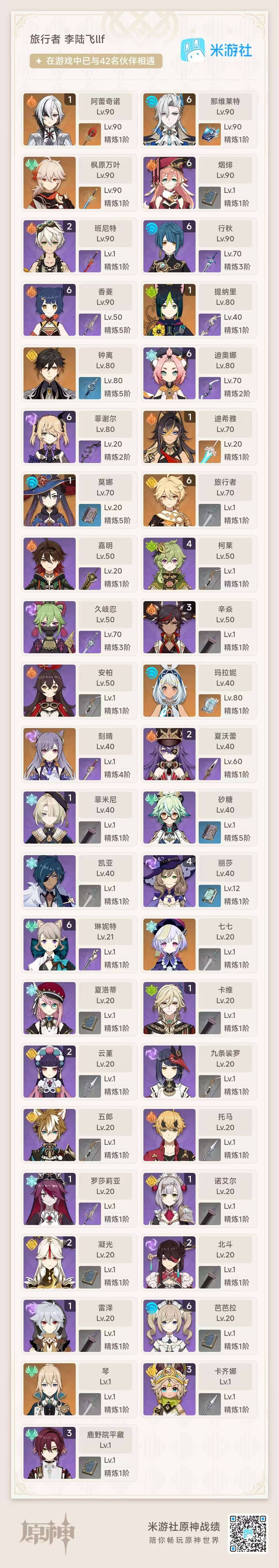 [14397732]【总黄数】:16 【冒险等级】:57 【6命金色角色】:满命那维莱特 【1命金色角色】:一命阿蕾奇诺一命迪希雅一命提纳里一命莫娜 【0命金色角色】:玛拉妮枫原万叶钟离刻晴琴七七 【1精武器】:万世流涌大典苍古自由之誓护摩之杖天空之傲四风原典