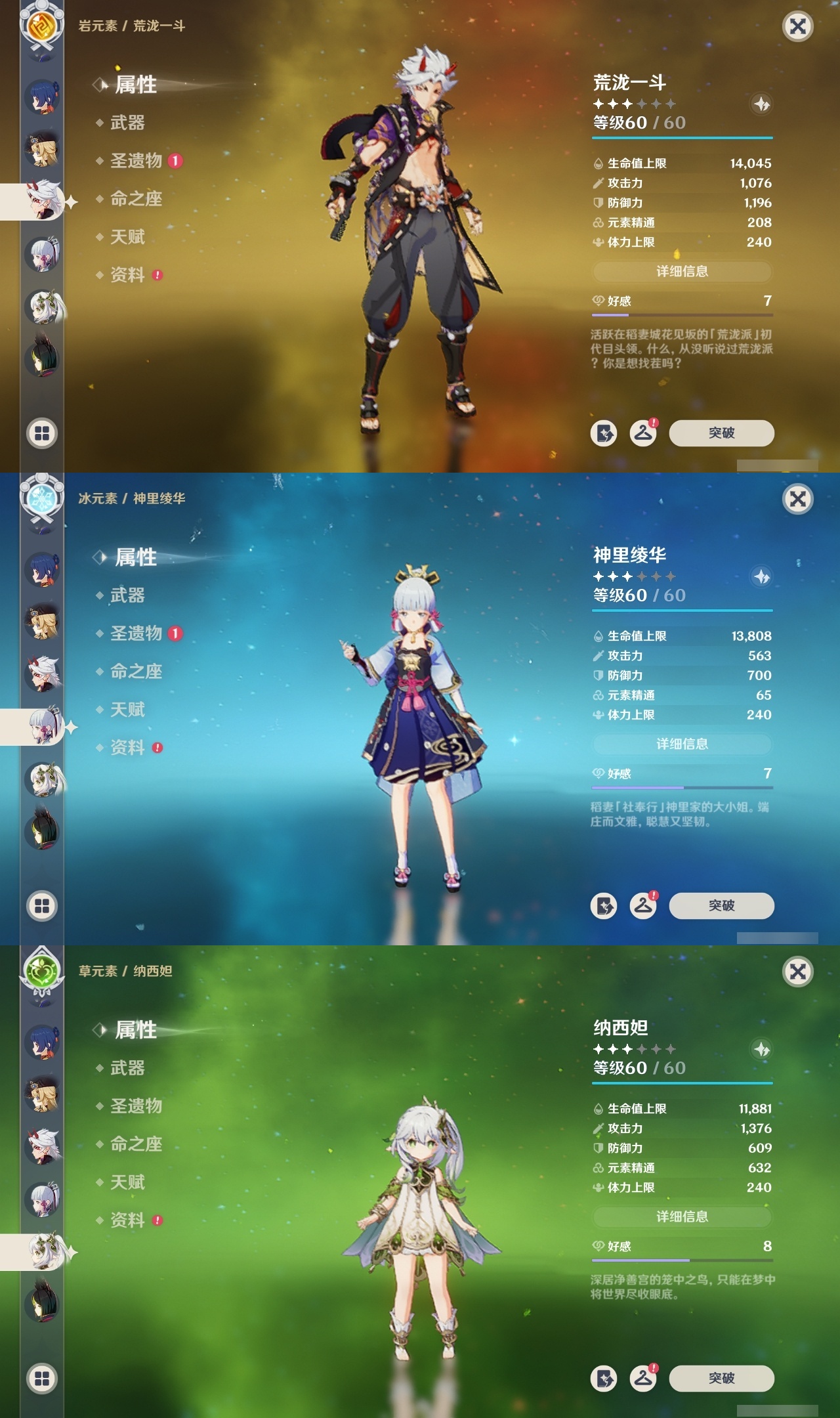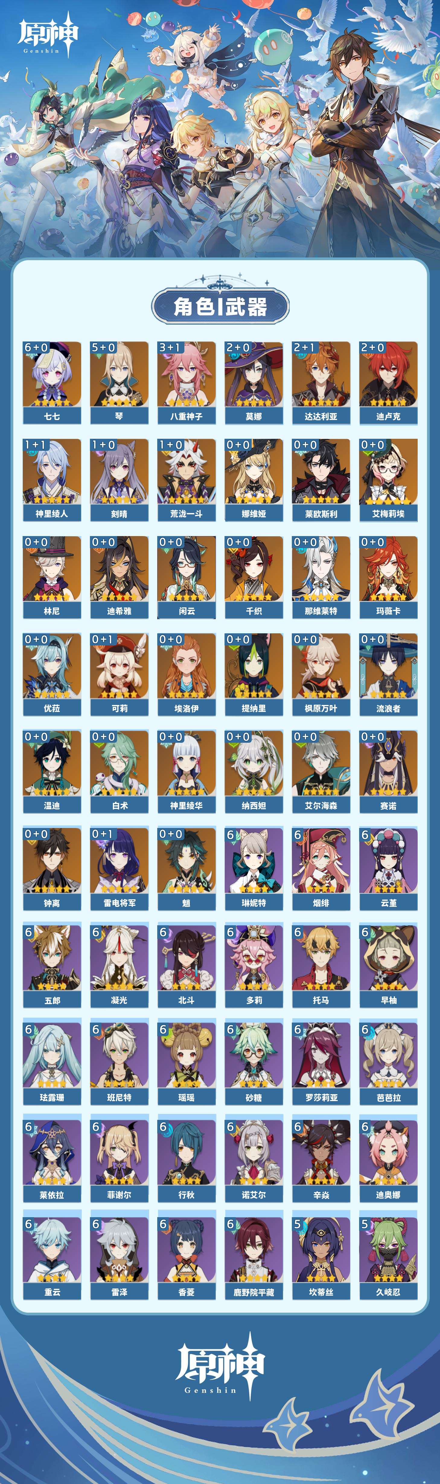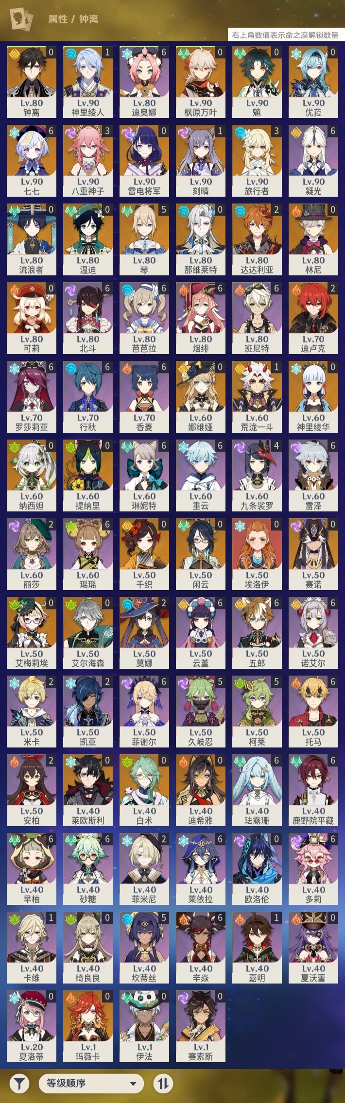【原神】【lyys8919】冒险等级:60,五星数量:42,五星角色:七七 6命琴 5命八重神子 3命达达利亚 2命迪卢克 2命莫娜 2命刻晴 1命荒泷一斗 1命神里绫人 1命艾梅莉埃白术神里绫华温迪玛薇卡优菈迪希雅钟离林尼那维莱特莱欧斯利娜维娅提纳里闲云千织赛诺纳西妲艾尔海森流浪者枫原万叶魈可莉雷电将军__五星武器:阿莫斯之弓四风原典天空之傲天空之脊无工之剑薙草之稻光冬极白星神乐之真意波乱月白经津__四星角色:班尼特 6命行秋 6命香菱 6命鹿野院平藏 6命珐露珊 6命凝光 6命迪奥娜 6命砂糖 6命瑶瑶 6命莱依拉 6命多莉 6命芭芭拉 6命云堇 6命早柚 6命托马 6命五郎 6命烟绯 6命重云 6命辛焱 6命诺艾尔 6命罗莎莉亚 6命雷泽 6命菲谢尔 6命北斗 6命琳妮特 6命久岐忍 5命坎蒂丝 5命柯莱 5命九条裟罗 4命米卡 2命菲米尼 2命卡维 1命嘉明 1命埃洛伊绮良良欧洛伦夏洛蒂夏沃蕾伊法赛索斯