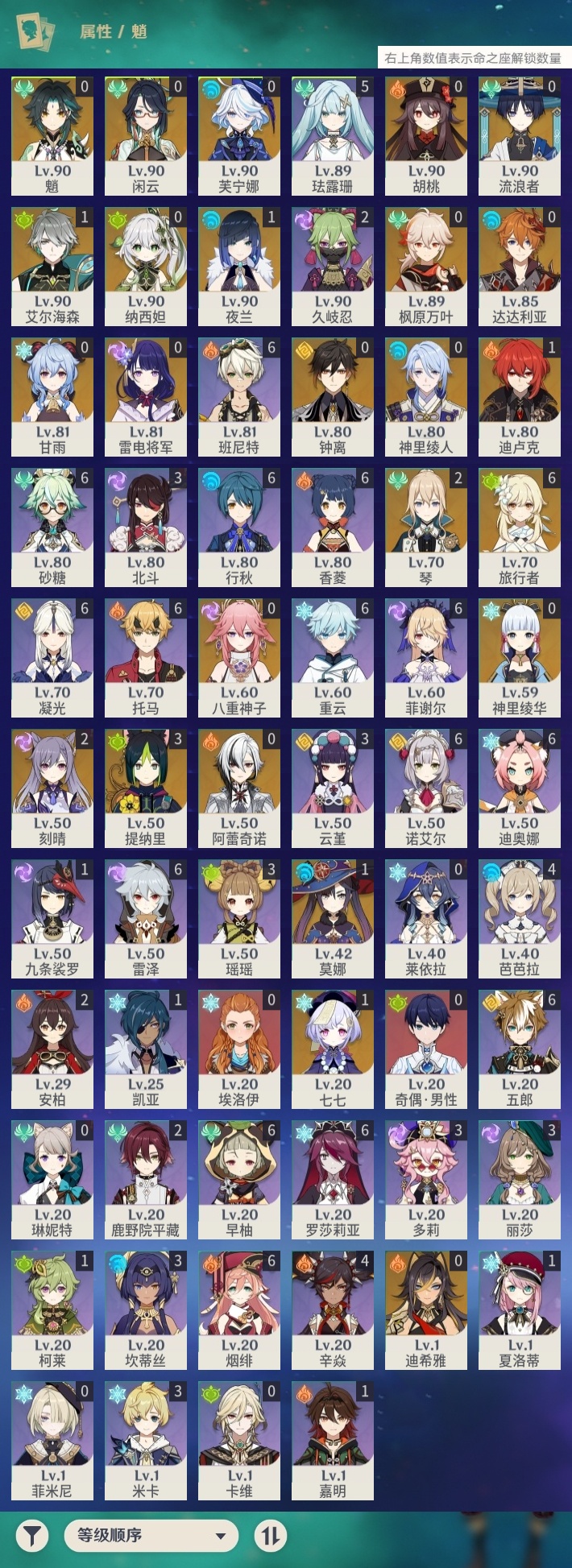 【原神】【lyys8918】冒险等级:60,五星数量:35,五星角色:提纳里 3命刻晴 2命琴 2命迪卢克 1命莫娜 1命七七 1命夜兰 1命艾尔海森 1命神里绫华迪希雅钟离达达利亚八重神子神里绫人芙宁娜闲云阿蕾奇诺纳西妲流浪者枫原万叶甘雨魈胡桃雷电将军__五星武器:护摩之杖 2精苍古自由之誓和璞鸢四风原典天空之刃薙草之稻光冬极白星波乱月白经津若水__四星角色:班尼特 6命行秋 6命香菱 6命凝光 6命迪奥娜 6命砂糖 6命早柚 6命托马 6命五郎 6命烟绯 6命重云 6命诺艾尔 6命罗莎莉亚 6命雷泽 6命菲谢尔 6命珐露珊 5命芭芭拉 4命辛焱 4命瑶瑶 3命米卡 3命坎蒂丝 3命多莉 3命云堇 3命北斗 3命久岐忍 2命鹿野院平藏 2命九条裟罗 1命柯莱 1命夏洛蒂 1命嘉明 1命埃洛伊奇偶·男性莱依拉卡维菲米尼琳妮特