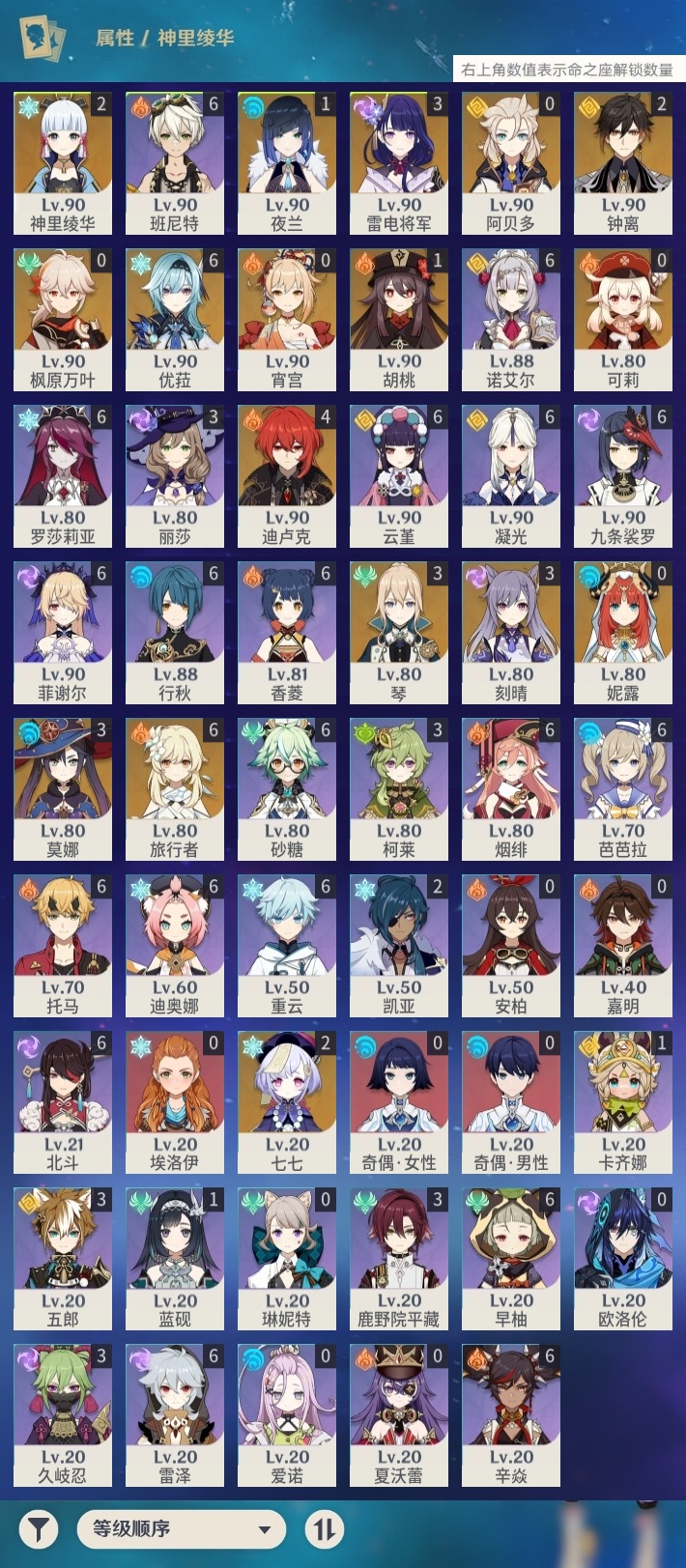 【原神】【lyys8972】冒险等级:60,五星数量:32,五星角色:优菈 6命迪卢克 4命刻晴 3命雷电将军 3命莫娜 3命琴 3命七七 2命神里绫华 2命钟离 2命胡桃 1命夜兰 1命宵宫阿贝多妮露枫原万叶可莉__五星武器:松籁响起之时 3精天空之脊 2精雾切之回光 2精薙草之稻光 2精风鹰剑护摩之杖狼的末路磐岩结绿四风原典天空之刃天空之翼无工之剑终末嗟叹之诗__四星角色:班尼特 6命行秋 6命九条裟罗 6命香菱 6命凝光 6命迪奥娜 6命砂糖 6命芭芭拉 6命云堇 6命早柚 6命托马 6命烟绯 6命重云 6命辛焱 6命诺艾尔 6命罗莎莉亚 6命雷泽 6命菲谢尔 6命北斗 6命久岐忍 3命鹿野院平藏 3命柯莱 3命五郎 3命卡齐娜 1命蓝砚 1命埃洛伊奇偶·女性奇偶·男性欧洛伦琳妮特夏沃蕾嘉明爱诺带300抽