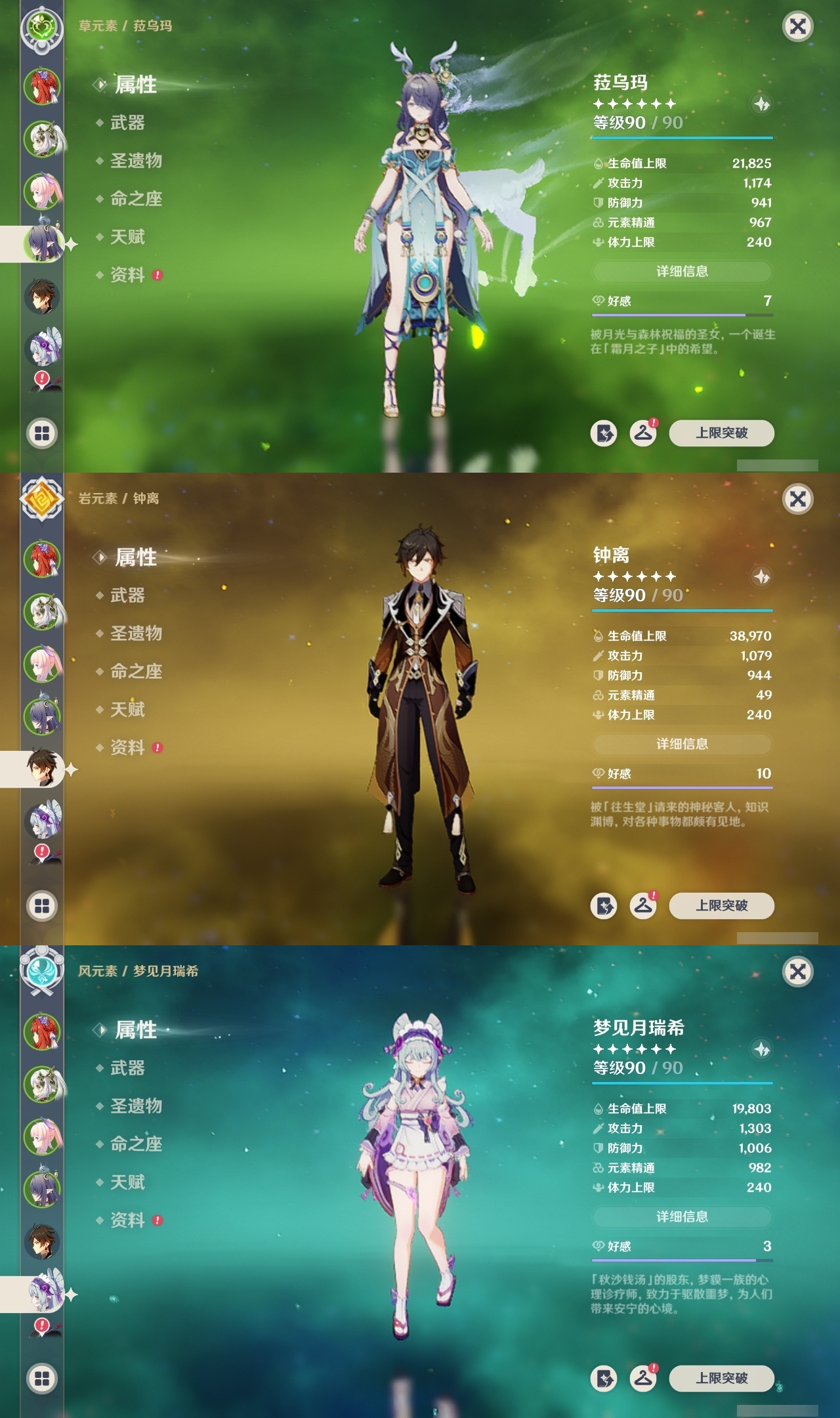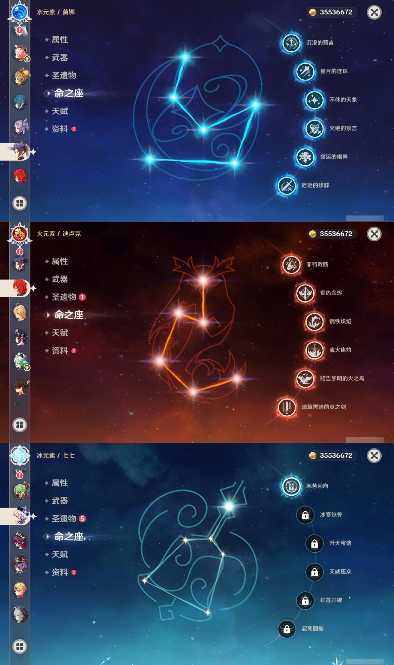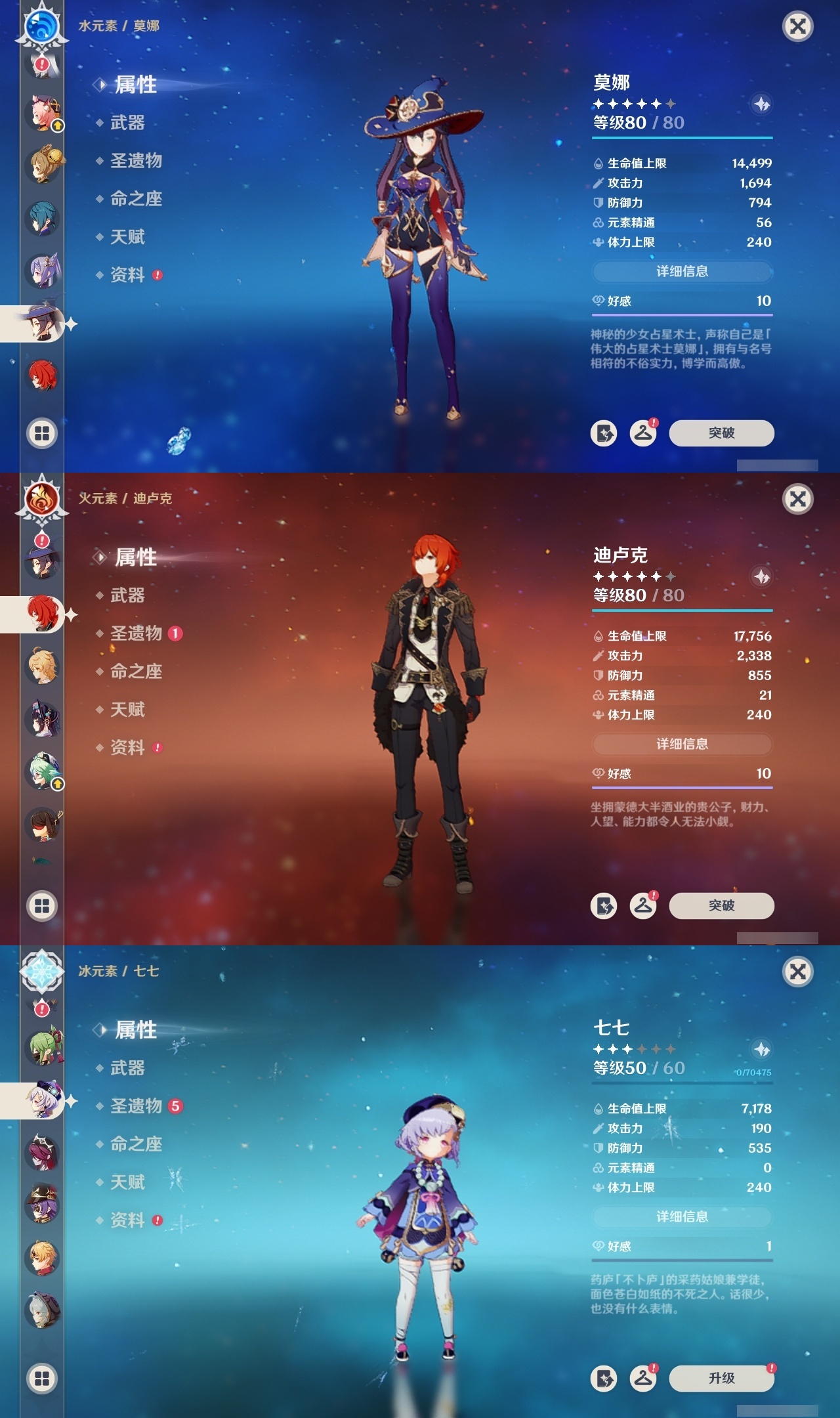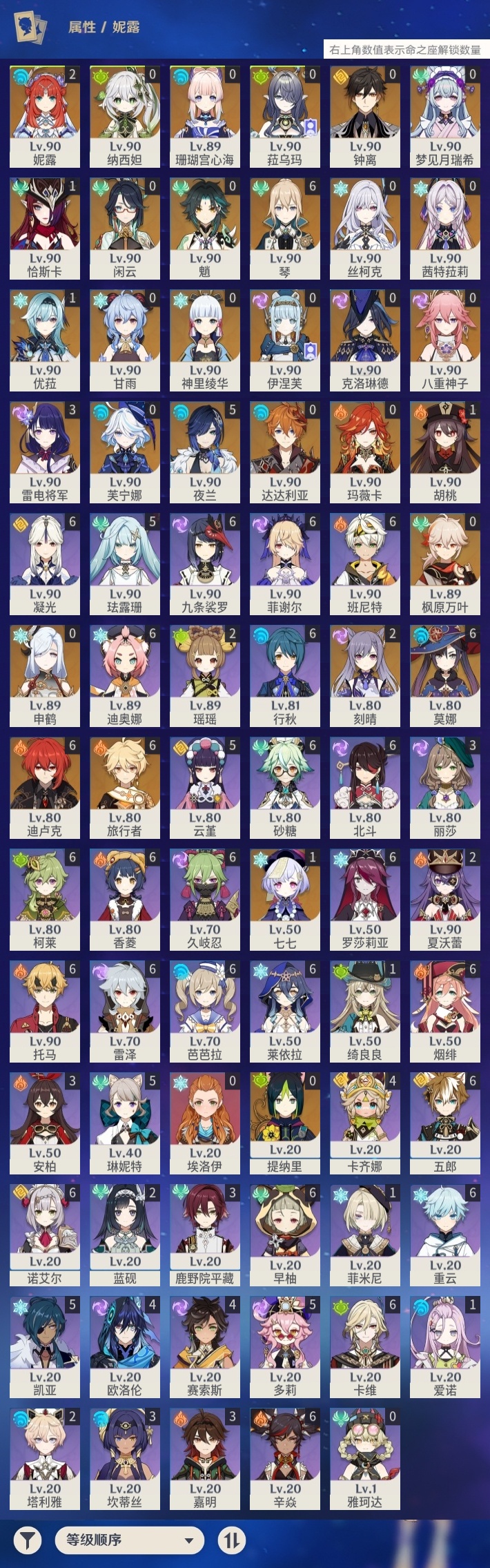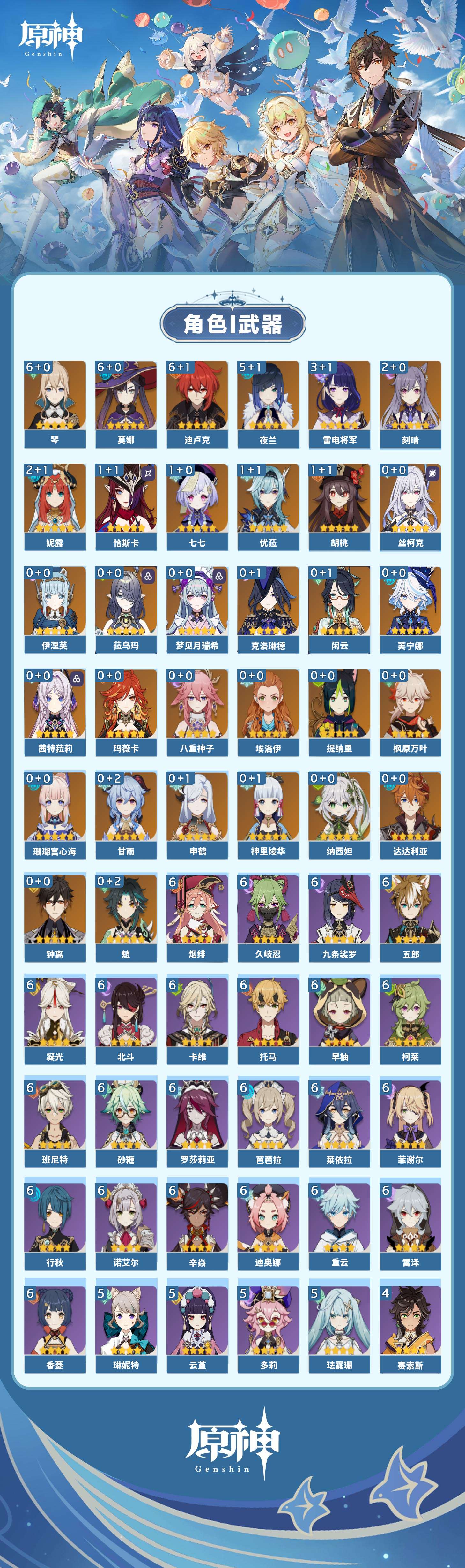 【原神】满命,冒险等级:60,五星数量:50,五星角色:迪卢克 6命莫娜 6命琴 6命夜兰 5命雷电将军 3命刻晴 2命妮露 2命恰斯卡 1命胡桃 1命七七 1命优菈 1命珊瑚宫心海神里绫华玛薇卡茜特菈莉钟离达达利亚梦见月瑞希申鹤八重神子芙宁娜提纳里闲云丝柯克伊涅芙纳西妲菈乌玛枫原万叶甘雨魈克洛琳德__五星武器:阿莫斯之弓 2精和璞鸢 2精星鹫赤羽鹤鸣余音护摩之杖狼的末路四风原典松籁响起之时天空之脊天空之卷天空之翼无工之剑雾切之回光薙草之稻光息灾若水圣显之钥赦罪__四星角色:班尼特 6命行秋 6命九条裟罗 6命香菱 6命久岐忍 6命凝光 6命迪奥娜 6命砂糖 6命莱依拉 6命柯莱 6命卡维 6命芭芭拉 6命早柚 6命托马 6命五郎 6命烟绯 6命重云 6命辛焱 6命诺艾尔 6命罗莎莉亚 6命雷泽 6命菲谢尔 6命北斗 6命珐露珊 5命多莉 5命云堇 5命琳妮特 5命卡齐娜 4命欧洛伦 4命赛索斯 4命鹿野院平藏 3命坎蒂丝 3命嘉明 3命瑶瑶 2命蓝砚 2命夏沃蕾 2命塔利雅 2命绮良良 1命菲米尼 1命爱诺 1命埃洛伊