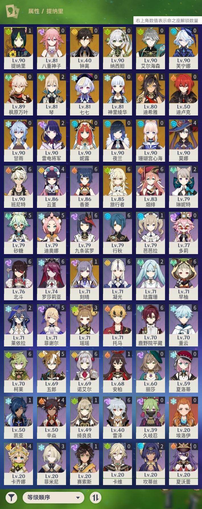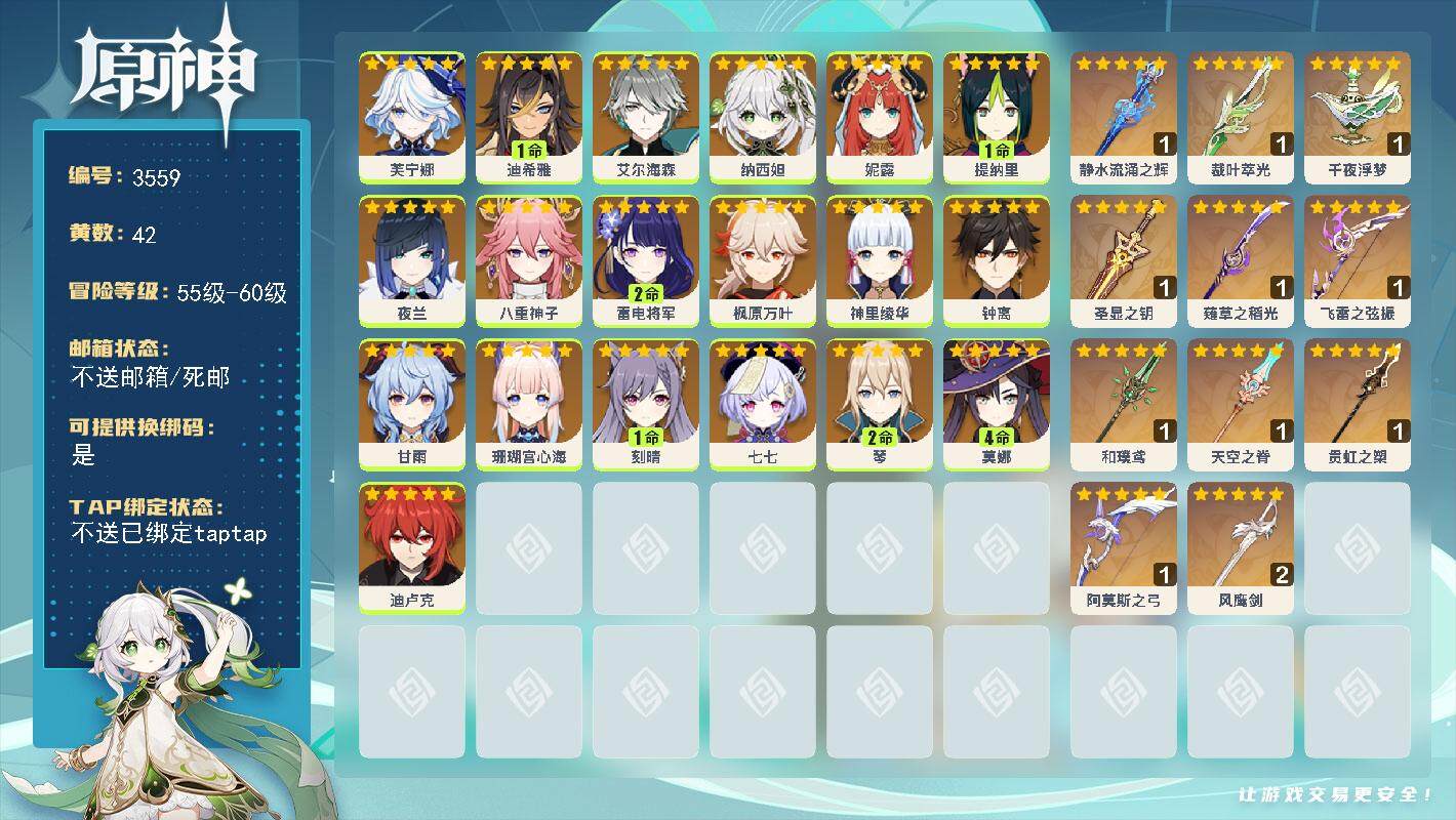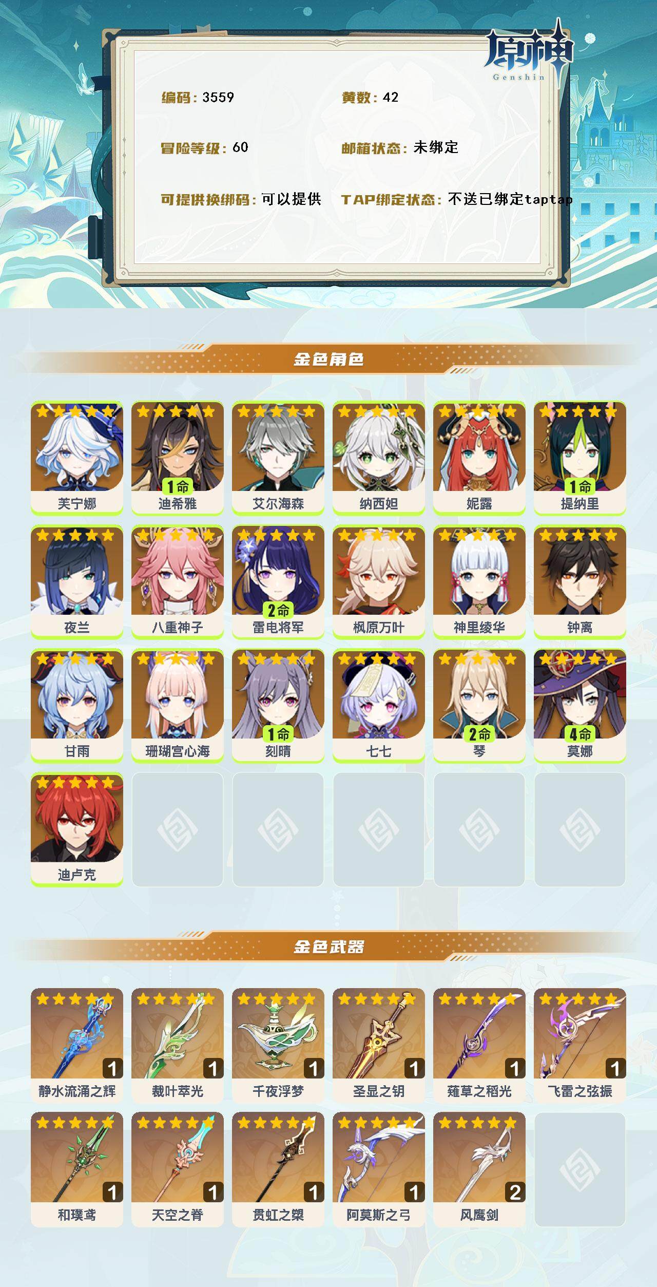 60级/42黄/女主/19个五星角色/11个五星武器 0命芙宁娜1命迪希雅0命艾尔海森0命纳西妲0命妮露1命提纳里0命夜兰0命八重神子2命雷电将军0命枫原万叶0命神里绫华0命钟离0命甘雨0命珊瑚宫心海1命刻晴0命七七2命琴4命莫娜0命迪卢克精1静水流涌之辉精1裁叶萃光精1千夜浮梦精1圣显之钥精1薙草之稻光精1飞雷之弦振精1和璞鸢精1天空之脊精1贯虹之槊精1阿莫斯之弓精2风鹰剑
