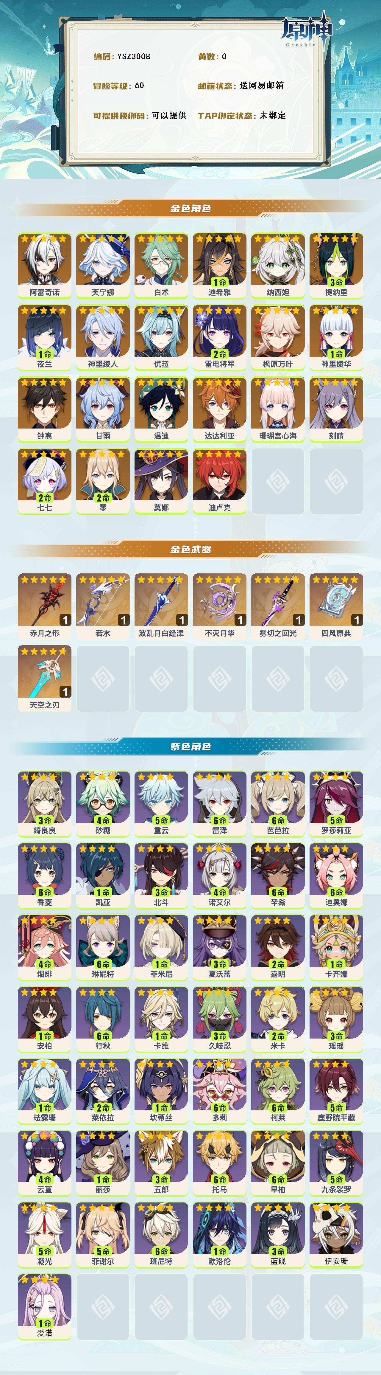 【ysz3008】60级/女主/24个五星角色/0命阿蕾奇诺/0命芙宁娜/0命白术/1命迪希雅/0命纳西妲/3命提纳里/1命夜兰/0命神里绫人/0命珊瑚宫心海/2命雷电将军/1命神里绫华/0命枫原万叶/0命优菈/0命甘雨/0命钟离/0命达达利亚/0命温迪/2命琴/0命刻晴/0命迪卢克/0命莫娜/2命七七/精1赤月之形/精1若水/精1波乱月白经津/精1不灭月华/精1雾切之回光/精1四风原典/精1天空之刃/1命爱诺/0命伊安珊/3命蓝砚/0命欧洛伦/0命卡齐娜/2命嘉明/3命夏沃蕾/1命菲米尼/满命琳妮特/3命绮良良/0命卡维/2命米卡/3命瑶瑶/0命珐露珊/2命莱依拉/1命坎蒂丝/满命多莉/满命柯莱/5命鹿野院平藏/3命久岐忍/4命云堇/3命五郎/满命托马/5命九条裟罗/满命早柚/4命烟绯/5命罗莎莉亚/满命辛焱/满命迪奥娜/4命砂糖/满命雷泽/5命菲谢尔/0命丽莎/3命北斗/满命香菱/0命安柏/满命班尼特/满命行秋/满命芭芭拉/5命凝光/4命诺艾尔/0命凯亚/5命重云