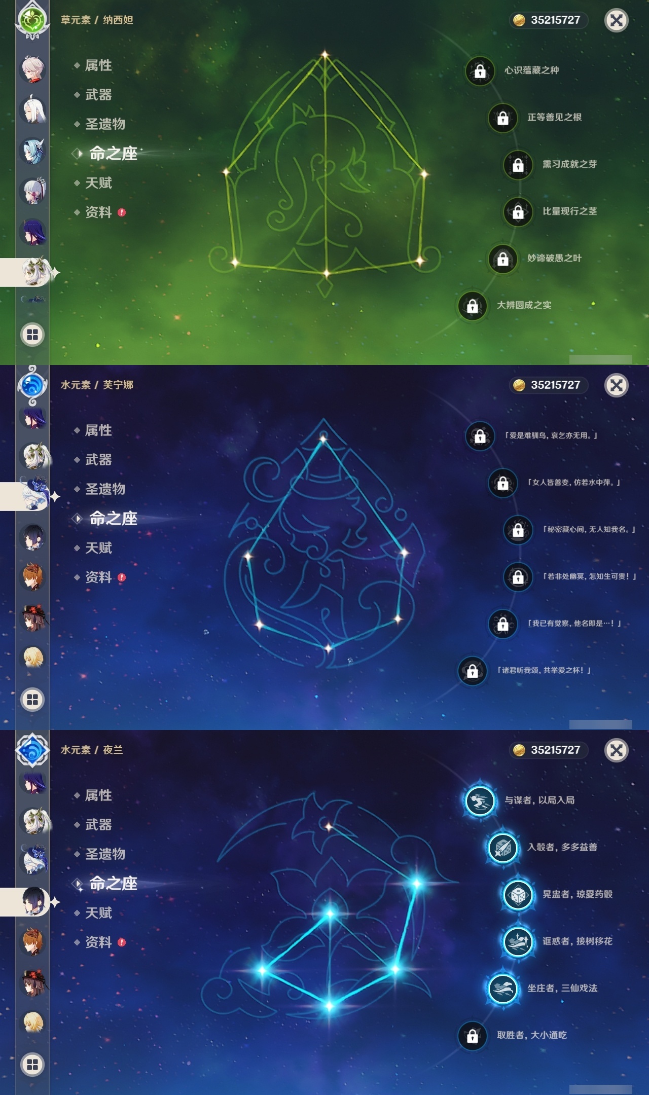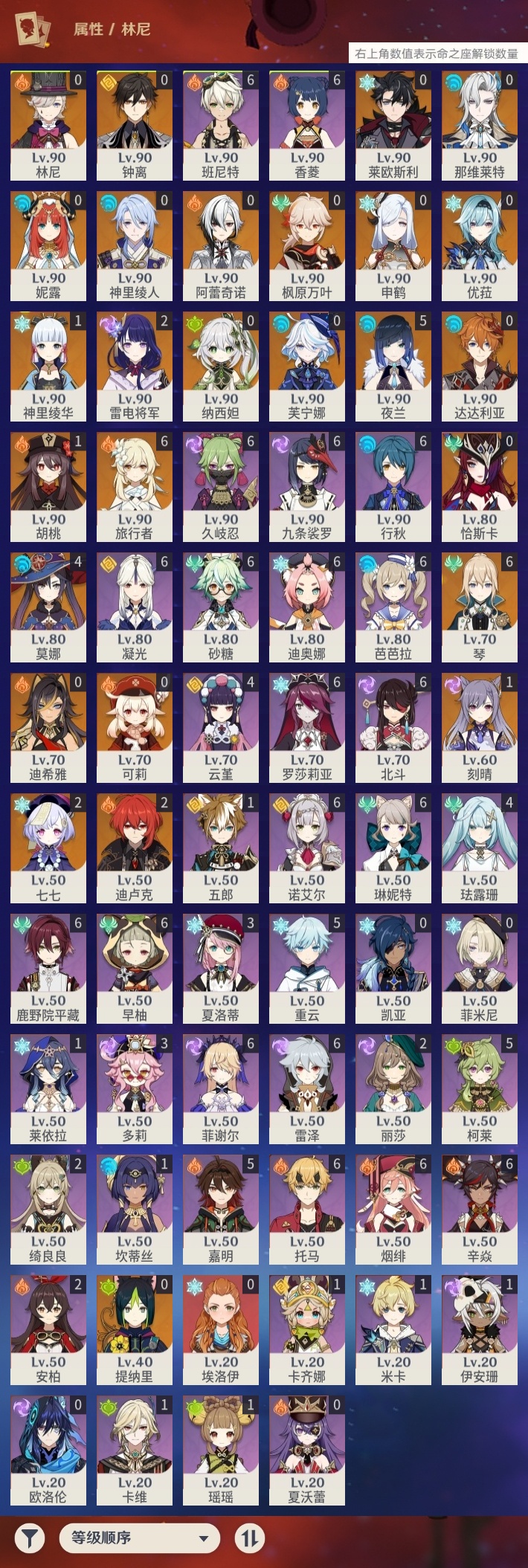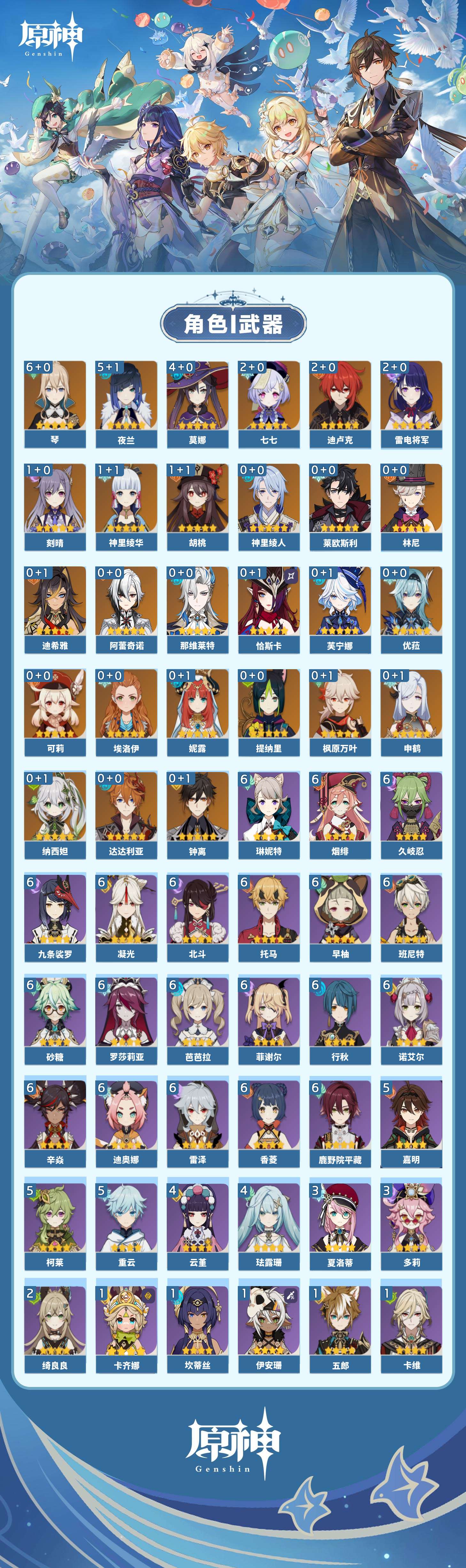 【原神】【lyys9019】冒险等级:60,五星数量:46,五星角色:琴 6命夜兰 5命莫娜 4命迪卢克 2命雷电将军 2命七七 2命胡桃 1命刻晴 1命神里绫华 1命恰斯卡优菈迪希雅钟离达达利亚申鹤神里绫人林尼那维莱特莱欧斯利芙宁娜提纳里阿蕾奇诺妮露纳西妲枫原万叶可莉__五星武器:星鹫赤羽苇海信标静水流涌之辉阿莫斯之弓苍古自由之誓风鹰剑和璞鸢护摩之杖天空之傲天空之卷天空之刃天空之翼雾切之回光终末嗟叹之诗息灾贯虹之槊若水圣显之钥千夜浮梦__四星角色:班尼特 6命行秋 6命九条裟罗 6命香菱 6命久岐忍 6命鹿野院平藏 6命凝光 6命迪奥娜 6命砂糖 6命芭芭拉 6命早柚 6命托马 6命烟绯 6命辛焱 6命诺艾尔 6命罗莎莉亚 6命雷泽 6命菲谢尔 6命北斗 6命琳妮特 6命柯莱 5命重云 5命嘉明 5命珐露珊 4命云堇 4命多莉 3命夏洛蒂 3命绮良良 2命卡齐娜 1命瑶瑶 1命莱依拉 1命米卡 1命坎蒂丝 1命卡维 1命五郎 1命伊安珊 1命埃洛伊欧洛伦菲米尼夏沃蕾