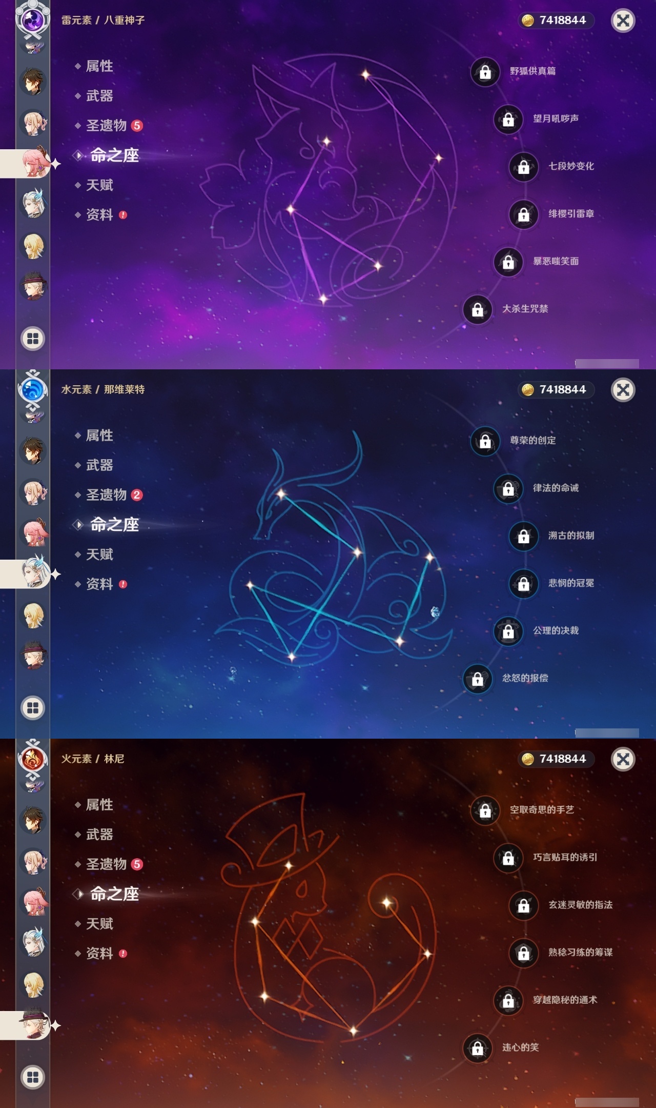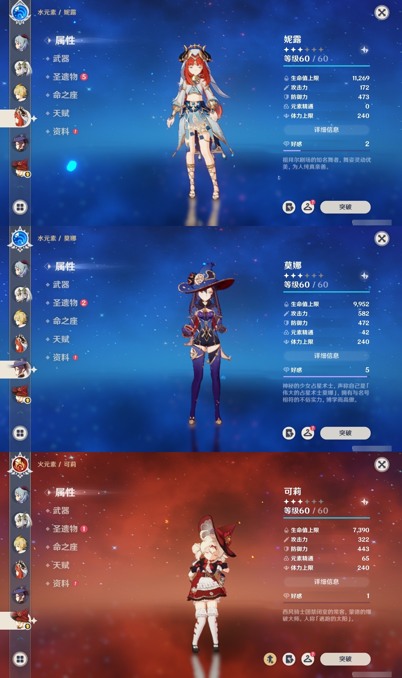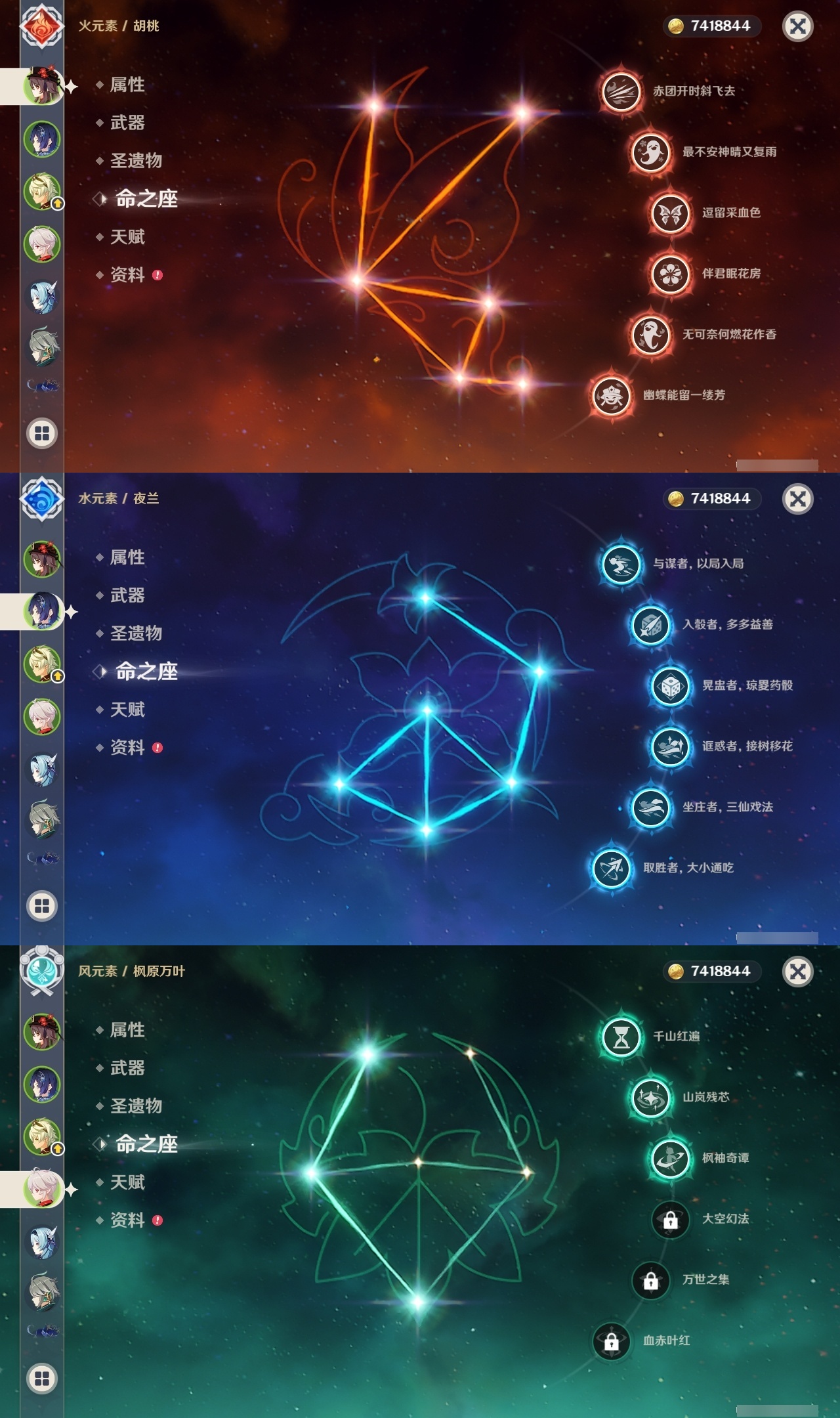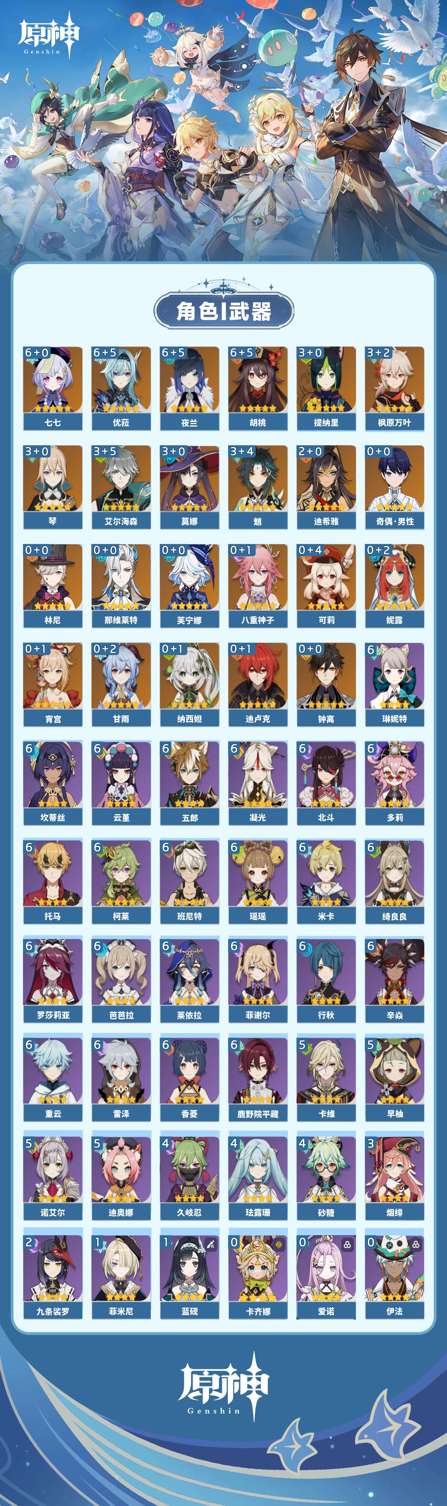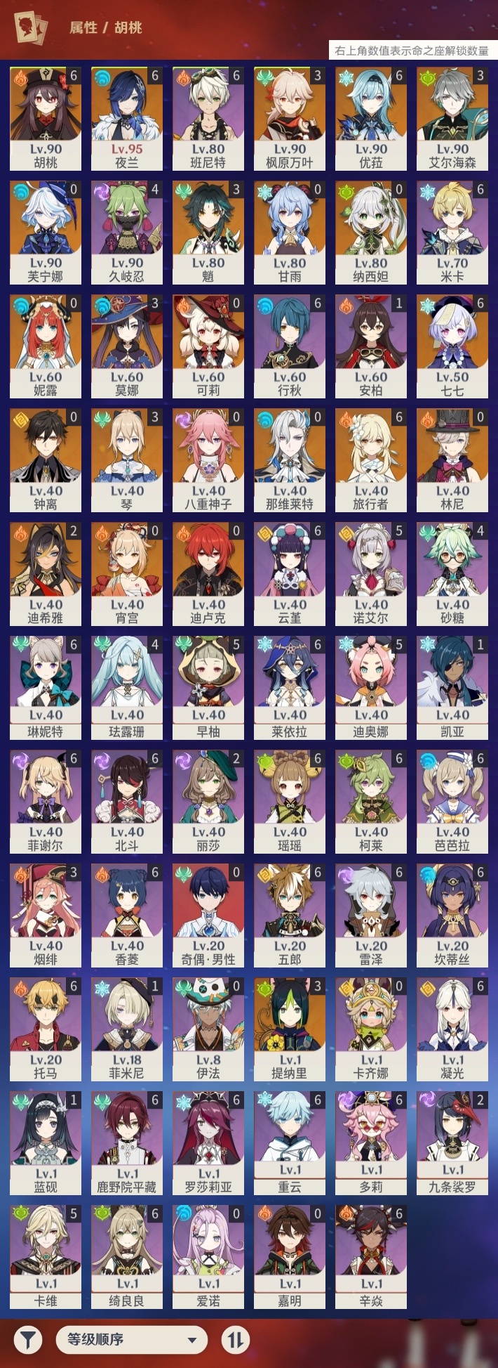 【原神】满命,冒险等级:56,五星数量:40,五星角色:胡桃 6命七七 6命优菈 6命夜兰 6命枫原万叶 3命魈 3命莫娜 3命琴 3命提纳里 3命艾尔海森 3命迪希雅 2命宵宫钟离八重神子林尼那维莱特芙宁娜妮露纳西妲迪卢克甘雨可莉__五星武器:护摩之杖 5精松籁响起之时 5精若水 5精裁叶萃光 5精和璞鸢 4精四风原典 4精天空之脊 3精阿莫斯之弓 2精苍古自由之誓 2精风鹰剑 2精天空之翼 2精圣显之钥 2精飞雷之弦振狼的末路天空之卷神乐之真意千夜浮梦__四星角色:班尼特 6命行秋 6命香菱 6命鹿野院平藏 6命凝光 6命绮良良 6命瑶瑶 6命莱依拉 6命米卡 6命坎蒂丝 6命多莉 6命柯莱 6命芭芭拉 6命云堇 6命托马 6命五郎 6命重云 6命辛焱 6命罗莎莉亚 6命雷泽 6命菲谢尔 6命北斗 6命琳妮特 6命迪奥娜 5命卡维 5命早柚 5命诺艾尔 5命久岐忍 4命珐露珊 4命砂糖 4命烟绯 3命九条裟罗 2命蓝砚 1命菲米尼 1命奇偶·男性卡齐娜嘉明伊法爱诺带159抽