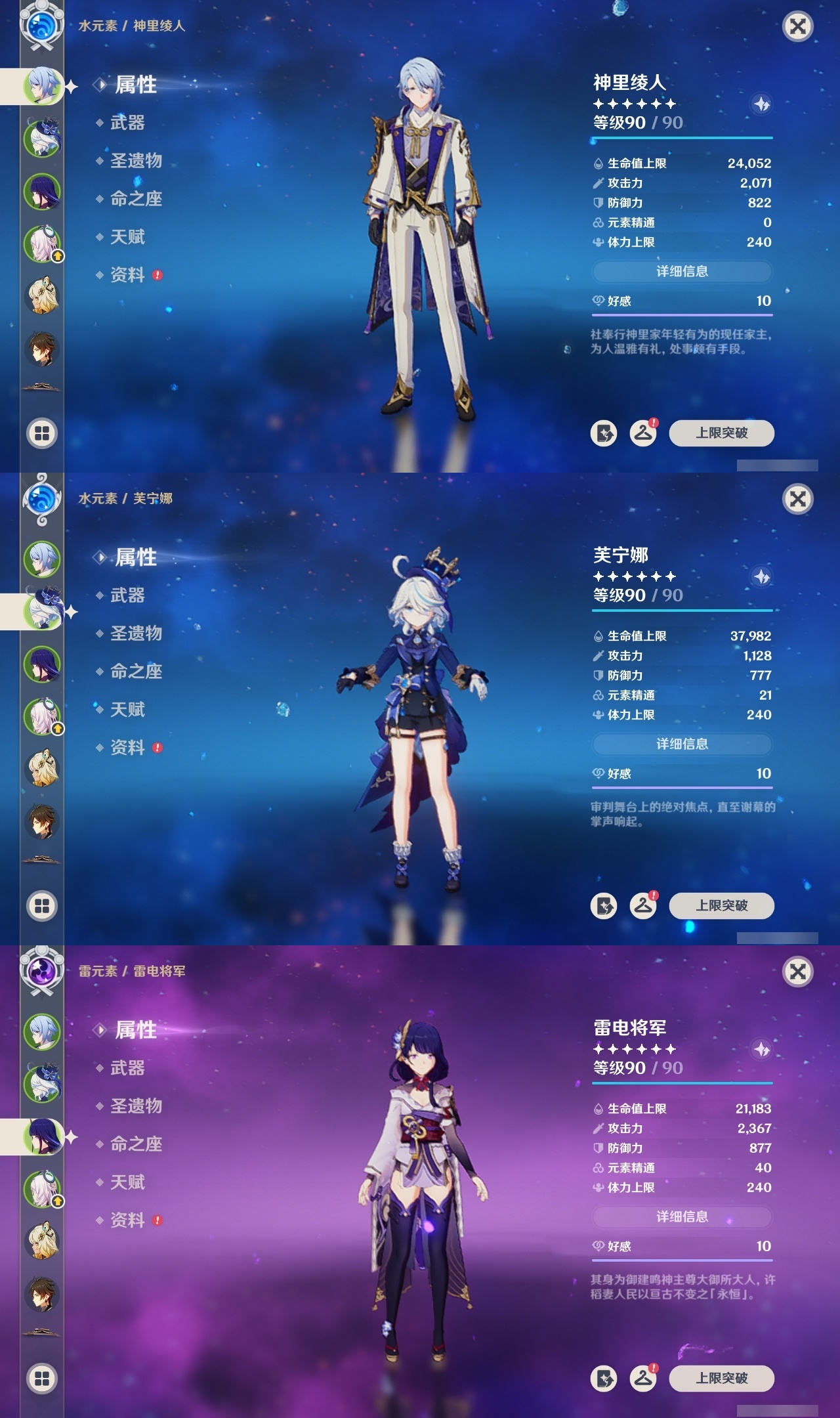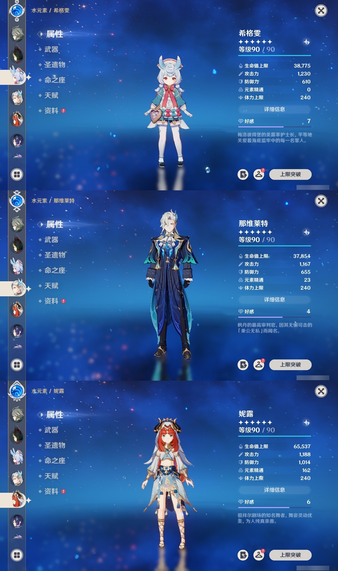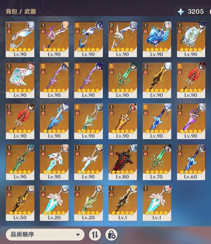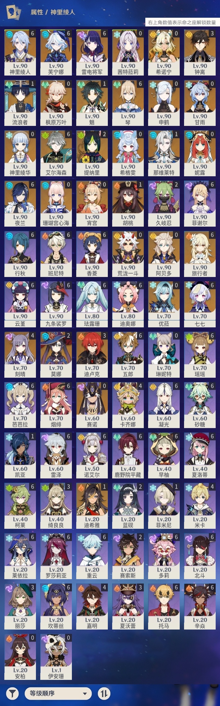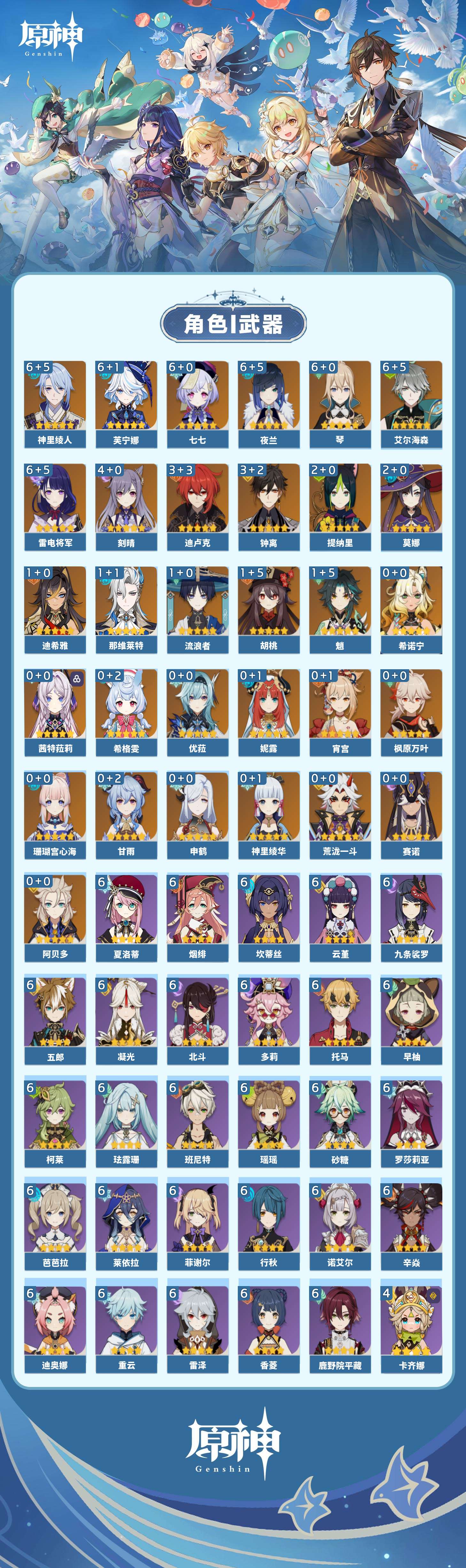 【原神】满命,冒险等级:60,五星数量:53,五星角色:芙宁娜 6命雷电将军 6命七七 6命琴 6命神里绫人 6命夜兰 6命艾尔海森 6命刻晴 4命迪卢克 3命钟离 3命莫娜 2命提纳里 2命迪希雅 1命那维莱特 1命魈 1命胡桃 1命流浪者 1命珊瑚宫心海希诺宁神里绫华茜特菈莉宵宫优菈荒泷一斗申鹤阿贝多赛诺妮露枫原万叶甘雨希格雯__五星武器:和璞鸢 5精护摩之杖 5精薙草之稻光 5精波乱月白经津 5精若水 5精裁叶萃光 5精狼的末路 3精阿莫斯之弓 2精天空之傲 2精天空之刃 2精贯虹之槊 2精白雨心弦 2精万世流涌大典静水流涌之辉飞雷之弦振风鹰剑磐岩结绿四风原典天空之卷雾切之回光斫峰之刃圣显之钥__四星角色:班尼特 6命行秋 6命九条裟罗 6命香菱 6命鹿野院平藏 6命珐露珊 6命凝光 6命迪奥娜 6命砂糖 6命瑶瑶 6命莱依拉 6命坎蒂丝 6命多莉 6命柯莱 6命芭芭拉 6命云堇 6命早柚 6命托马 6命五郎 6命烟绯 6命重云 6命辛焱 6命诺艾尔 6命罗莎莉亚 6命雷泽 6命菲谢尔 6命北斗 6命夏洛蒂 6命卡齐娜 4命米卡 4命嘉明 4命绮良良 3命夏沃蕾 3命久岐忍 2命蓝砚 2命赛索斯 2命菲米尼 1命琳妮特伊安珊