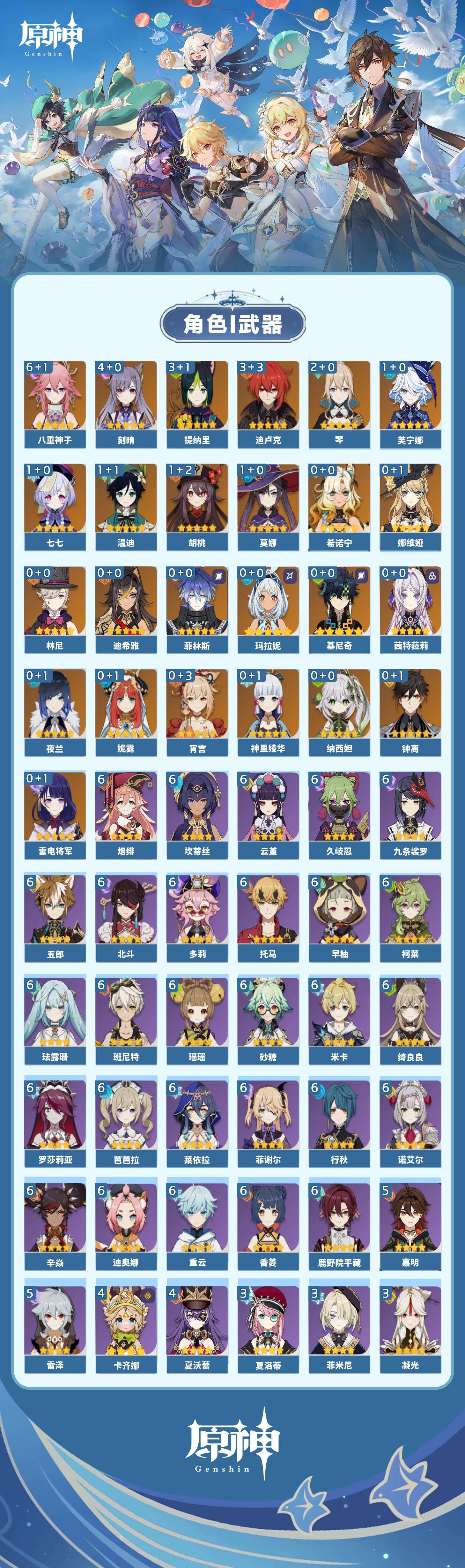 【原神】【lyys9043】冒险等级:60,五星数量:50,五星角色:八重神子 6命刻晴 4命迪卢克 3命提纳里 3命琴 2命芙宁娜 1命胡桃 1命莫娜 1命七七 1命温迪 1命玛拉妮基尼奇希诺宁神里绫华茜特菈莉宵宫迪希雅钟离林尼夜兰娜维娅妮露纳西妲菲林斯雷电将军__五星武器:飞雷之弦振 3精狼的末路 3精四风原典 3精天空之傲 3精阿莫斯之弓 2精和璞鸢 2精护摩之杖 2精焚曜千阳万世流涌大典裁断有乐御簾切赤月之形风鹰剑磐岩结绿天空之卷天空之刃雾切之回光薙草之稻光终末嗟叹之诗息灾神乐之真意贯虹之槊若水猎人之径圣显之钥__四星角色:班尼特 6命行秋 6命九条裟罗 6命香菱 6命久岐忍 6命鹿野院平藏 6命珐露珊 6命迪奥娜 6命砂糖 6命绮良良 6命瑶瑶 6命莱依拉 6命米卡 6命坎蒂丝 6命多莉 6命柯莱 6命芭芭拉 6命云堇 6命早柚 6命托马 6命五郎 6命烟绯 6命重云 6命辛焱 6命诺艾尔 6命罗莎莉亚 6命菲谢尔 6命北斗 6命雷泽 5命嘉明 5命卡齐娜 4命夏沃蕾 4命凝光 3命菲米尼 3命夏洛蒂 3命卡维 2命琳妮特 2命欧洛伦 1命蓝砚伊安珊塔利雅