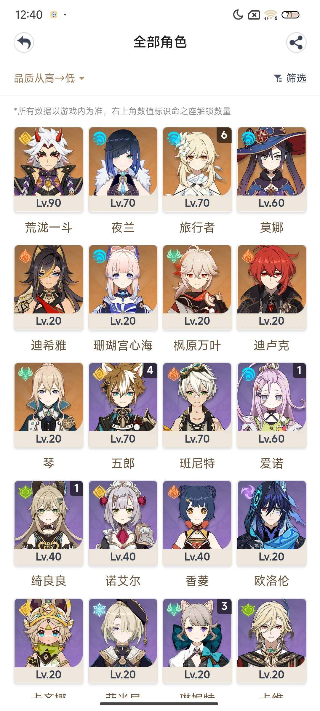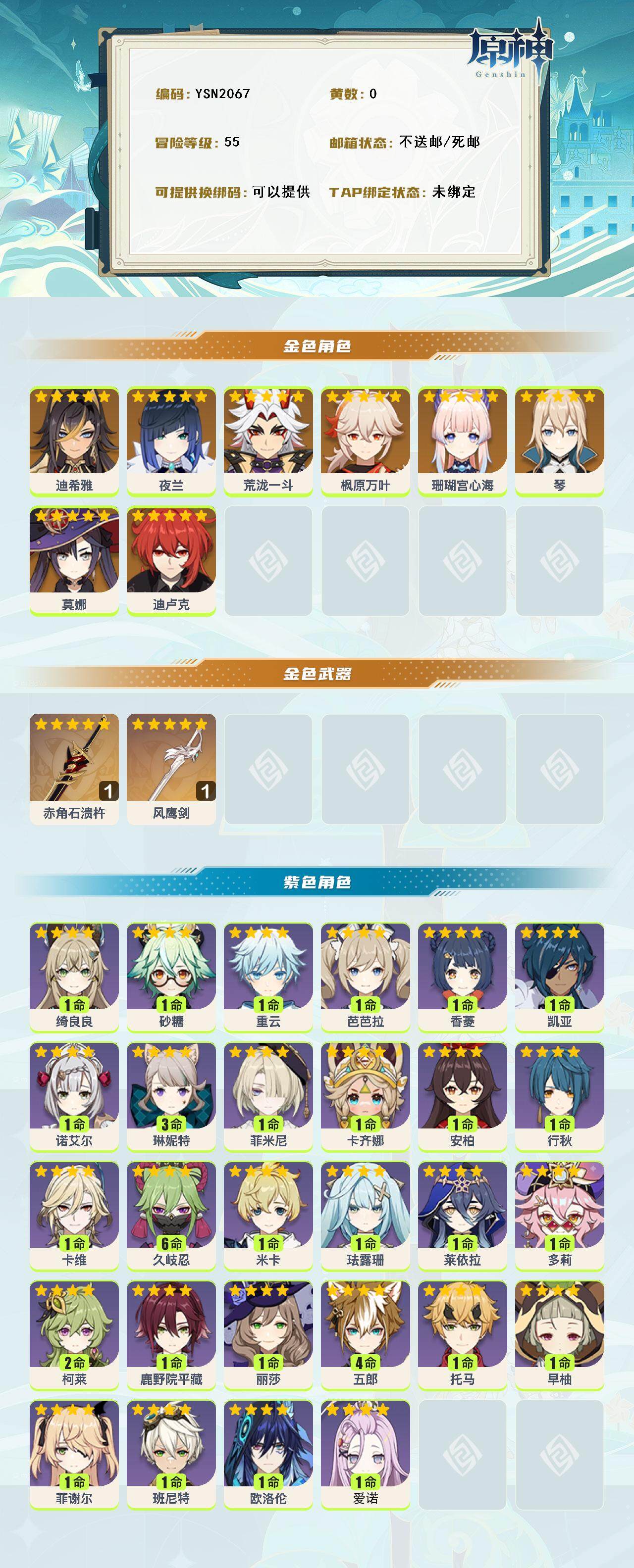 【ysn2067】55级/女主/9个五星角色/0命迪希雅/0命夜兰/0命荒泷一斗/0命珊瑚宫心海/0命枫原万叶/0命琴/0命迪卢克/0命莫娜/精1赤角石溃杵/精1风鹰剑/1命爱诺/0命欧洛伦/0命卡齐娜/0命菲米尼/3命琳妮特/1命绮良良/0命卡维/0命米卡/0命珐露珊/0命莱依拉/1命多莉/2命柯莱/0命鹿野院平藏/满命久岐忍/4命五郎/1命托马/0命早柚/0命砂糖/0命菲谢尔/0命丽莎/0命香菱/0命安柏/0命班尼特/1命行秋/0命芭芭拉/0命诺艾尔/1命凯亚/0命重云