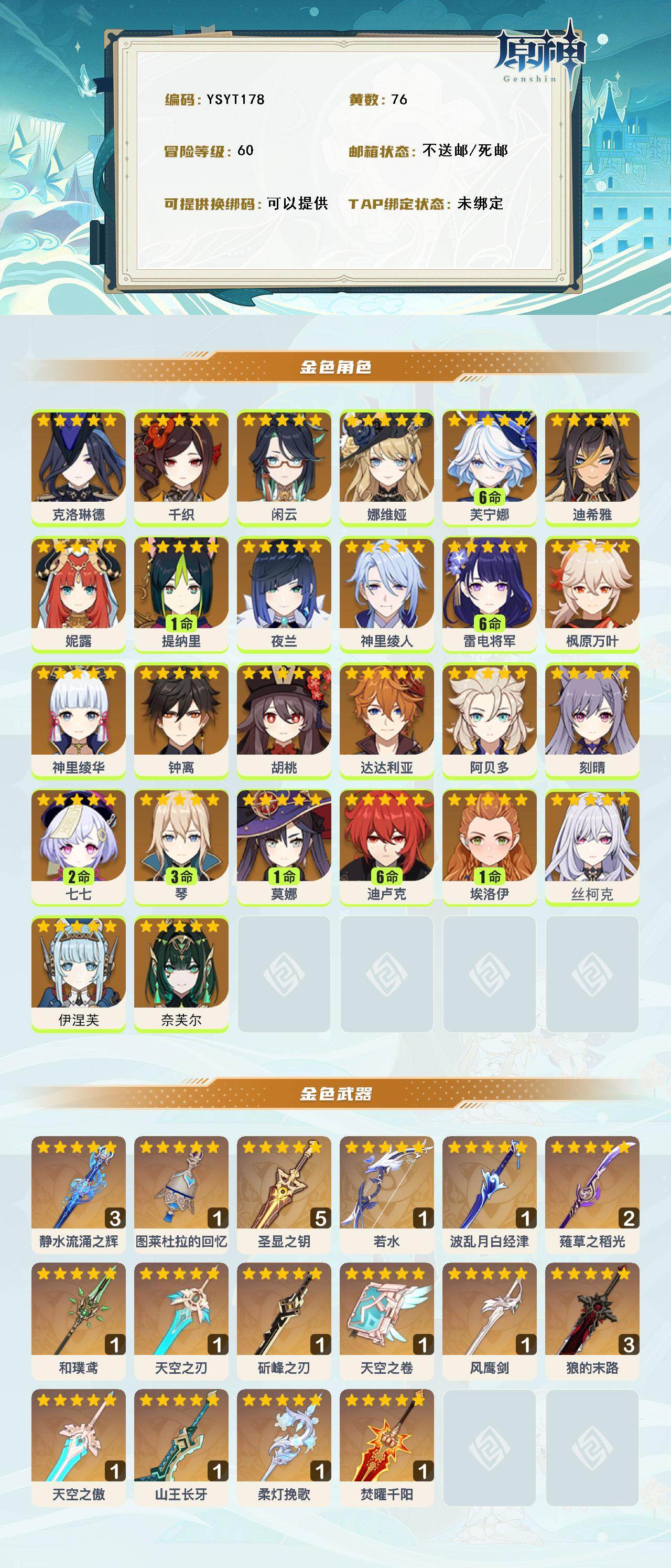 【ysyt178】60级/76黄/女主/26个五星角色/16个五星武器/满命雷电将军/满命芙宁娜/0命夜兰/0命丝柯克/满命迪卢克/0命千织/0命娜维娅/0命钟离/0命闲云/0命枫原万叶/3命琴/0命神里绫华/0命伊涅芙/0命克洛琳德/0命刻晴/0命奈芙尔/0命妮露/0命神里绫人/1命莫娜/0命达达利亚/0命迪希雅/0命胡桃/0命阿贝多/2命七七/0命埃洛伊/1命提纳里/精1若水/精1图莱杜拉的回忆/精1天空之卷/精2薙草之稻光/精1和璞鸢/精1焚曜千阳/精3狼的末路/精3静水流涌之辉/精5圣显之钥/精1波乱月白经津/精1斫峰之刃/精1天空之刃/精1柔灯挽歌/精1山王长牙/精1风鹰剑/精1天空之傲