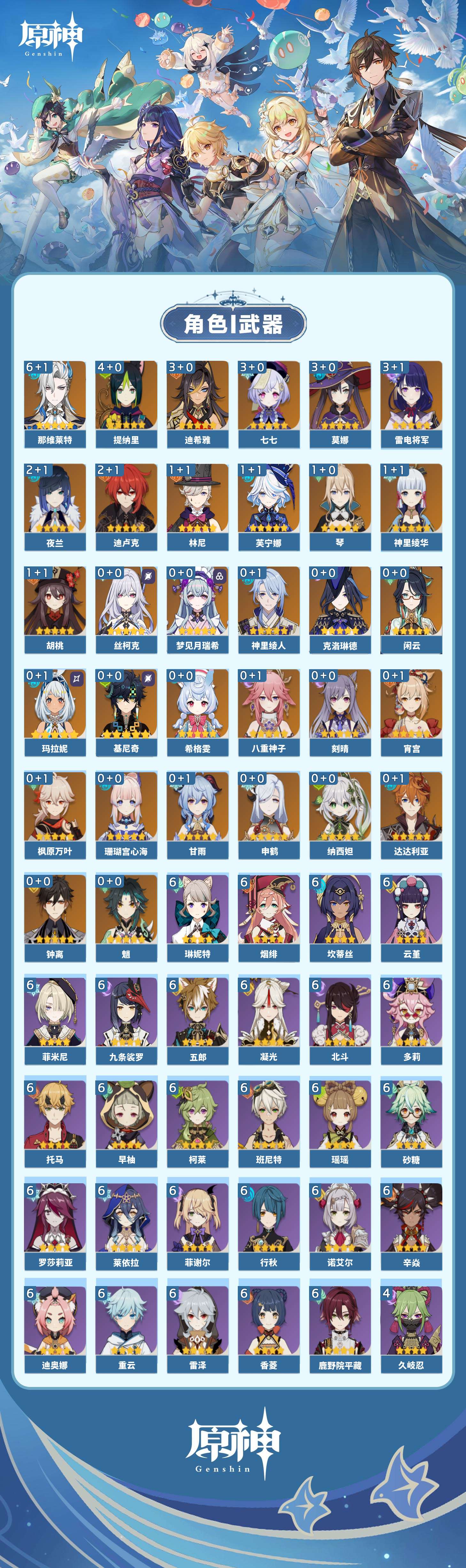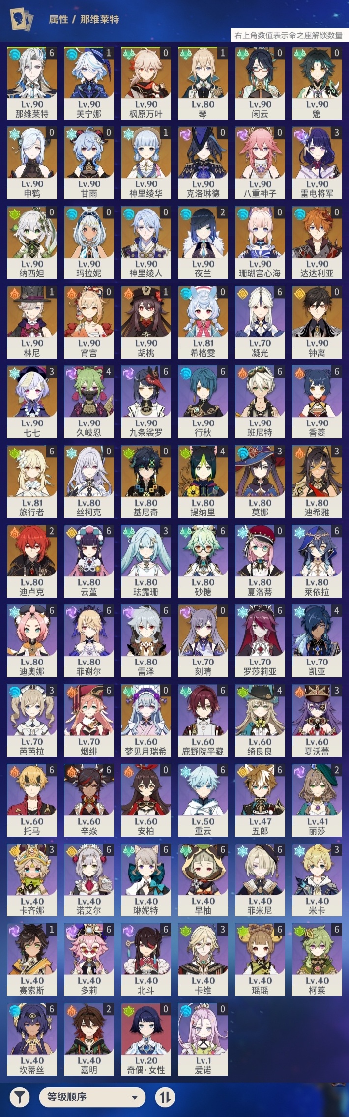 【原神】【lyys9086】冒险等级:60,五星数量:54,五星角色:那维莱特 6命提纳里 4命迪希雅 3命雷电将军 3命莫娜 3命七七 3命迪卢克 2命夜兰 2命林尼 1命芙宁娜 1命胡桃 1命琴 1命神里绫华 1命玛拉妮基尼奇珊瑚宫心海宵宫钟离达达利亚梦见月瑞希申鹤八重神子神里绫人闲云丝柯克纳西妲枫原万叶甘雨魈克洛琳德希格雯刻晴__五星武器:风鹰剑 2精冲浪时光最初的大魔术万世流涌大典静水流涌之辉阿莫斯之弓苍古自由之誓飞雷之弦振护摩之杖狼的末路四风原典天空之傲天空之脊天空之刃雾切之回光薙草之稻光斫峰之刃冬极白星神乐之真意波乱月白经津若水__四星角色:班尼特 6命行秋 6命九条裟罗 6命香菱 6命鹿野院平藏 6命凝光 6命迪奥娜 6命砂糖 6命瑶瑶 6命莱依拉 6命坎蒂丝 6命多莉 6命柯莱 6命云堇 6命早柚 6命托马 6命五郎 6命烟绯 6命重云 6命辛焱 6命诺艾尔 6命罗莎莉亚 6命雷泽 6命菲谢尔 6命北斗 6命菲米尼 6命琳妮特 6命久岐忍 4命绮良良 4命卡齐娜 3命珐露珊 3命米卡 3命卡维 3命芭芭拉 3命夏沃蕾 3命嘉明 2命赛索斯 1命奇偶·女性夏洛蒂爱诺