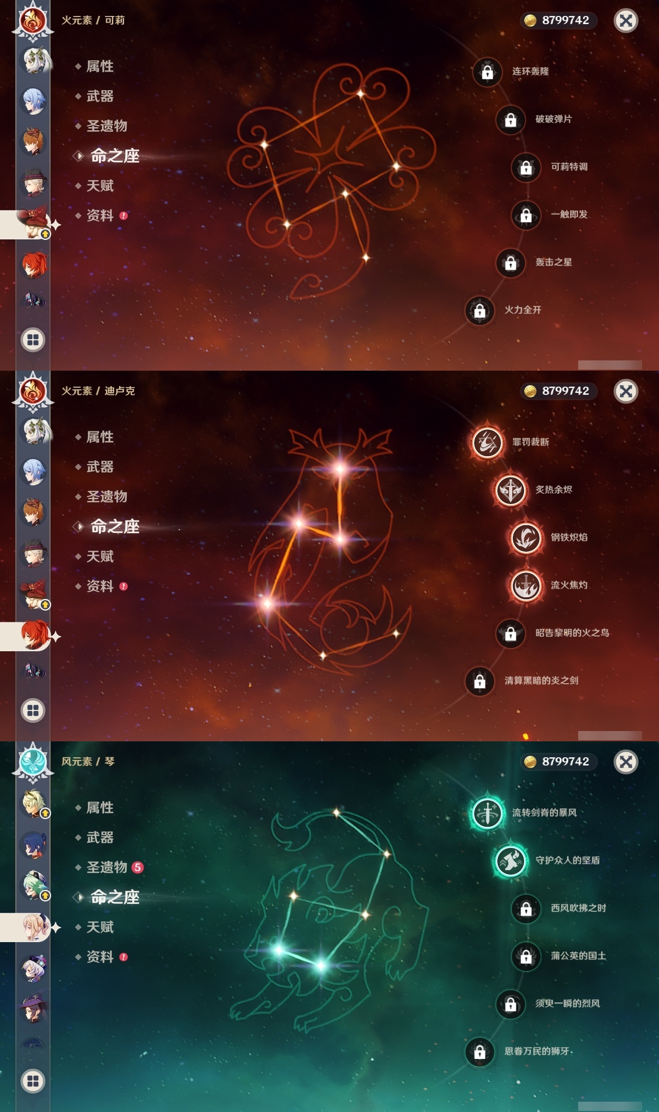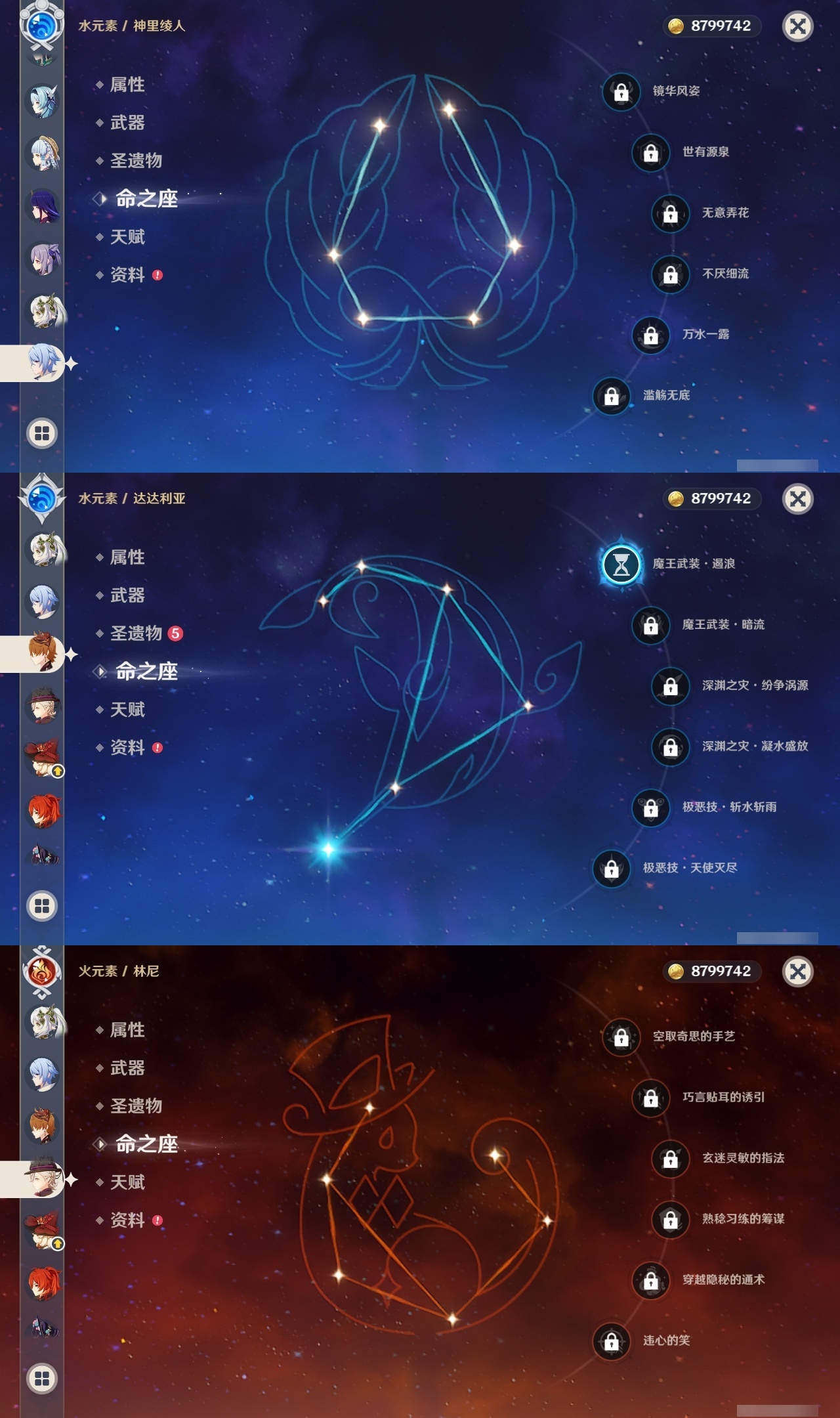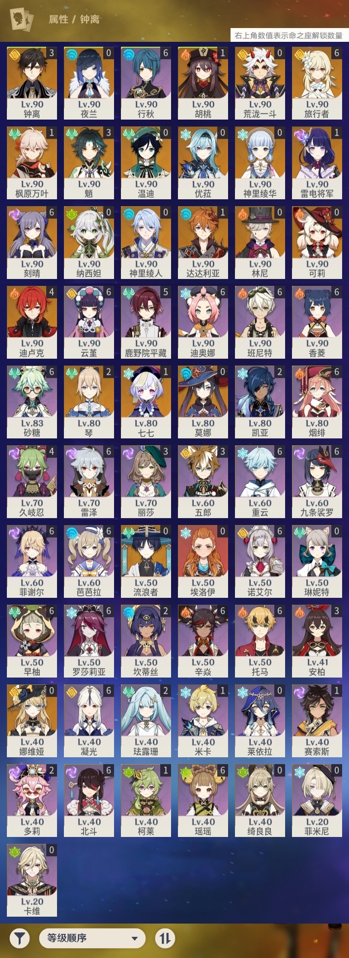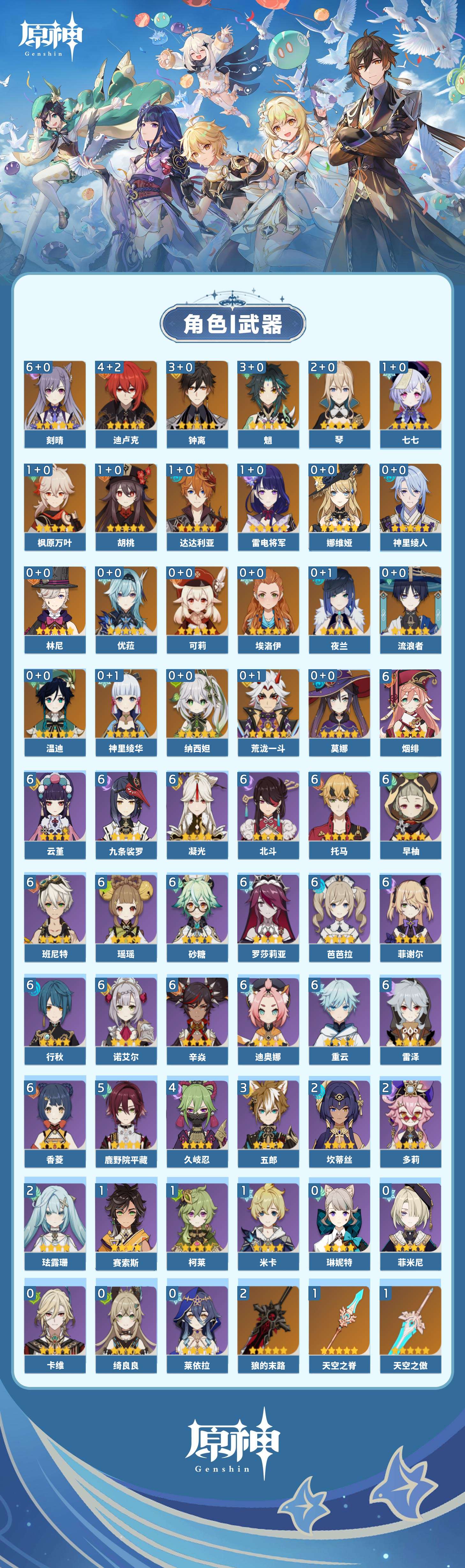 【原神】【lyys9085】冒险等级:60,五星数量:34,五星角色:刻晴 6命迪卢克 4命魈 3命钟离 3命琴 2命达达利亚 1命枫原万叶 1命胡桃 1命雷电将军 1命七七 1命莫娜神里绫华温迪优菈荒泷一斗神里绫人林尼夜兰娜维娅纳西妲流浪者可莉__五星武器:狼的末路 2精裁叶萃光阿莫斯之弓磐岩结绿天空之傲天空之脊天空之卷天空之刃雾切之回光赤角石溃杵若水__四星角色:班尼特 6命行秋 6命九条裟罗 6命香菱 6命凝光 6命迪奥娜 6命砂糖 6命瑶瑶 6命芭芭拉 6命云堇 6命早柚 6命托马 6命烟绯 6命重云 6命辛焱 6命诺艾尔 6命罗莎莉亚 6命雷泽 6命菲谢尔 6命北斗 6命鹿野院平藏 5命久岐忍 4命五郎 3命珐露珊 2命坎蒂丝 2命多莉 2命米卡 1命柯莱 1命赛索斯 1命埃洛伊绮良良莱依拉卡维菲米尼琳妮特