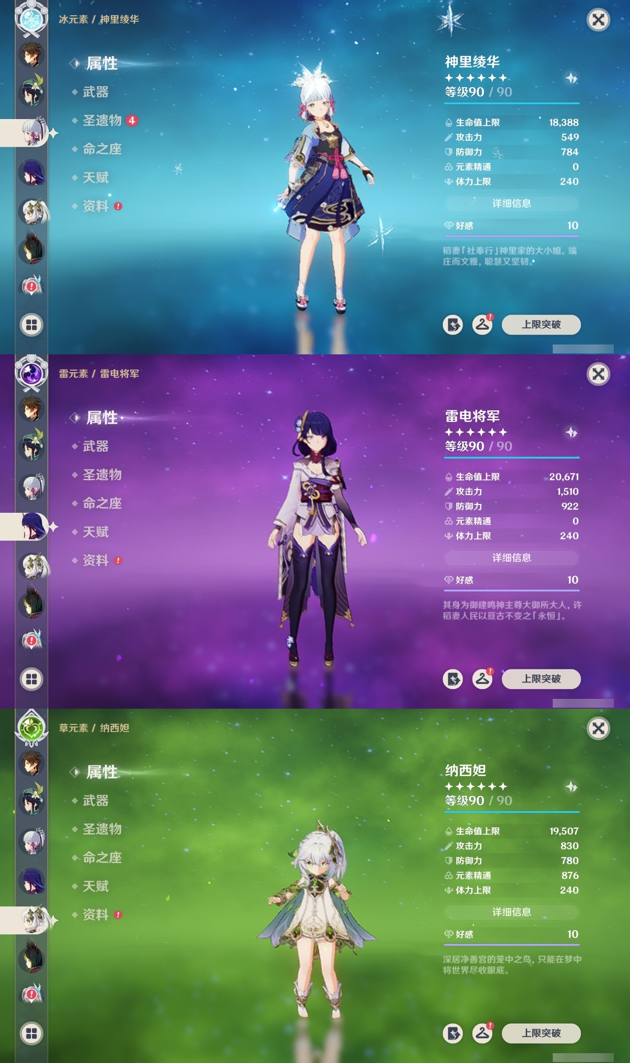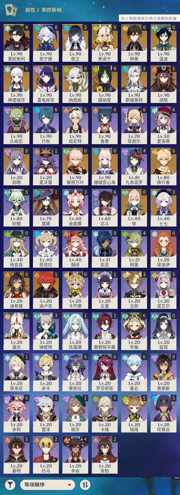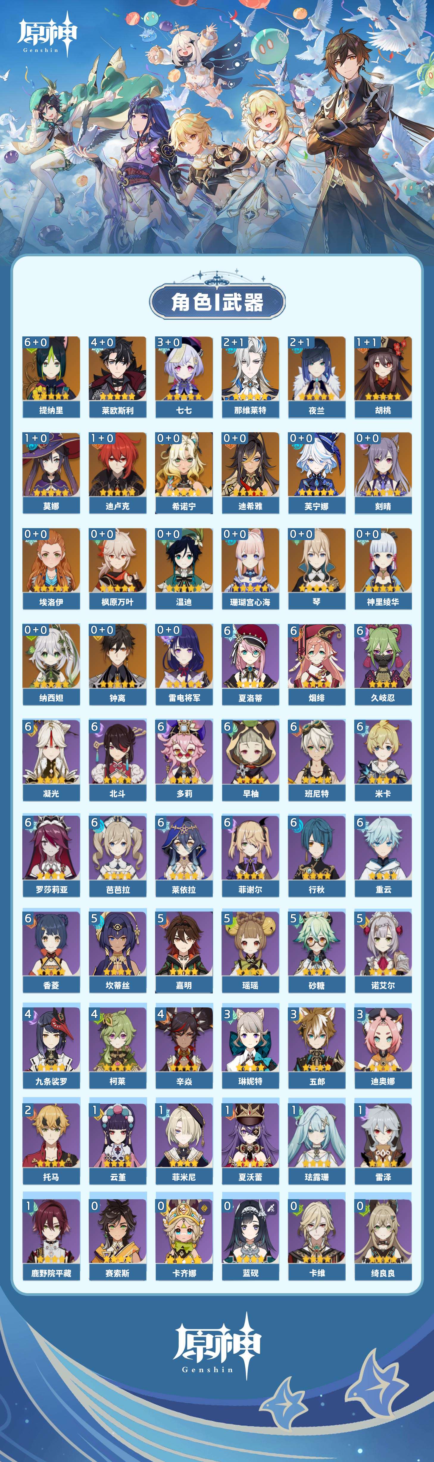 【原神】【lyys9075】冒险等级:60,五星数量:28,五星角色:提纳里 6命莱欧斯利 4命七七 3命那维莱特 2命夜兰 2命迪卢克 1命胡桃 1命莫娜 1命琴珊瑚宫心海希诺宁神里绫华温迪迪希雅钟离芙宁娜纳西妲枫原万叶刻晴雷电将军__五星武器:和璞鸢 3精风鹰剑 2精万世流涌大典阿莫斯之弓护摩之杖天空之脊若水__四星角色:班尼特 6命行秋 6命香菱 6命久岐忍 6命凝光 6命莱依拉 6命米卡 6命多莉 6命芭芭拉 6命早柚 6命烟绯 6命重云 6命罗莎莉亚 6命菲谢尔 6命北斗 6命夏洛蒂 6命砂糖 5命瑶瑶 5命坎蒂丝 5命诺艾尔 5命嘉明 5命九条裟罗 4命柯莱 4命辛焱 4命迪奥娜 3命五郎 3命琳妮特 3命托马 2命鹿野院平藏 1命珐露珊 1命云堇 1命雷泽 1命菲米尼 1命夏沃蕾 1命埃洛伊卡齐娜绮良良卡维蓝砚赛索斯