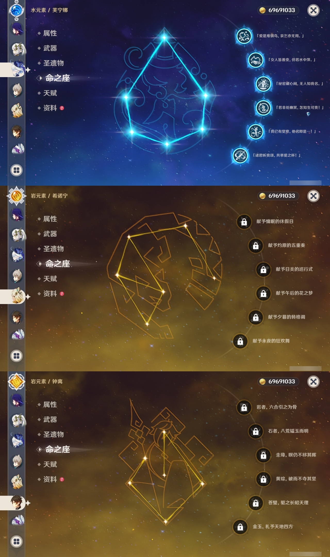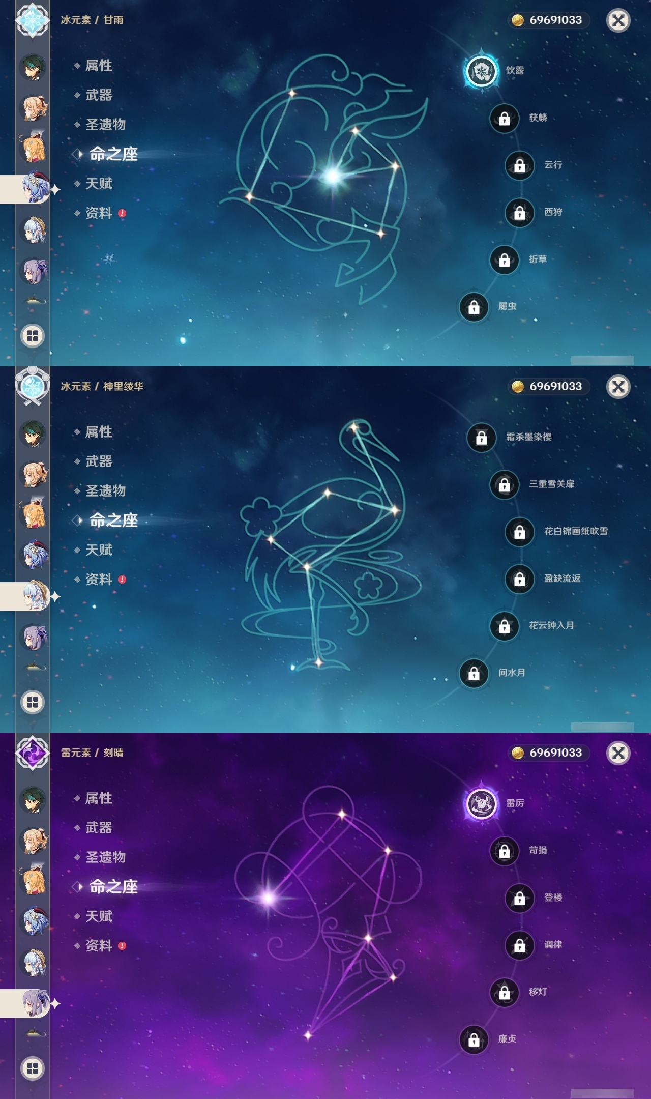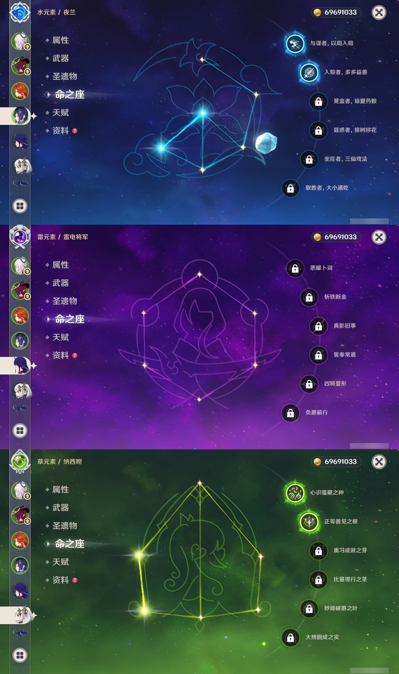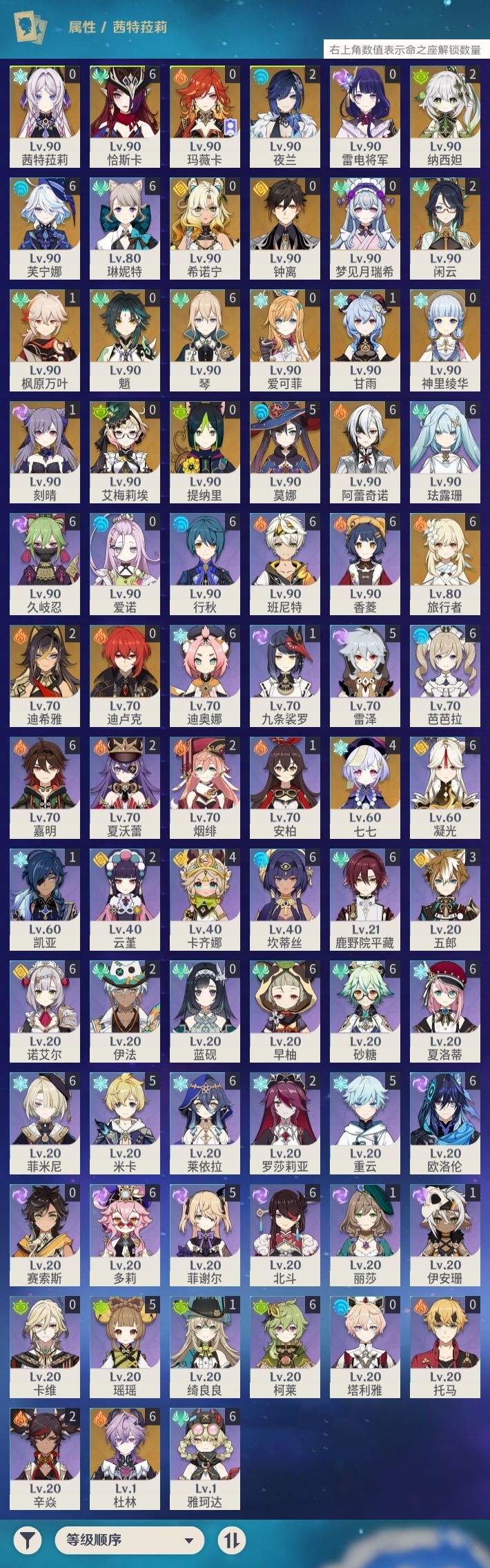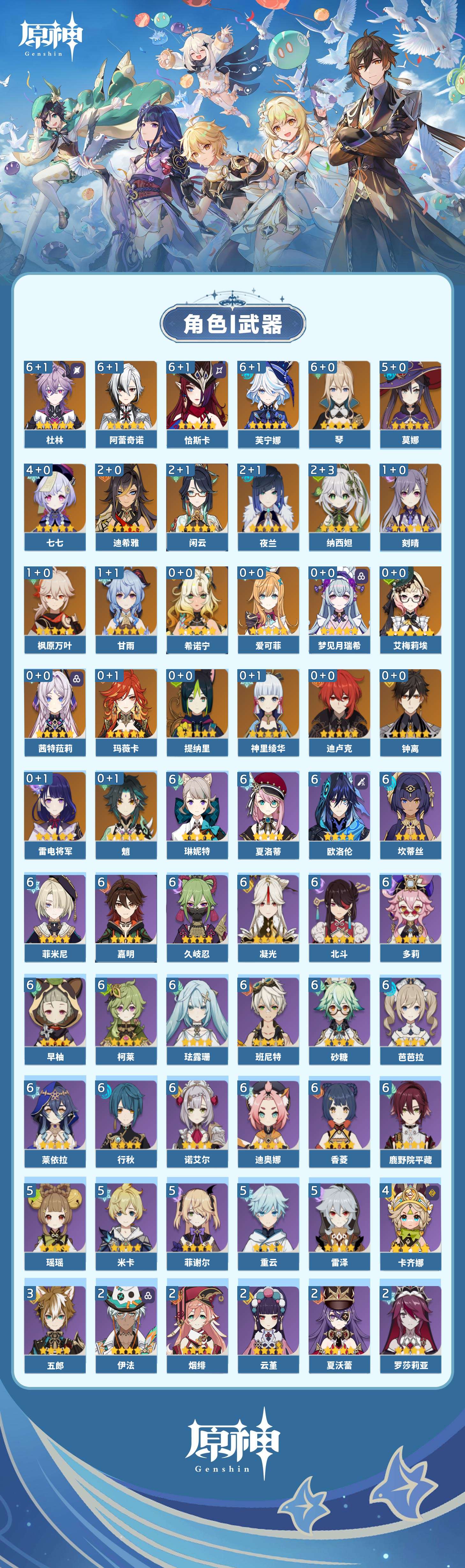 【原神】【lyys8385】冒险等级:60,五星数量:42,五星角色:恰斯卡 6命芙宁娜 6命阿蕾奇诺 6命杜林 6命琴 6命莫娜 5命七七 4命迪希雅 2命闲云 2命夜兰 2命纳西妲 2命枫原万叶 1命甘雨 1命刻晴 1命艾梅莉埃希诺宁神里绫华玛薇卡茜特菈莉钟离梦见月瑞希提纳里爱可菲迪卢克魈雷电将军__五星武器:千夜浮梦 3精碧落之珑星鹫赤羽焚曜千阳静水流涌之辉鹤鸣余音赤月之形黑蚀阿莫斯之弓风鹰剑和璞鸢天空之卷雾切之回光薙草之稻光息灾若水__四星角色:班尼特 6命行秋 6命香菱 6命久岐忍 6命鹿野院平藏 6命珐露珊 6命凝光 6命迪奥娜 6命砂糖 6命莱依拉 6命坎蒂丝 6命多莉 6命柯莱 6命芭芭拉 6命欧洛伦 6命早柚 6命诺艾尔 6命北斗 6命菲米尼 6命琳妮特 6命夏洛蒂 6命嘉明 6命瑶瑶 5命米卡 5命重云 5命雷泽 5命菲谢尔 5命卡齐娜 4命五郎 3命云堇 2命烟绯 2命辛焱 2命罗莎莉亚 2命夏沃蕾 2命伊法 2命九条裟罗 1命绮良良 1命伊安珊 1命卡维蓝砚托马塔利雅爱诺赛索斯