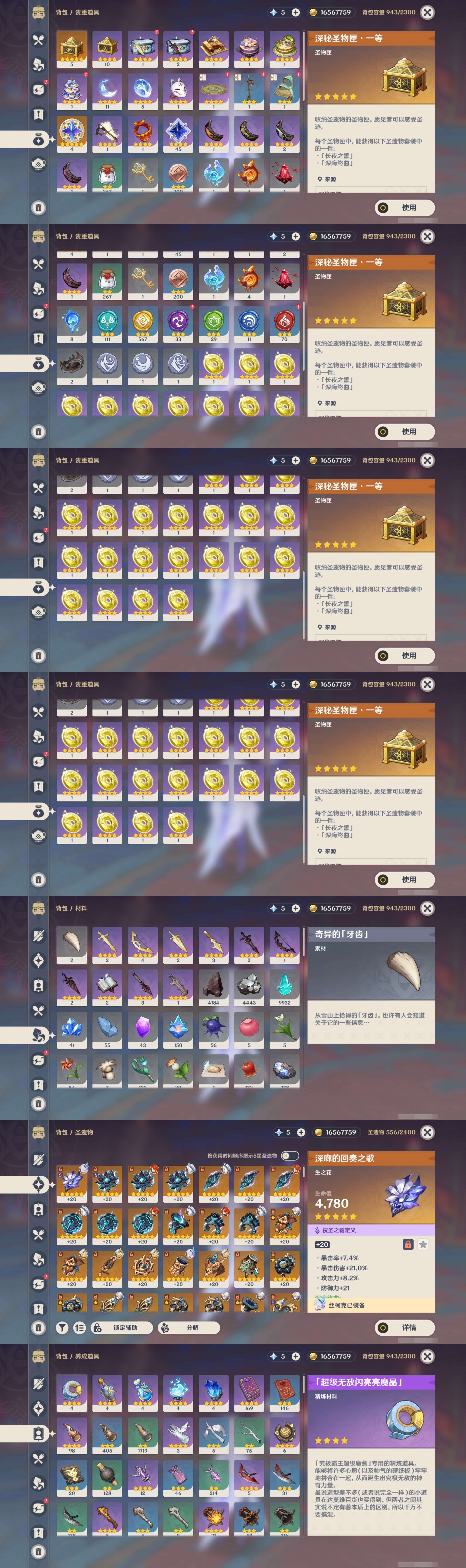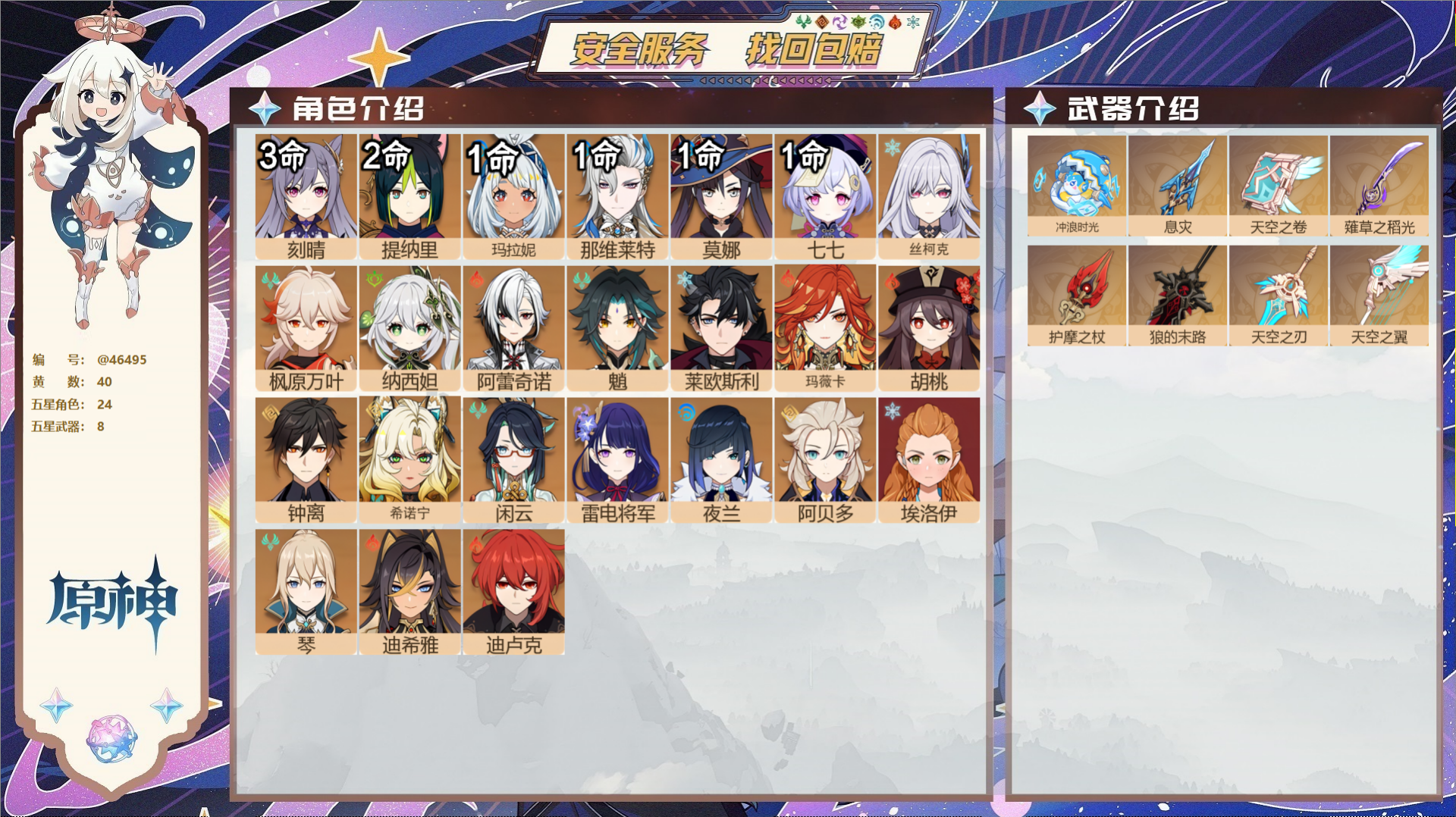 _2274565-未绑定邮箱冒险等级60级女主40黄24个五星角色8个五星武器纠缠之源0原石5圣遗物556【时装】炽绘奇旅岁夜欢哗雨化竹身叶隐芳名倩影游侠纱中幽兰 【24个五星角色】3命刻晴2命提纳里1命玛拉妮1命那维莱特1命莫娜1命七七0命丝柯克0命枫原万叶0命纳西妲0命阿蕾奇诺0命魈0命莱欧斯利0命玛薇卡0命胡桃0命钟离0命希诺宁0命闲云0命雷电将军0命夜兰0命阿贝多0命埃洛伊0命琴0命迪希雅0命迪卢克 【8个五星武器】精1冲浪时光精1息灾精1天空之卷精1薙草之稻光精1护摩之杖精1狼的末路精1天空之刃精1天空之翼6套 【时装】炽绘奇旅岁夜欢哗雨化竹身叶隐芳名倩影游侠纱中幽兰