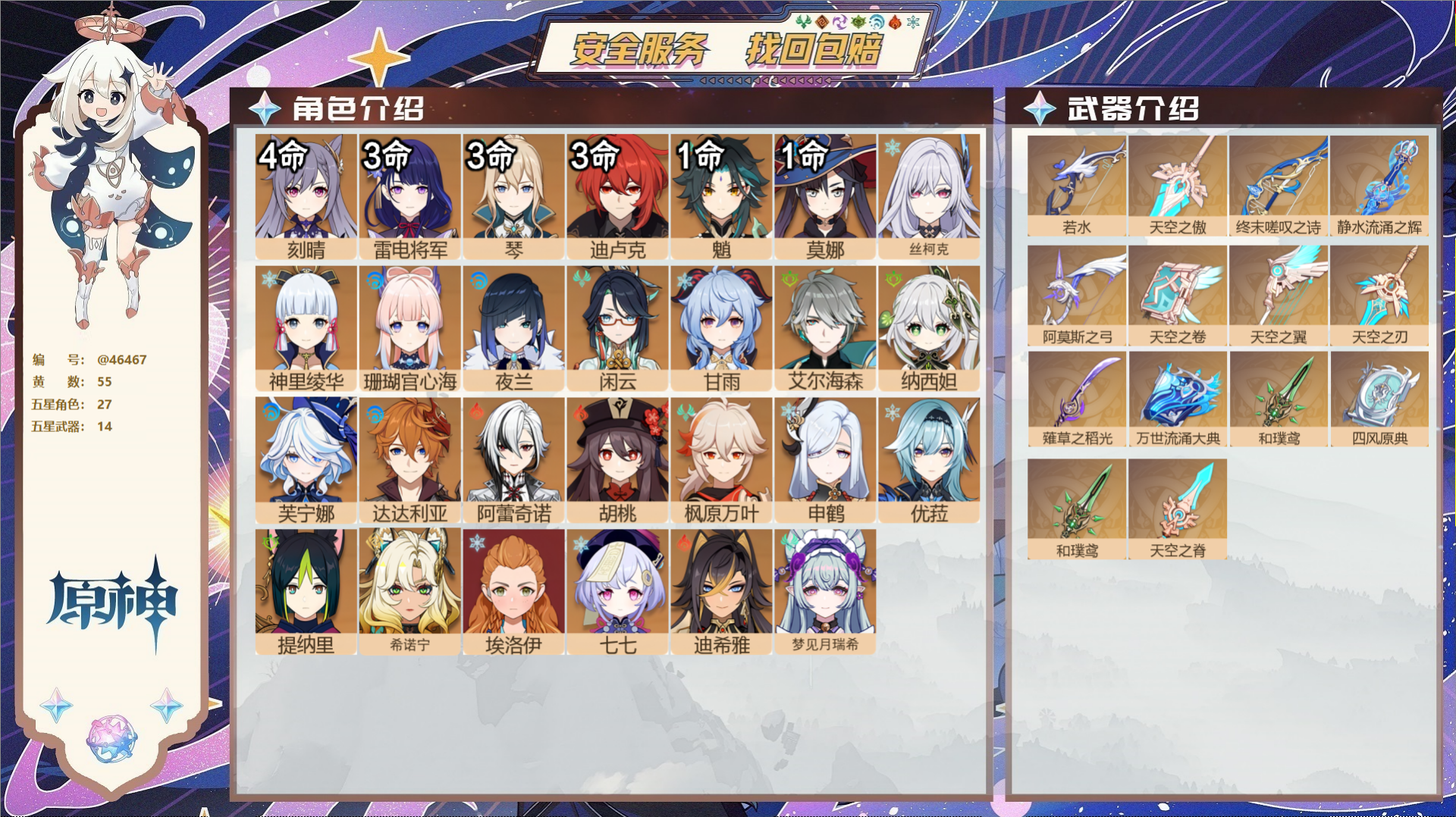_2274563-送未实名邮箱冒险等级60级女主55黄27个五星角色14个五星武器纠缠之源0原石33圣遗物378【时装】纱中幽兰玄玉瑶芳岁夜欢哗雨化竹身叶隐芳名倩影游侠帆影游风 【27个五星角色】4命刻晴3命雷电将军3命琴3命迪卢克1命魈1命莫娜0命丝柯克0命神里绫华0命珊瑚宫心海0命夜兰0命闲云0命甘雨0命艾尔海森0命纳西妲0命芙宁娜0命达达利亚0命阿蕾奇诺0命胡桃0命枫原万叶0命申鹤0命优菈0命提纳里0命希诺宁0命埃洛伊0命七七0命迪希雅0命梦见月瑞希 【14个五星武器】精1若水精1天空之傲精1终末嗟叹之诗精1静水流涌之辉精1阿莫斯之弓精1天空之卷精1天空之翼精1天空之刃精1薙草之稻光精1万世流涌大典精1和璞鸢精1四风原典精1和璞鸢精1天空之脊7套 【时装】纱中幽兰玄玉瑶芳岁夜欢哗雨化竹身叶隐芳名倩影游侠帆影游风