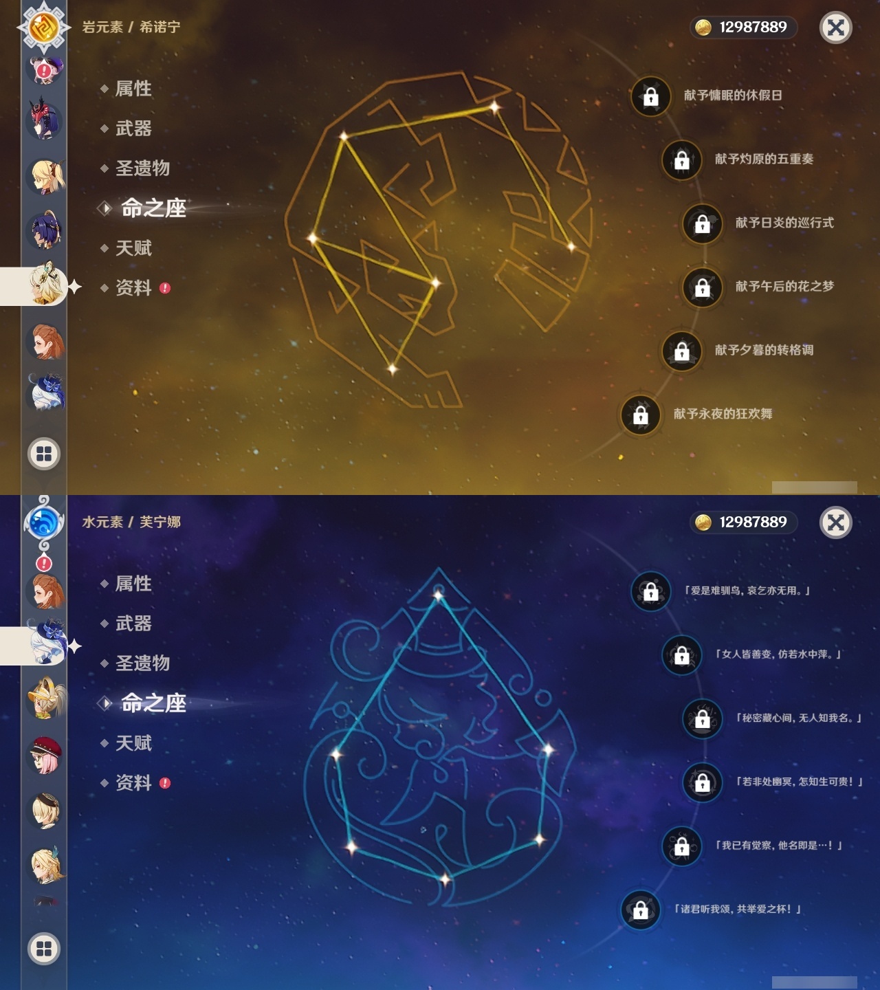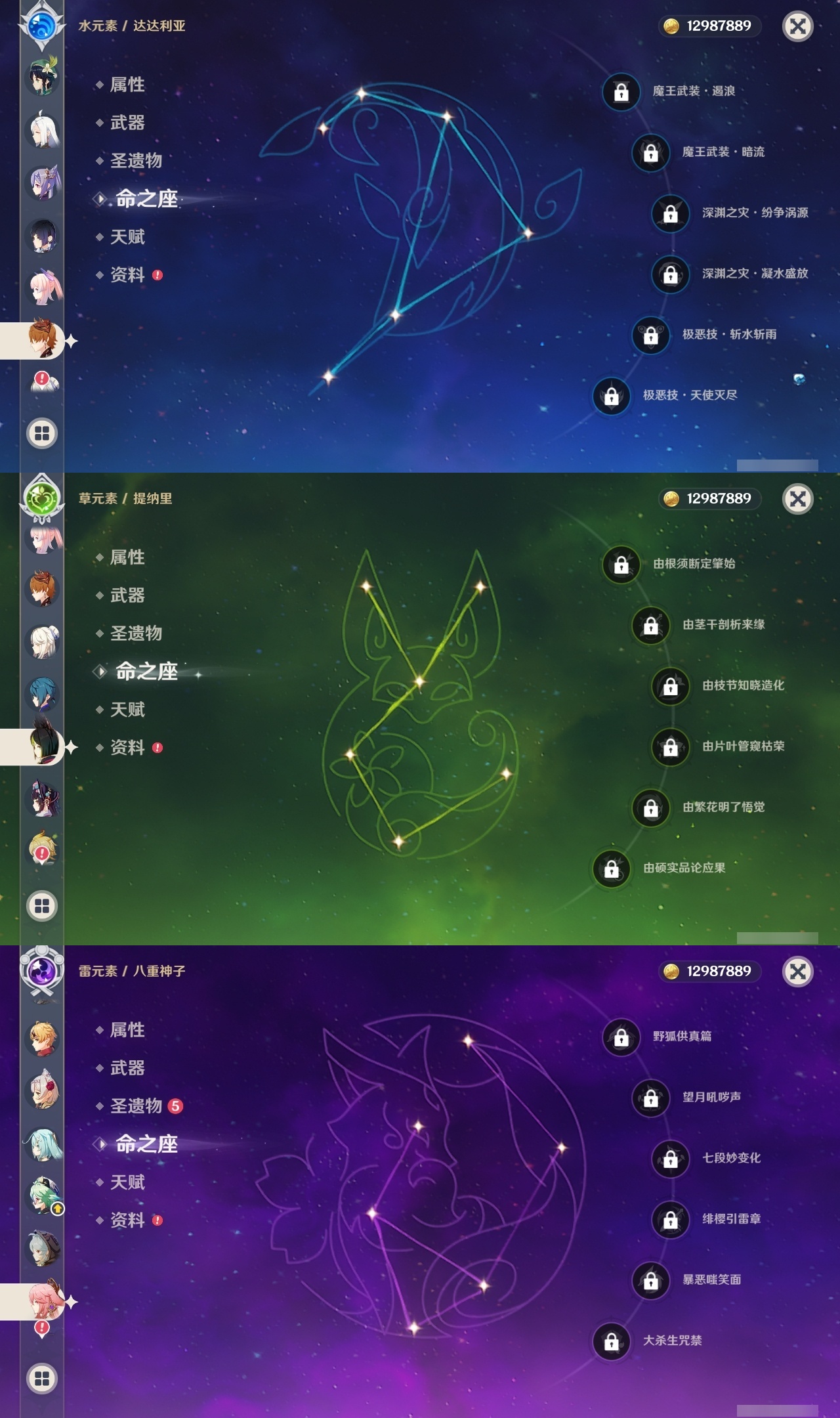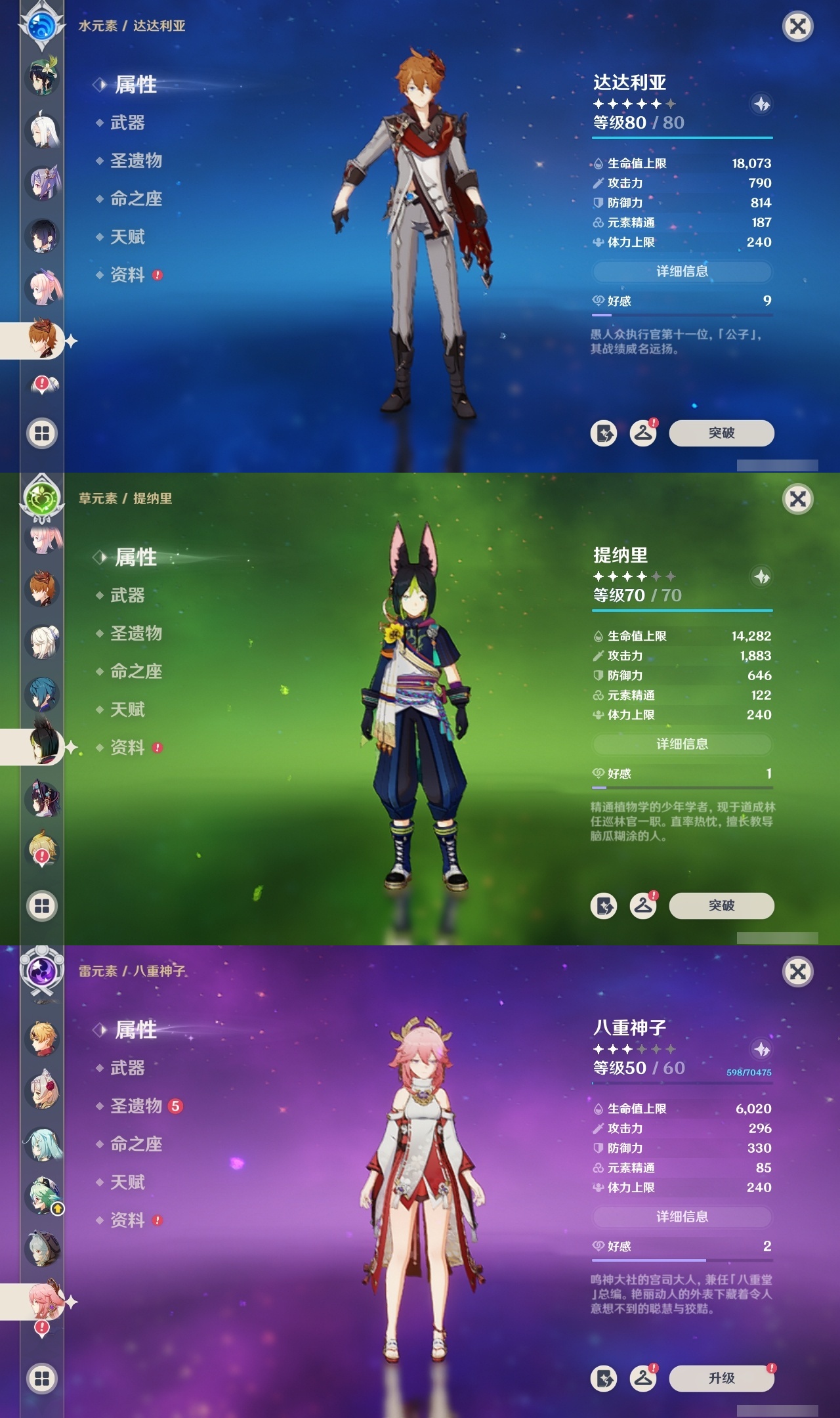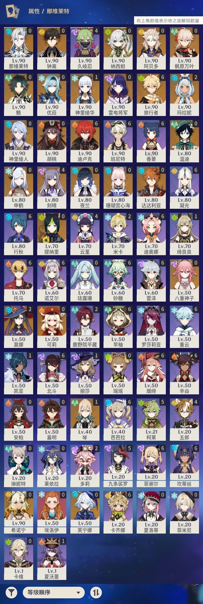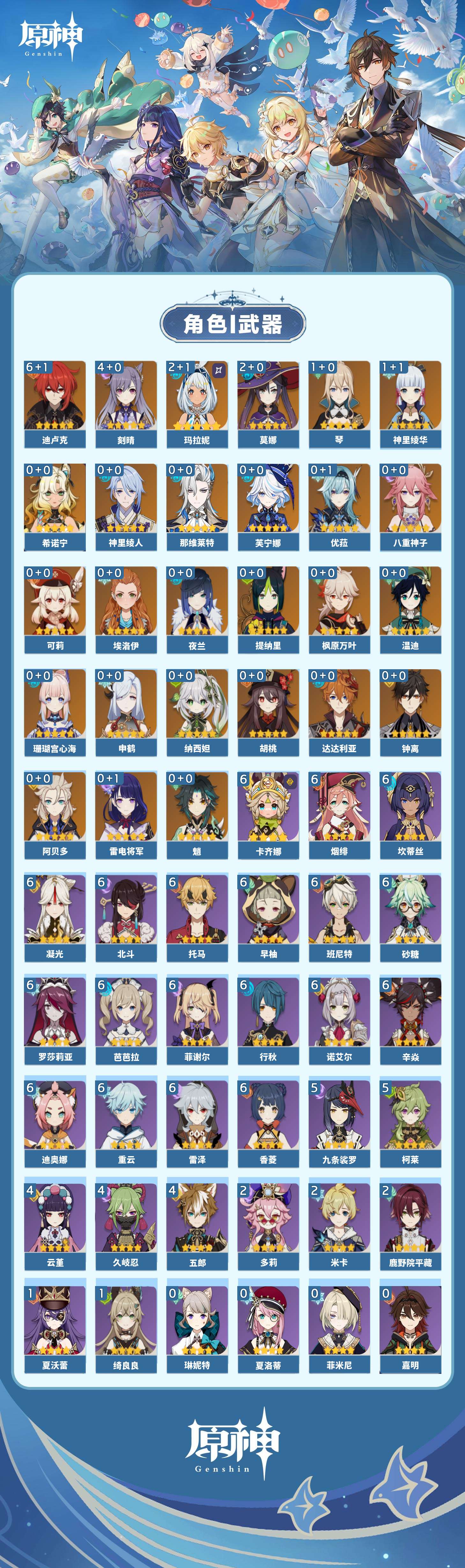 【原神】【lyys9093】冒险等级:60,五星数量:36,五星角色:迪卢克 6命刻晴 4命玛拉妮 2命莫娜 2命琴 1命神里绫华 1命珊瑚宫心海希诺宁温迪优菈钟离达达利亚申鹤八重神子神里绫人阿贝多那维莱特夜兰芙宁娜提纳里纳西妲枫原万叶魈胡桃可莉雷电将军__五星武器:冲浪时光飞雷之弦振狼的末路磐岩结绿松籁响起之时天空之脊天空之刃雾切之回光薙草之稻光__四星角色:卡齐娜 6命班尼特 6命行秋 6命香菱 6命凝光 6命迪奥娜 6命砂糖 6命坎蒂丝 6命芭芭拉 6命早柚 6命托马 6命烟绯 6命重云 6命辛焱 6命诺艾尔 6命罗莎莉亚 6命雷泽 6命菲谢尔 6命北斗 6命九条裟罗 5命柯莱 5命久岐忍 4命云堇 4命五郎 4命鹿野院平藏 2命米卡 2命多莉 2命绮良良 1命夏沃蕾 1命埃洛伊珐露珊瑶瑶莱依拉卡维菲米尼琳妮特夏洛蒂嘉明