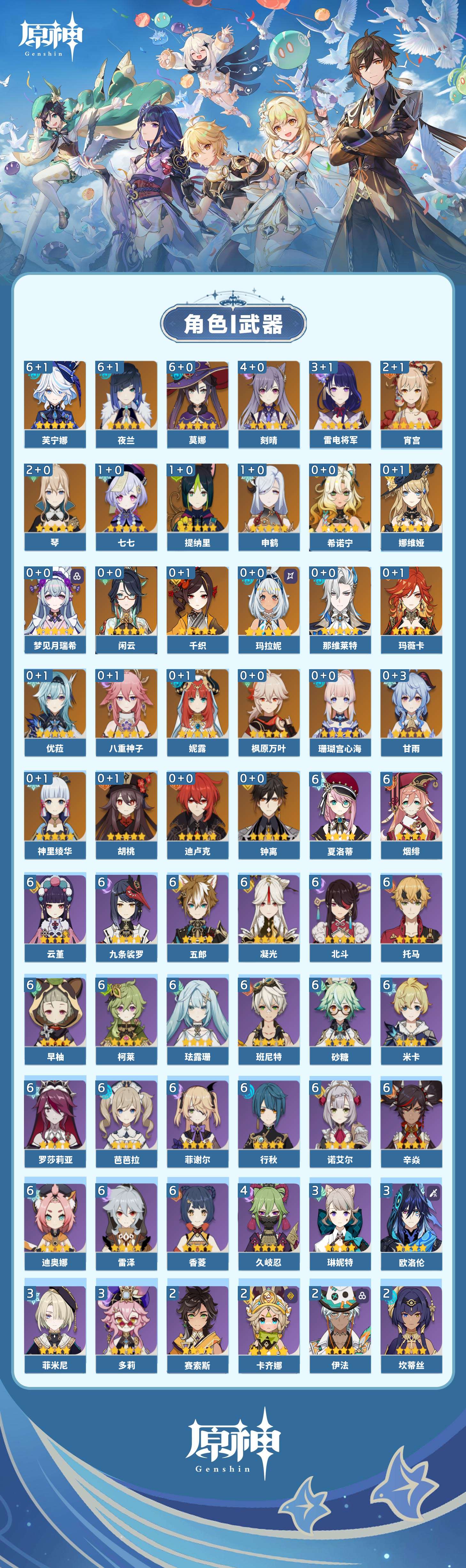 【原神】满命,冒险等级:60,五星数量:51,五星角色:芙宁娜 6命莫娜 6命夜兰 6命刻晴 4命雷电将军 3命琴 2命宵宫 2命七七 1命申鹤 1命提纳里 1命玛拉妮珊瑚宫心海希诺宁神里绫华玛薇卡优菈钟离梦见月瑞希八重神子那维莱特娜维娅闲云千织妮露迪卢克枫原万叶甘雨胡桃__五星武器:阿莫斯之弓 3精四风原典 2精天空之傲 2精无工之剑 2精碧落之珑焚曜千阳静水流涌之辉裁断有乐御簾切飞雷之弦振和璞鸢护摩之杖磐岩结绿松籁响起之时天空之脊天空之卷天空之刃雾切之回光薙草之稻光神乐之真意若水圣显之钥__四星角色:班尼特 6命行秋 6命九条裟罗 6命香菱 6命珐露珊 6命凝光 6命迪奥娜 6命砂糖 6命米卡 6命柯莱 6命芭芭拉 6命云堇 6命早柚 6命托马 6命五郎 6命烟绯 6命辛焱 6命诺艾尔 6命罗莎莉亚 6命雷泽 6命菲谢尔 6命北斗 6命夏洛蒂 6命久岐忍 4命多莉 3命欧洛伦 3命菲米尼 3命琳妮特 3命卡齐娜 2命鹿野院平藏 2命绮良良 2命瑶瑶 2命莱依拉 2命坎蒂丝 2命嘉明 2命伊法 2命赛索斯 2命卡维 1命重云 1命夏沃蕾 1命爱诺 1命奇偶·女性伊安珊