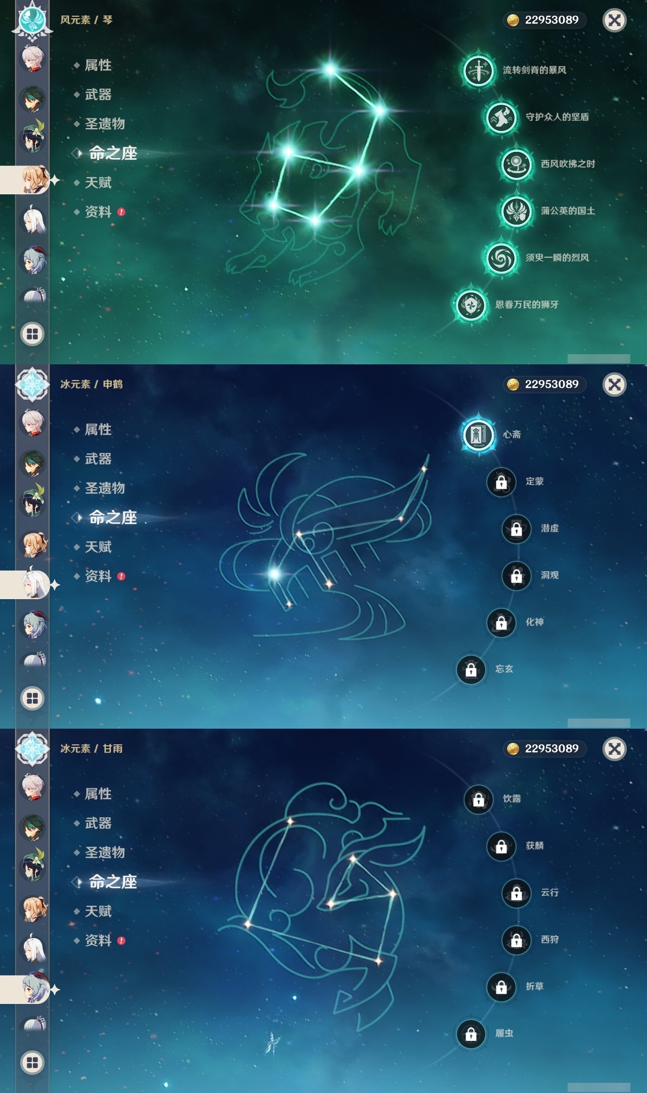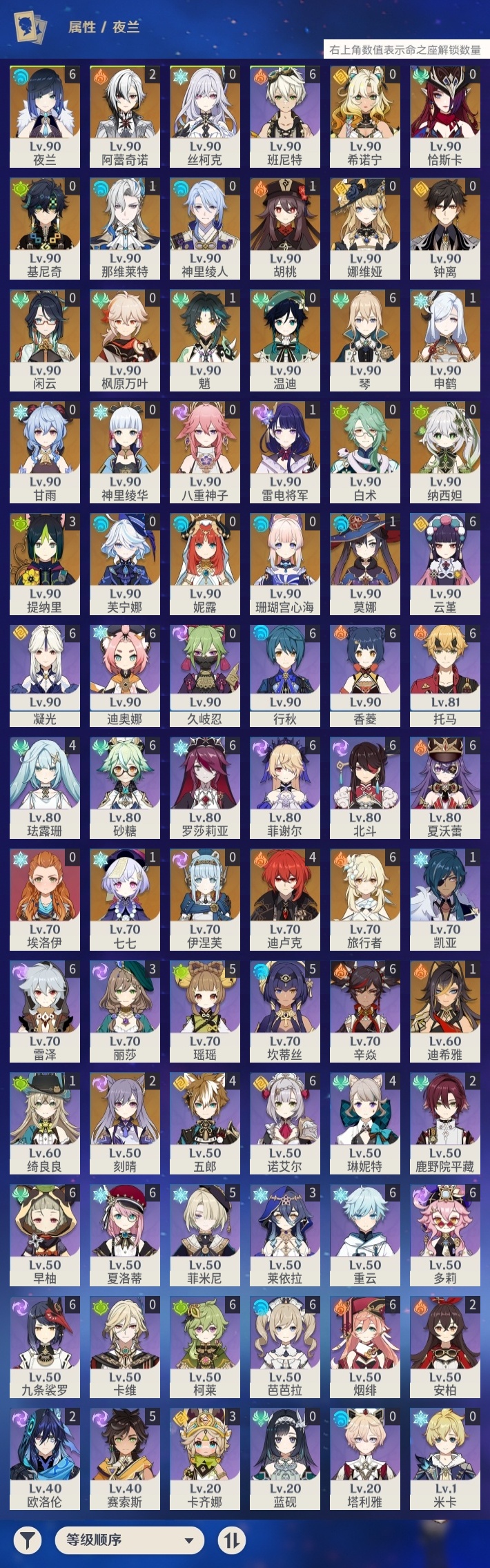 【原神】【lyys9140】冒险等级:60,五星数量:53,五星角色:琴 6命夜兰 6命迪卢克 4命提纳里 3命阿蕾奇诺 2命刻晴 2命迪希雅 1命那维莱特 1命魈 1命胡桃 1命雷电将军 1命莫娜 1命七七 1命申鹤 1命基尼奇珊瑚宫心海希诺宁白术神里绫华温迪恰斯卡钟离八重神子神里绫人芙宁娜娜维娅闲云丝柯克妮露伊涅芙纳西妲枫原万叶甘雨__五星武器:阿莫斯之弓 2精薙草之稻光 2精若水 2精山王长牙最初的大魔术万世流涌大典静水流涌之辉赤月之形苍耀尘世之锁和璞鸢护摩之杖四风原典天空之傲天空之刃雾切之回光息灾波乱月白经津猎人之径__四星角色:班尼特 6命行秋 6命九条裟罗 6命香菱 6命凝光 6命迪奥娜 6命砂糖 6命多莉 6命柯莱 6命芭芭拉 6命云堇 6命早柚 6命托马 6命烟绯 6命重云 6命辛焱 6命诺艾尔 6命罗莎莉亚 6命雷泽 6命菲谢尔 6命北斗 6命夏洛蒂 6命夏沃蕾 6命瑶瑶 5命坎蒂丝 5命菲米尼 5命赛索斯 5命珐露珊 4命五郎 4命琳妮特 4命卡齐娜 3命莱依拉 3命鹿野院平藏 2命欧洛伦 2命绮良良 1命埃洛伊久岐忍米卡卡维蓝砚塔利雅